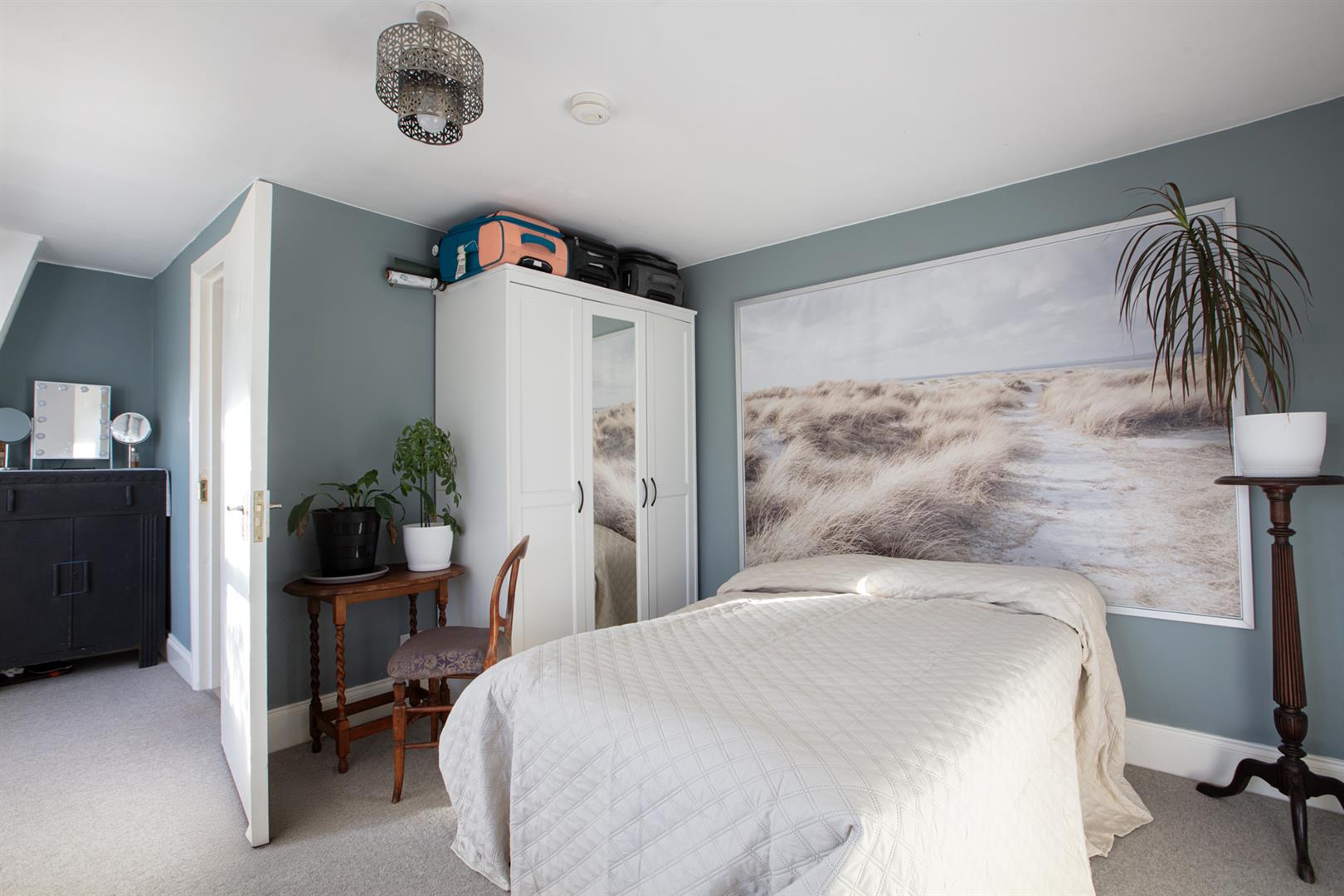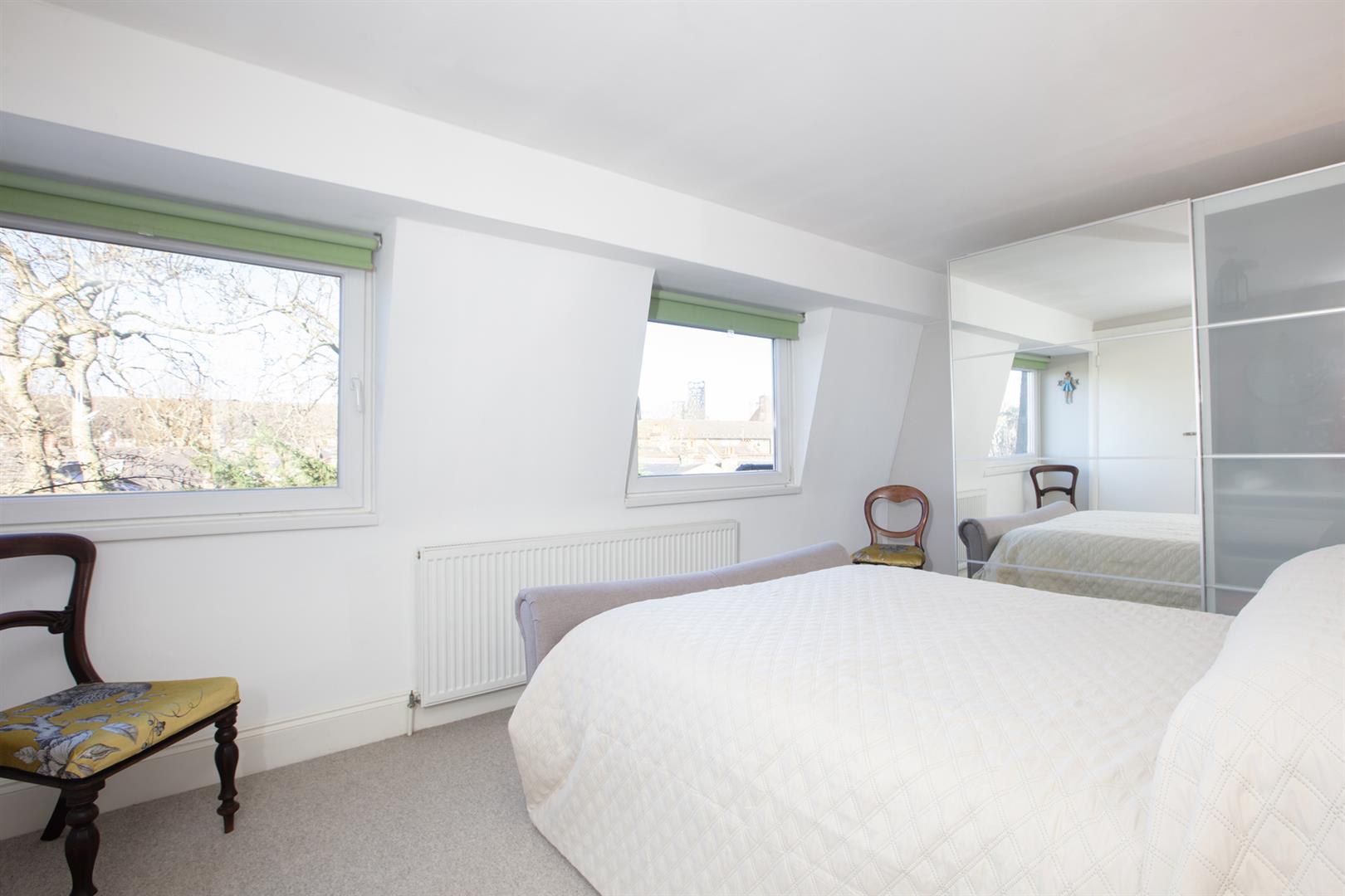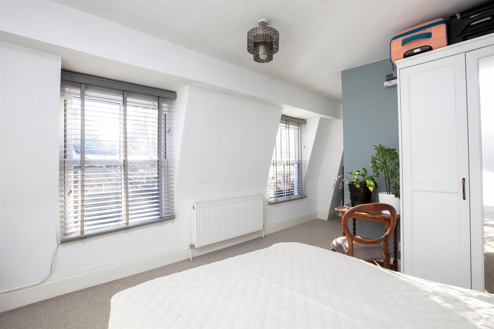 Handy understairs storage will house the Dyson and you'll notice the treads of all the stairs have been repainted in F&B's 'Skylight'. Upward to the second floor you find a wide front-facing double bedroom where two sash windows each offer space outside for greenery. There's a lovely splash of 'Oval Room Blue' on the walls. The second, even bigger double bedroom enjoys a lofty aspect through two wide casement windows. You can even spy the Shard!