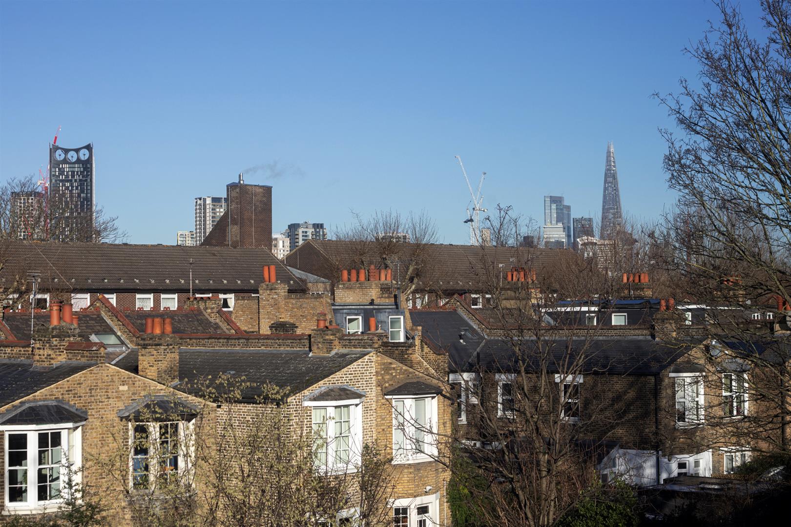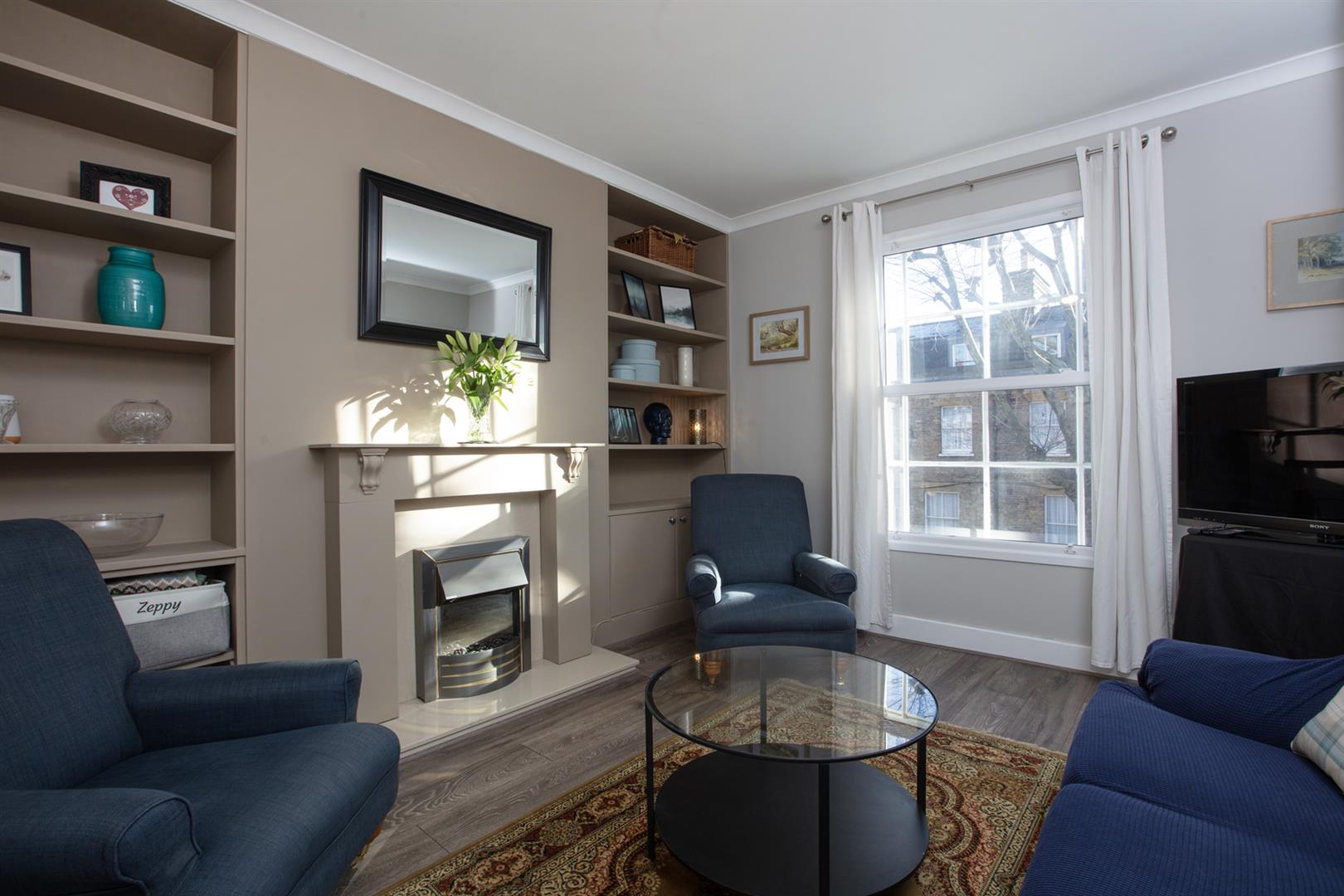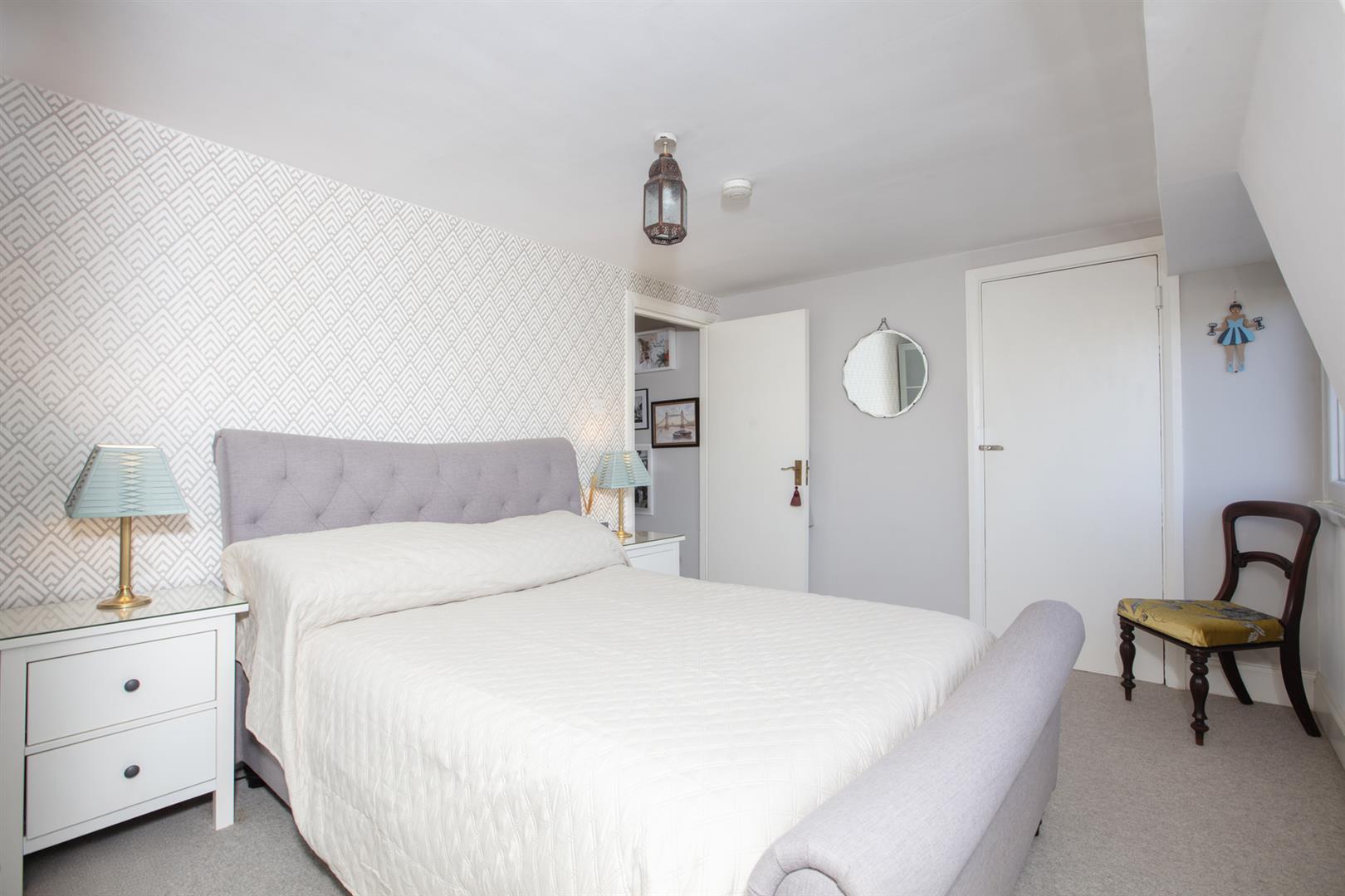 Handy understairs storage will house the Dyson and you'll notice the treads of all the stairs have been repainted in F&B's 'Skylight'. Upward to the second floor you find a wide front-facing double bedroom where two sash windows each offer space outside for greenery. There's a lovely splash of 'Oval Room Blue' on the walls. The second, even bigger double bedroom enjoys a lofty aspect through two wide casement windows. You can even spy the Shard!