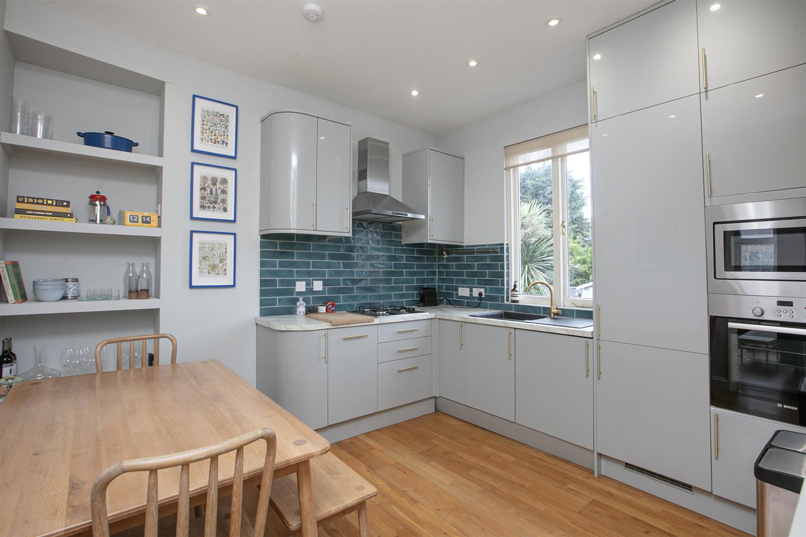 The shared entrance sits up a set of steps to the front of the building. The flat's door is dead ahead and opens into a semi-open plan hall. The modern kitchen/diner enjoys tonnes of dining and cooking space. There's a pretty garden view to the rear and the cabinets and counters are modern and plentiful. Integrated appliances include fridge/freezer, dishwasher, oven and microwave. adjoining this is a lovely bright reception with lovely French windows and shutters, integrated shelving and low level storage units.