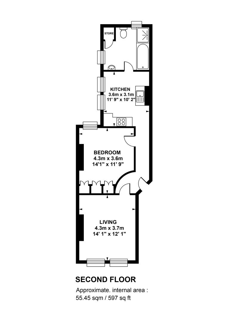 The red bricked exterior sits in a residential courtyard off Lomond Grove. A shared hallway leads upward to your flat's second floor door. Inside you meet a welcoming hall with timber floors and neutral decor. To the left sits that lovely living room. Facing front through two sash windows it enjoys high ceilings, a tiled feature alcove and comfortable lounging opportunities. The double bedroom is further along the hall and has more rustic timbers, a rear-facing sash windows and some stunning bespoke recessed wardrobes. You'll note that the interior doors throughout the flat boasts period style beehive handles.