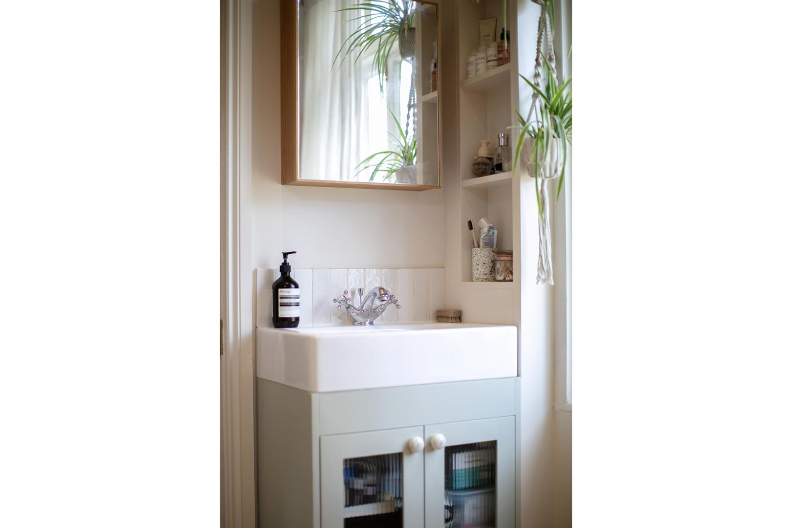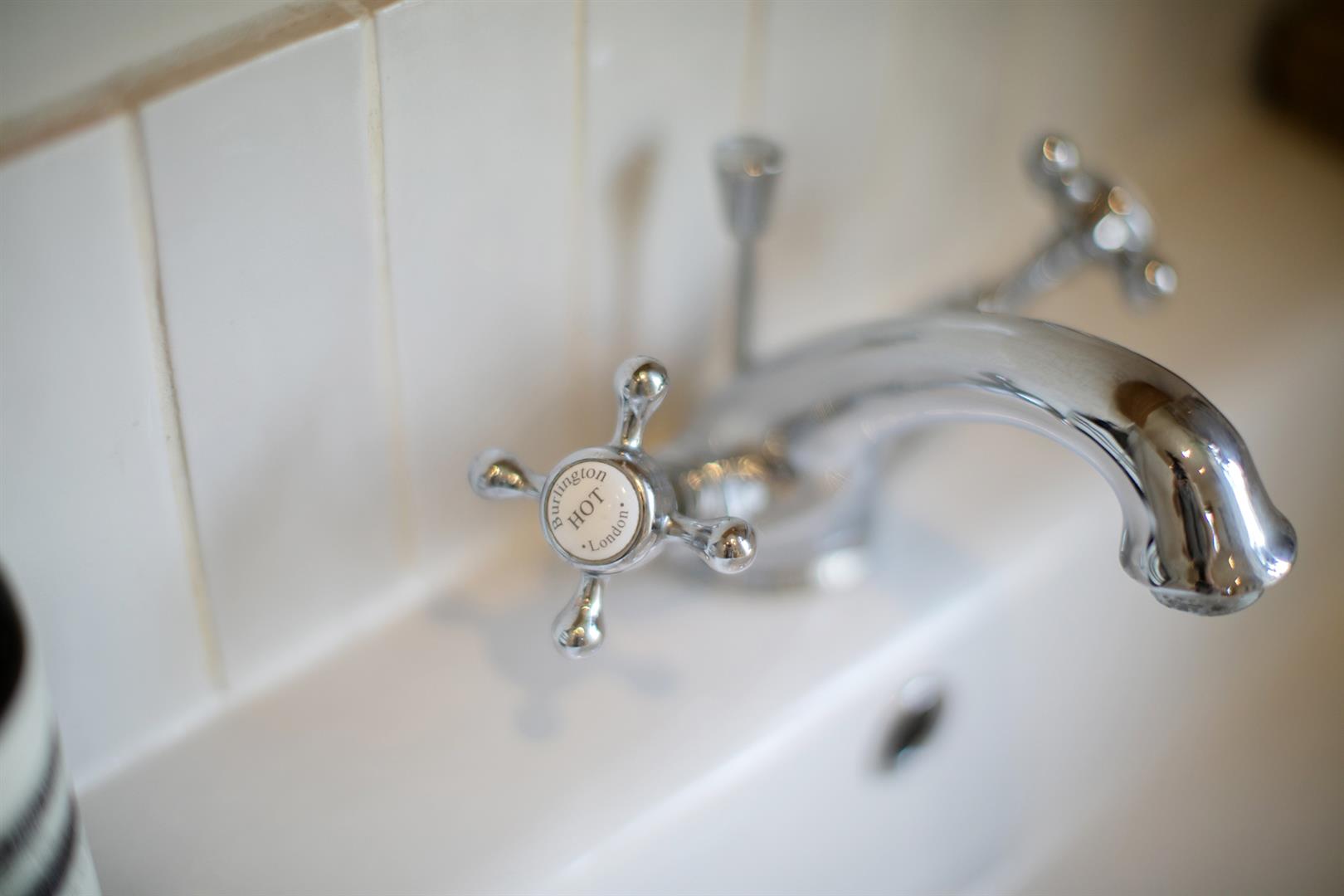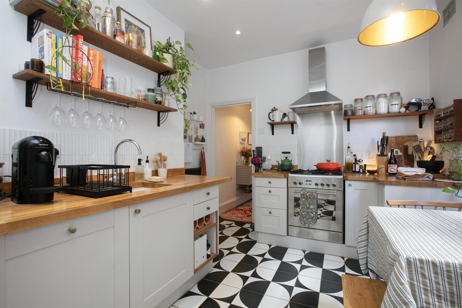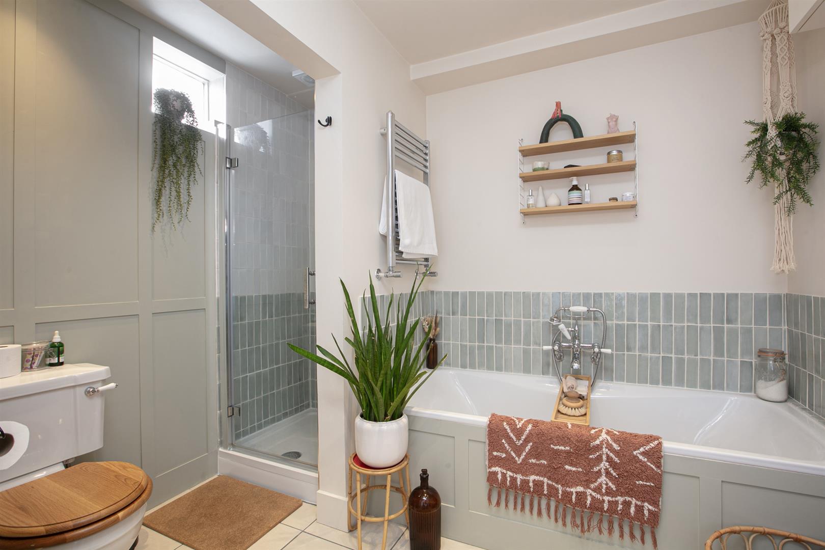 At the end of the hall you meet the kitchen/diner which is graced with thick solid wooden counters, four ring gas cooker and ceramic sink. Geometric Mandarin Stone tiling grace the floor and there's a neat recessed panty for all your spices and jams. Last but not least comes the bathroom which dons delightful wooden wall panelling and Clay Brook tiling over the bath and shower. A most-lovely ceramic sink sits over by a large side-facing mottled casement window and there's a handy laundry cupboard with plumbing for the washing machine.