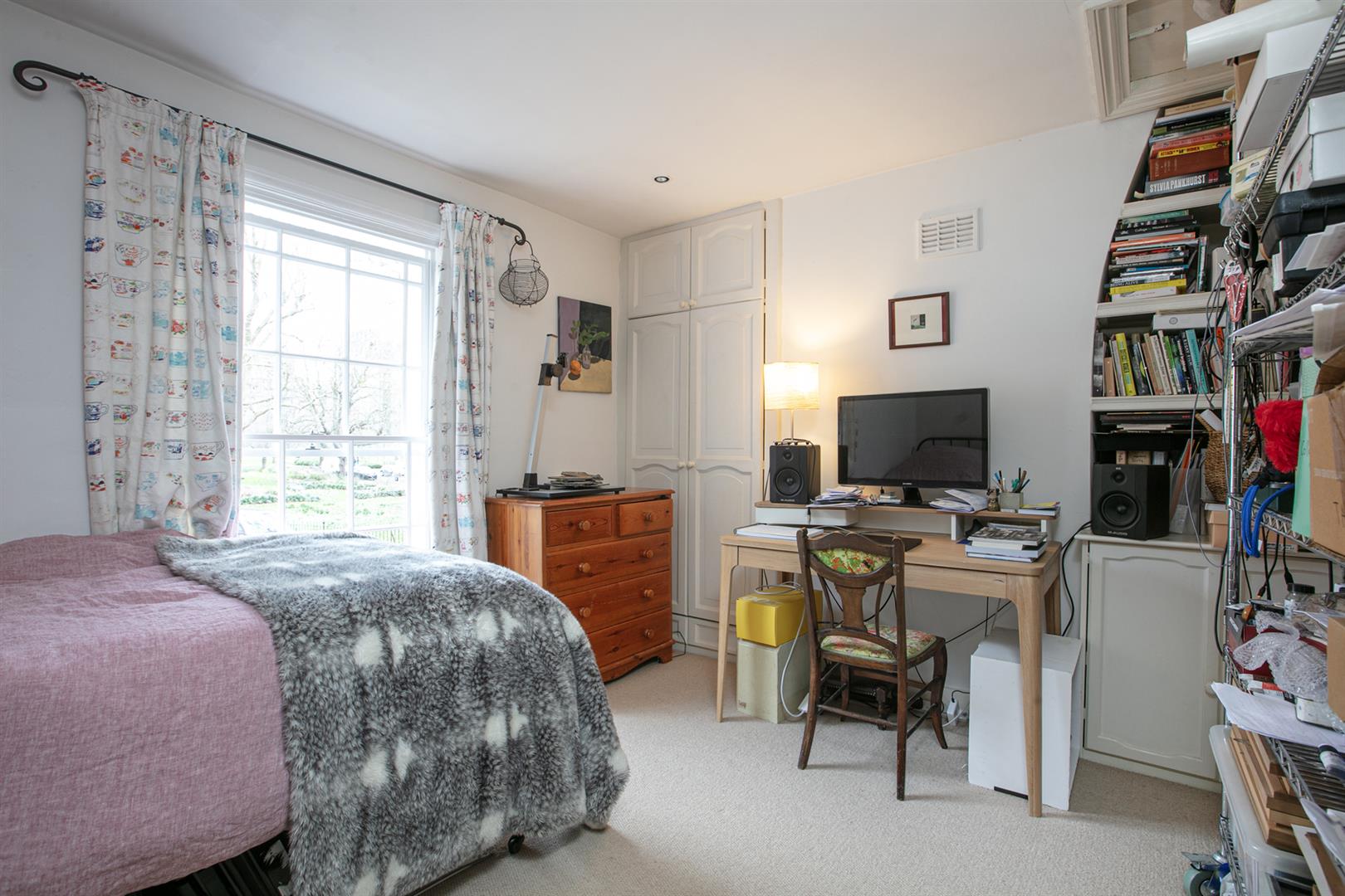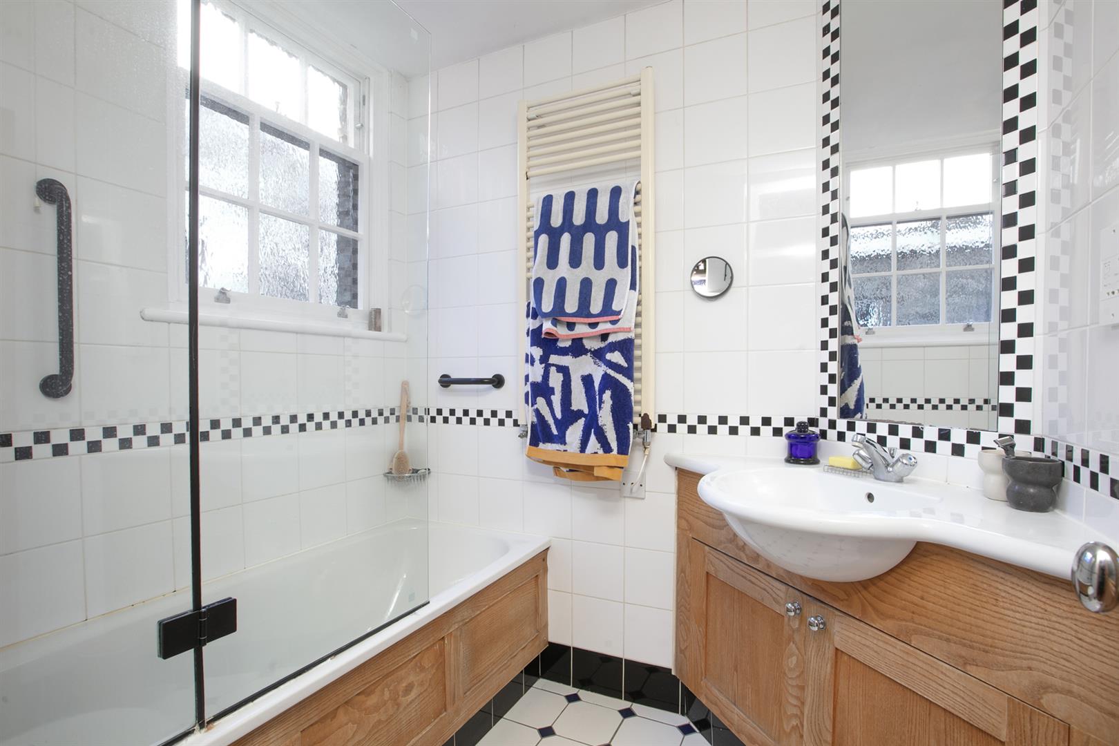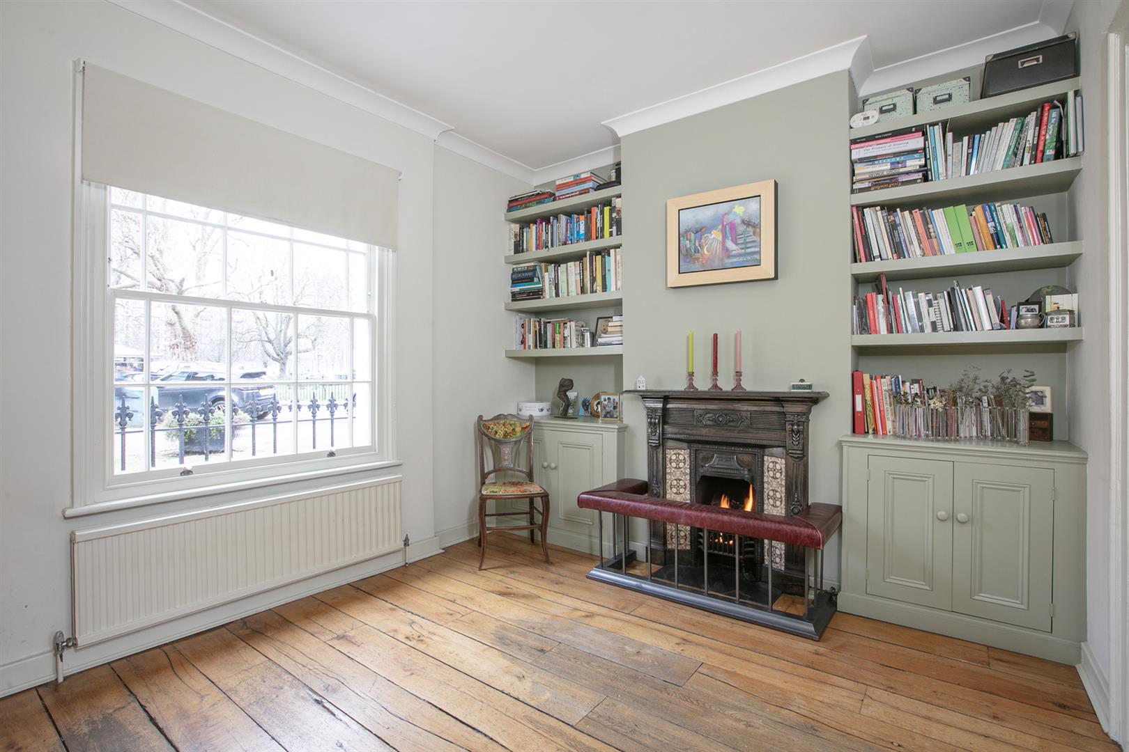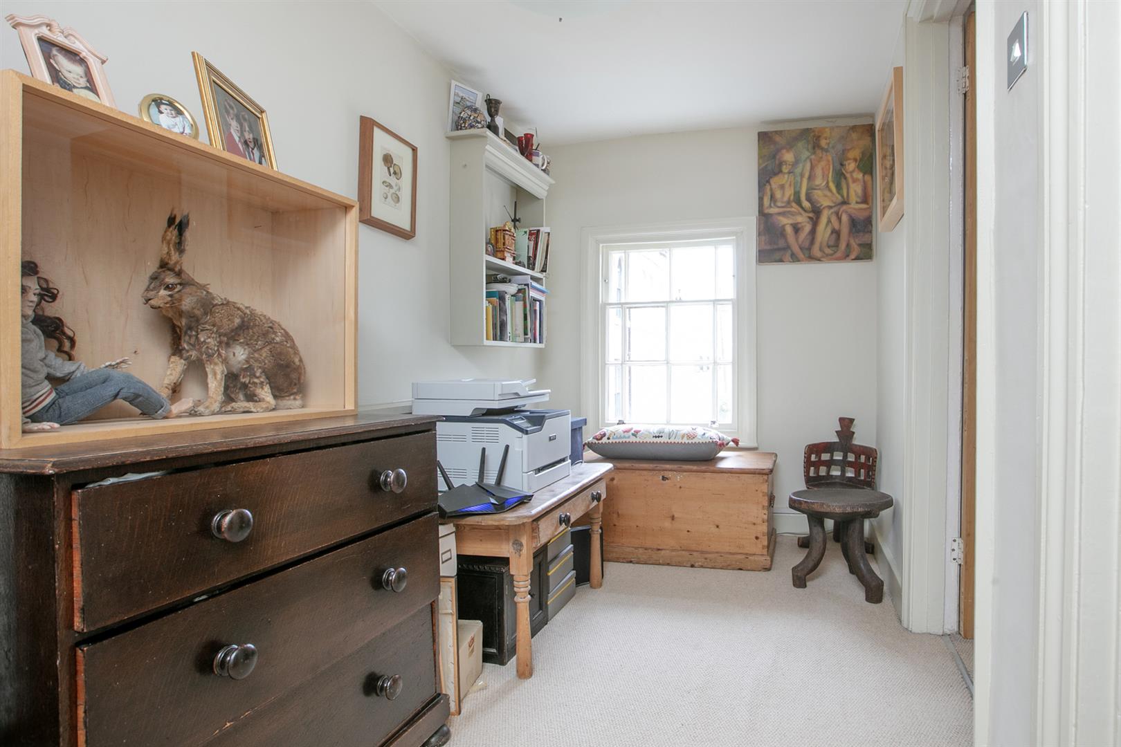 Upward bound you find the rear return sitting up a single step. There's a deep recessed storage cupboard preceding a side-aspect bathroom which is fully-tiled and has a wood panelled bath with matt black shower attachment, modern loo, heated towel rail and corner wash hand basin with wooden cabinets underneath. Beyond this is the first of your bedrooms. Currently used as an office/gym it will comfortably house a double bed and has views over the garden. The front aspect first landing feels like another room and boasts more views toward the square. Bedroom two also steals charming views through a long sash picture window. There's abundant fitted storage and loft hatch. Last but not least comes the third bedroom - a lovely double with more fitted storage and a further splendid sash window.