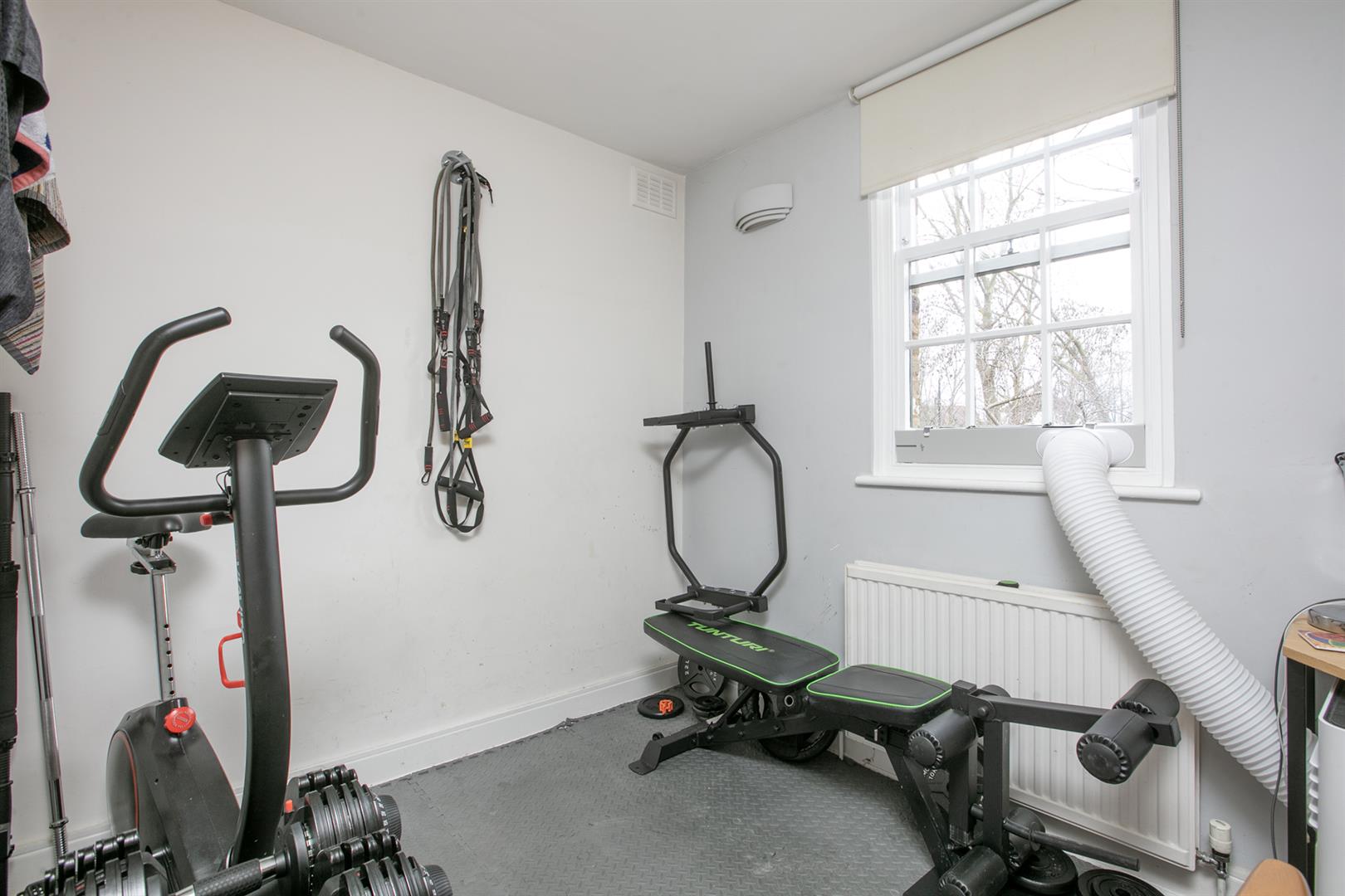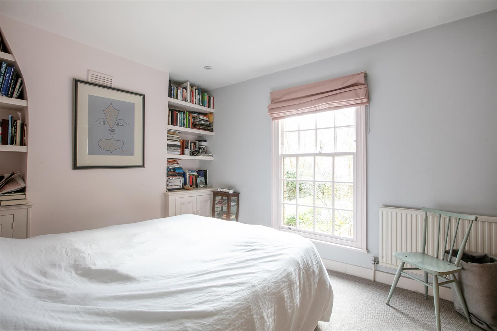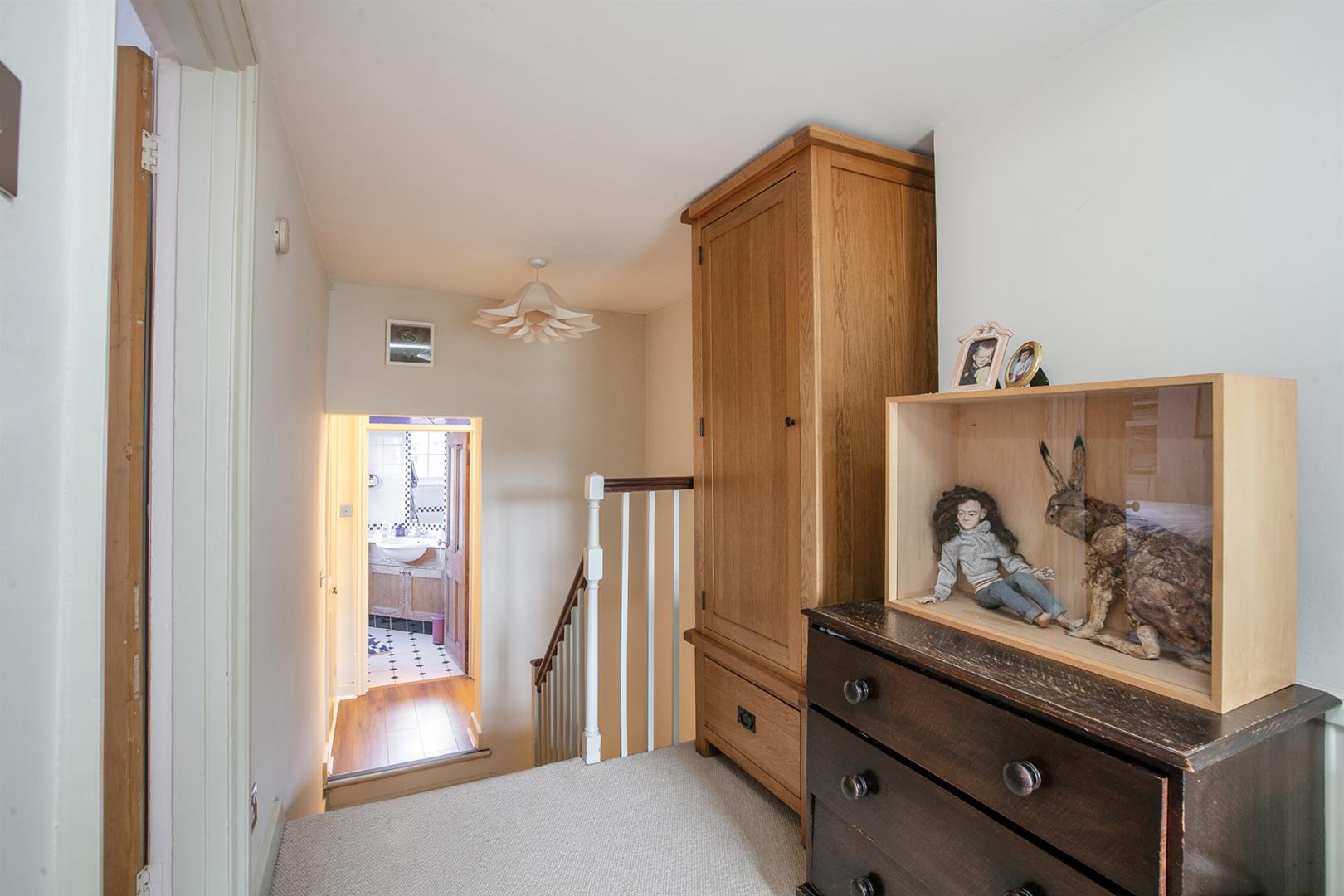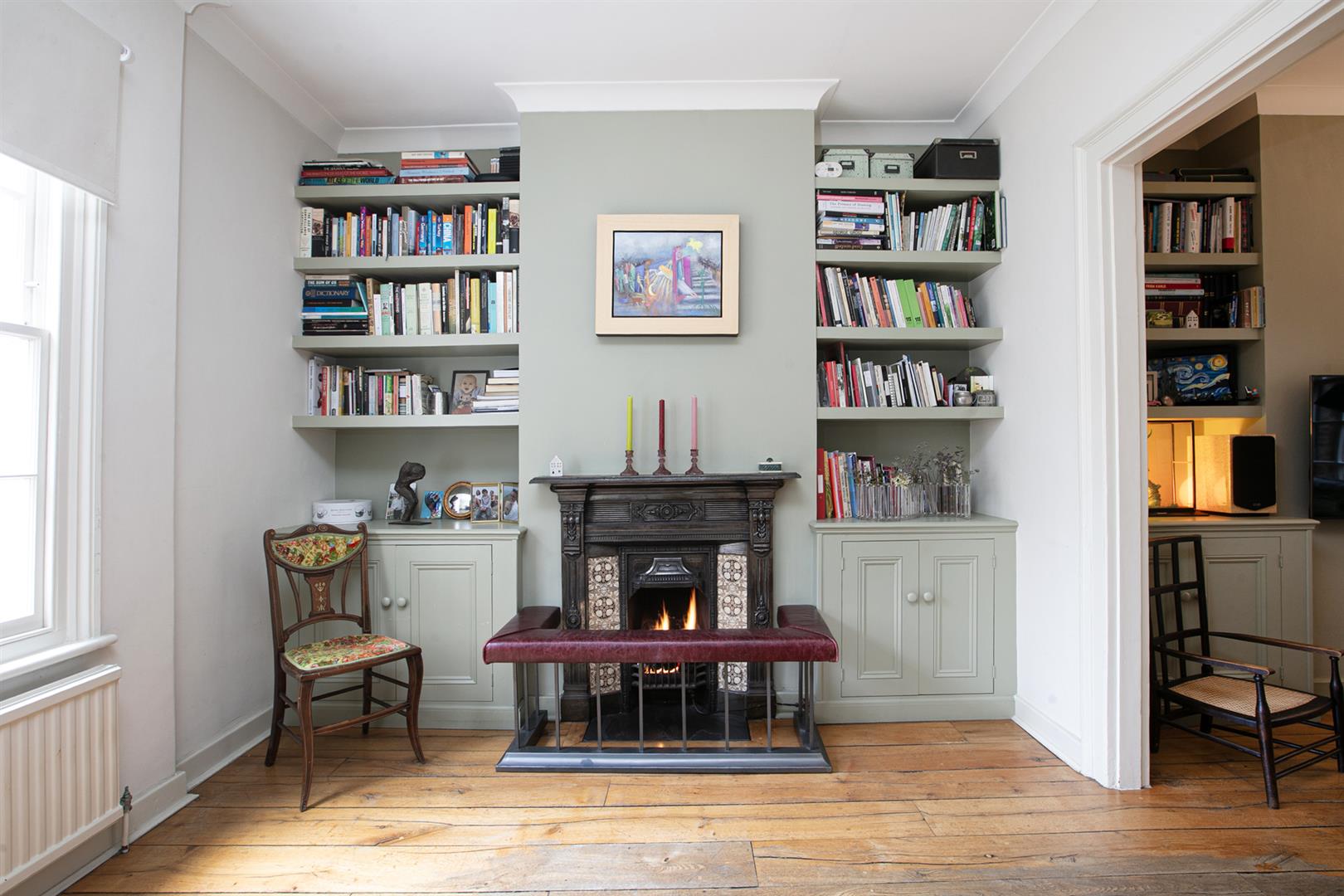 Upward bound you find the rear return sitting up a single step. There's a deep recessed storage cupboard preceding a side-aspect bathroom which is fully-tiled and has a wood panelled bath with matt black shower attachment, modern loo, heated towel rail and corner wash hand basin with wooden cabinets underneath. Beyond this is the first of your bedrooms. Currently used as an office/gym it will comfortably house a double bed and has views over the garden. The front aspect first landing feels like another room and boasts more views toward the square. Bedroom two also steals charming views through a long sash picture window. There's abundant fitted storage and loft hatch. Last but not least comes the third bedroom - a lovely double with more fitted storage and a further splendid sash window.