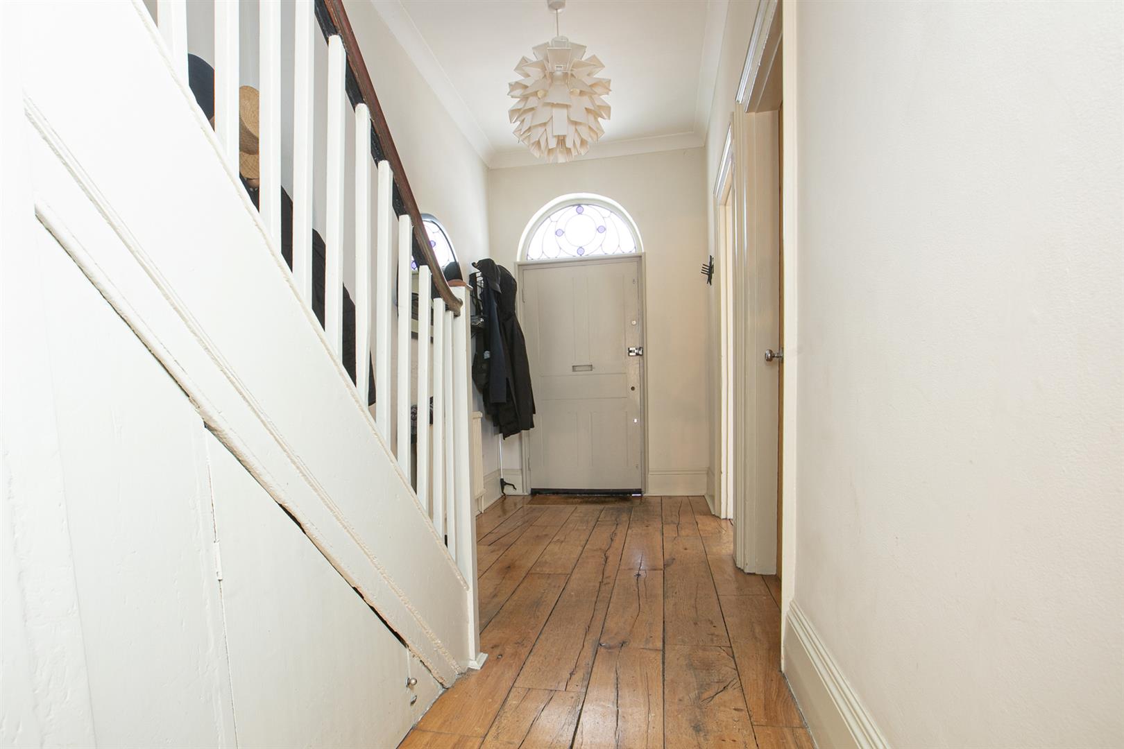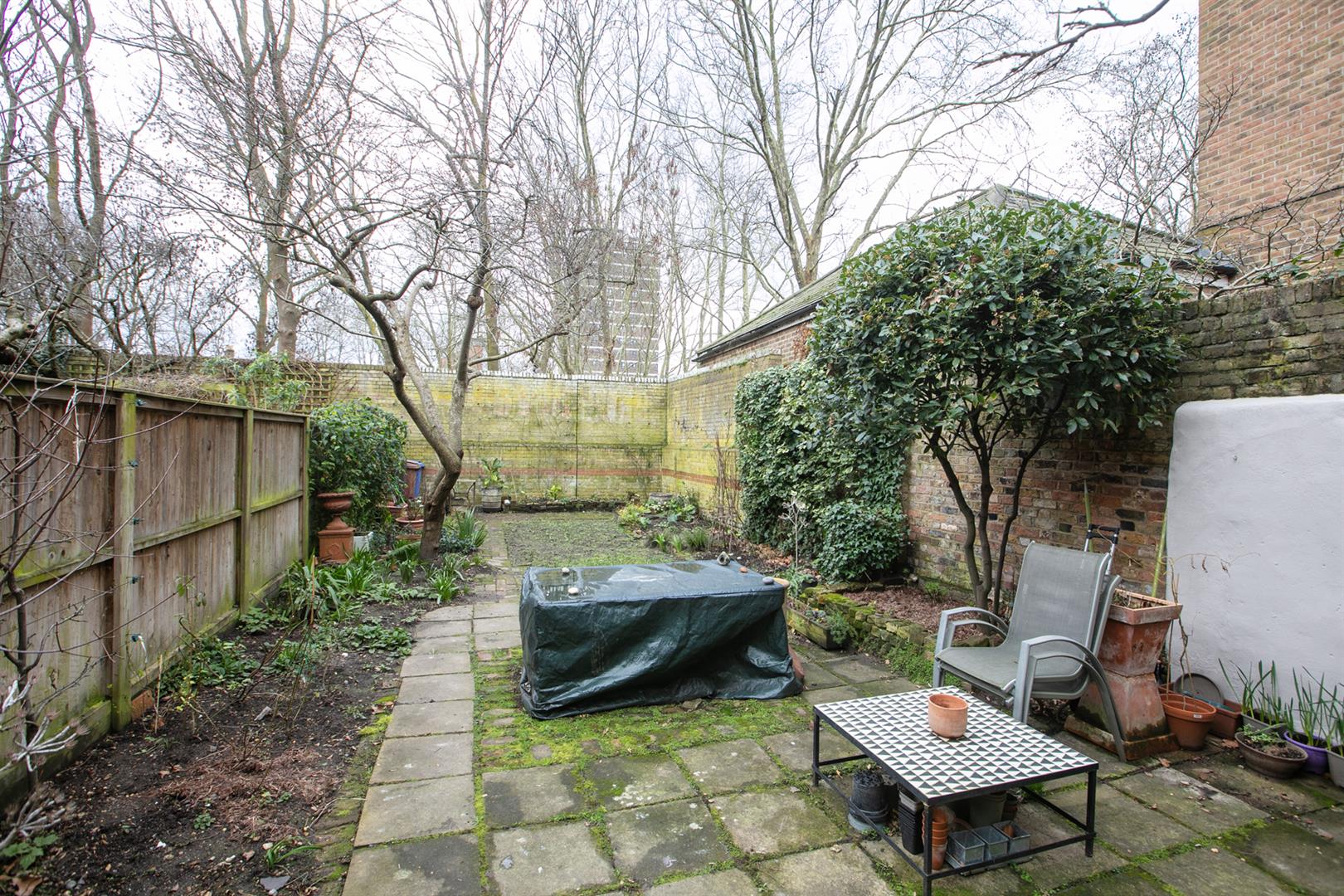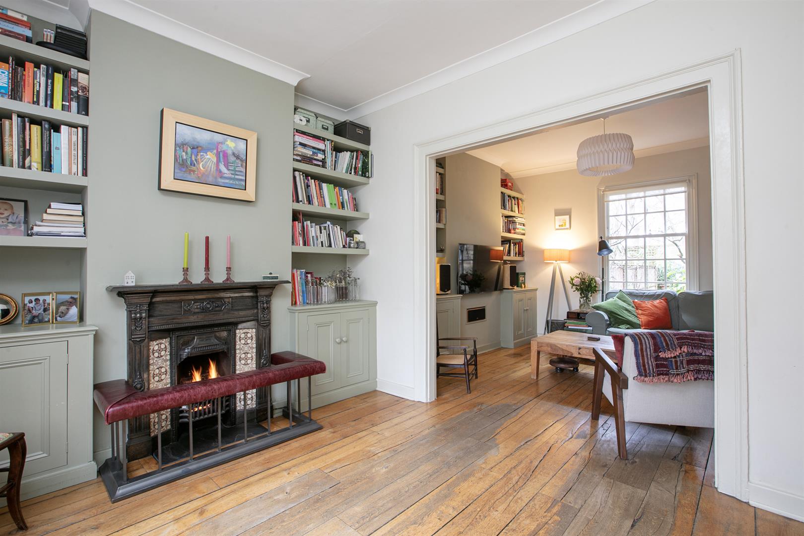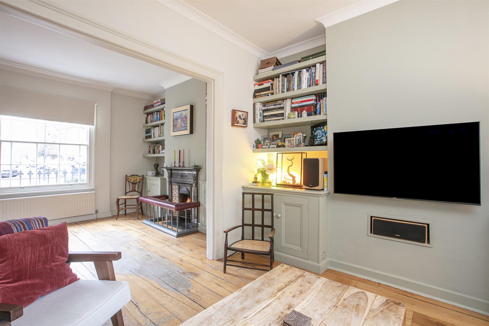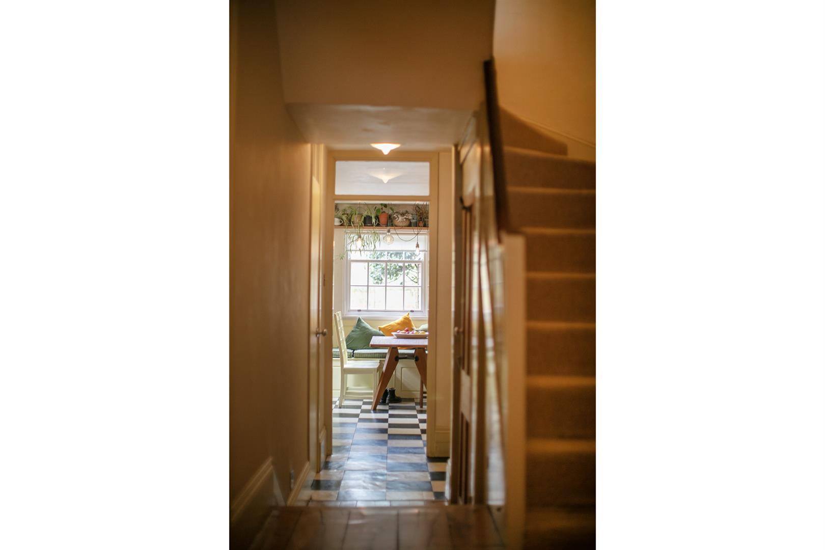 The hall enjoys light from a most elegant arched fanlight which boasts original royal blue stained glass detail. It's a lovely wide, welcoming space with 8-inch reclaimed French oak timber flooring. This continues gracefully to the double reception. Here you meet the first of those expertly recrafted sash windows which have used original materials whilst ensuring 21st century sound and draft-proofing. The view offers a sweeping vista past your regal railings to the central square. The room is a double space offering formal dining and comfortable lounging opportunities. There's a period feature fireplace with gas fire and tasteful shelving and low-level storage units. A further rear-facing sash offers a charming leafy view down the garden. Toward the rear of the hall you descend two steps to find understairs storage and a handy laundry area with space and plumbing for the washing machine. This sits opposite a guest wc. The kitchen/diner has cabinets and counters on both sides and a lovely built-in seat on the rear wall. From here you can get garden access - it's a generous paved space with tonnes of room for bbq's and sun-bathing.