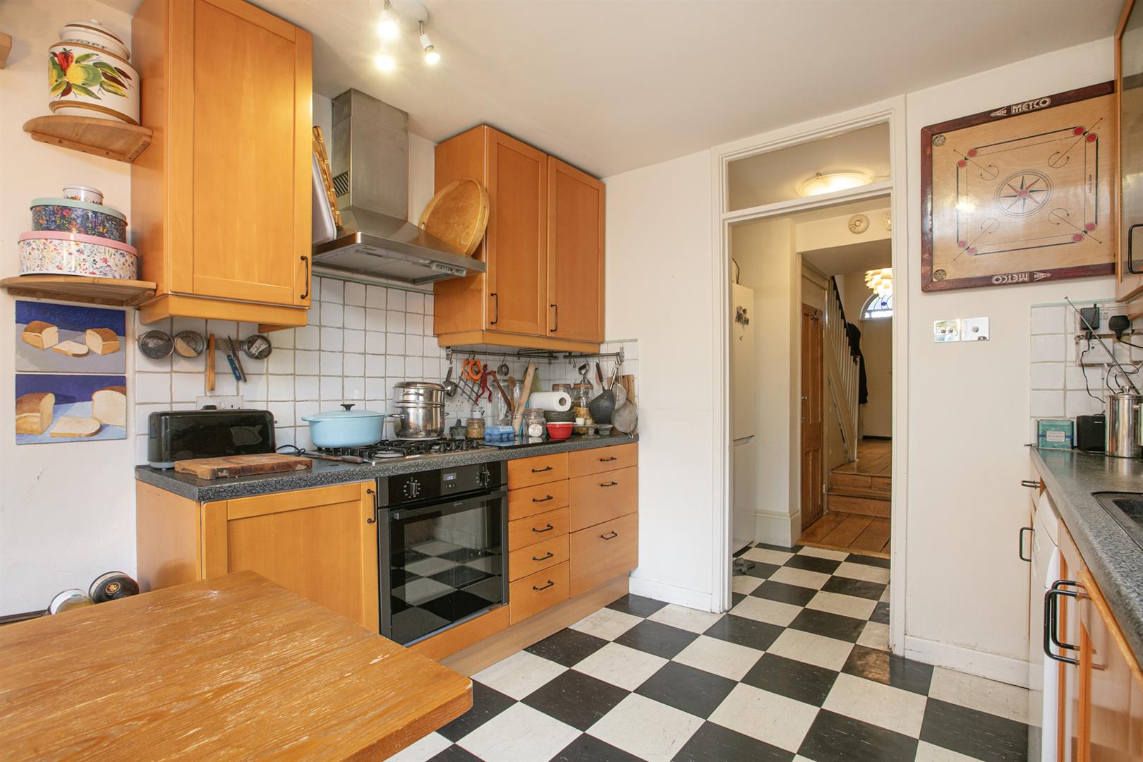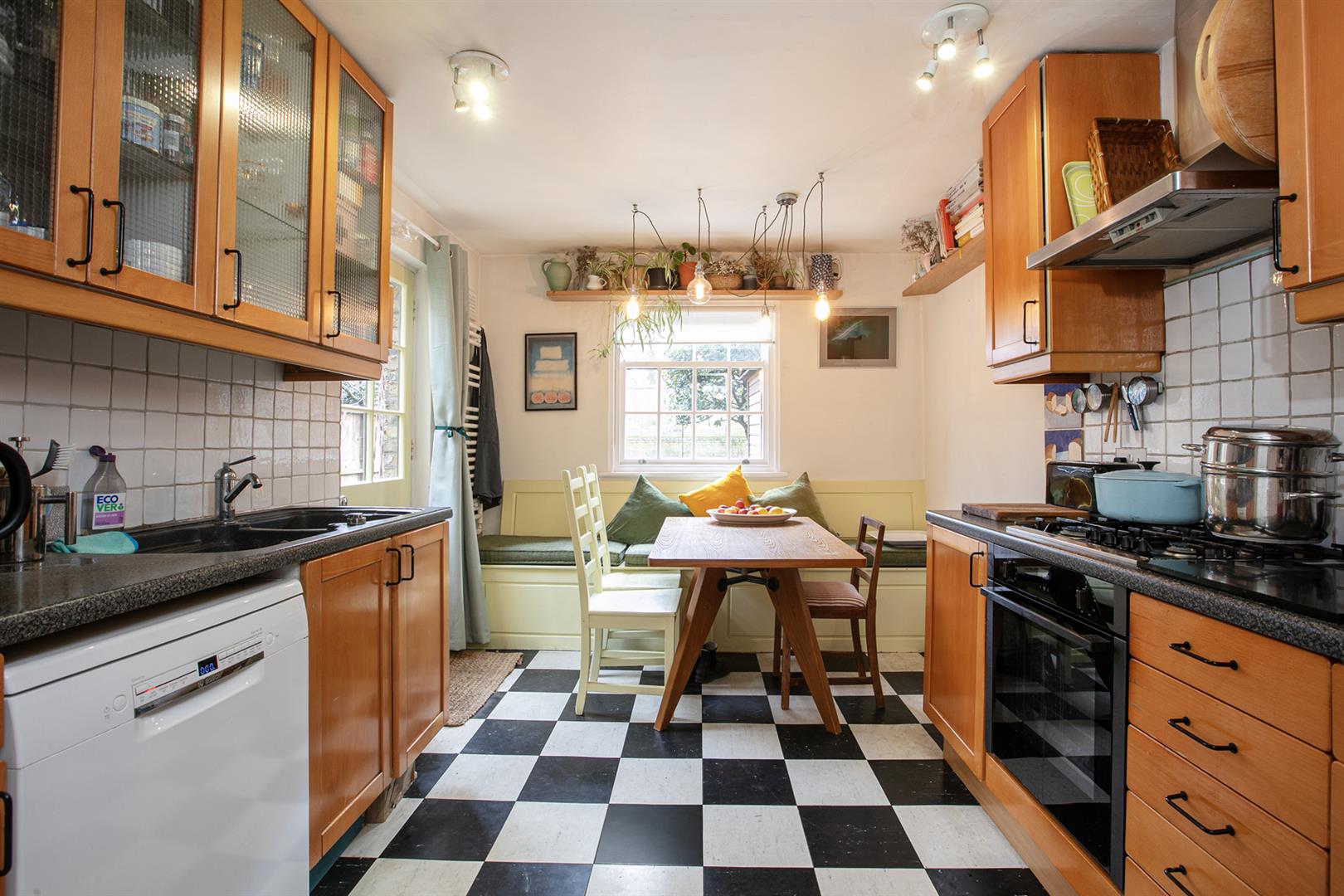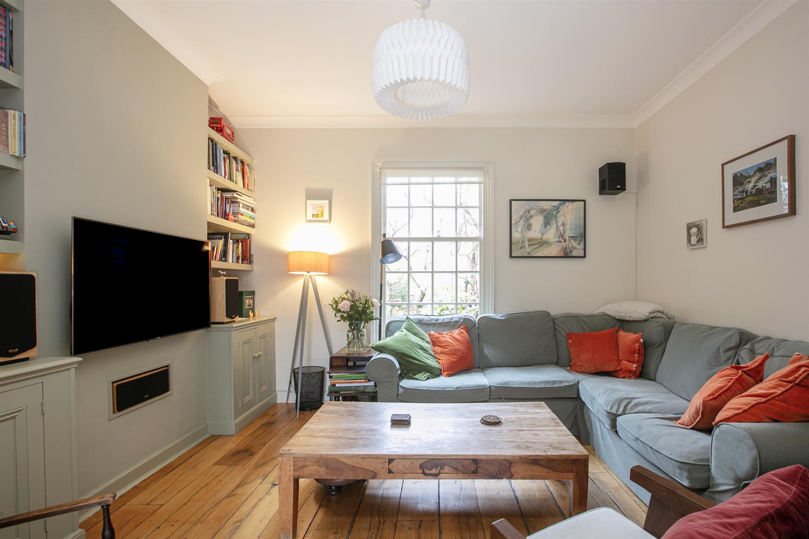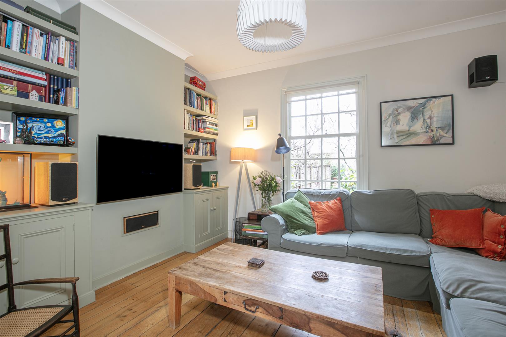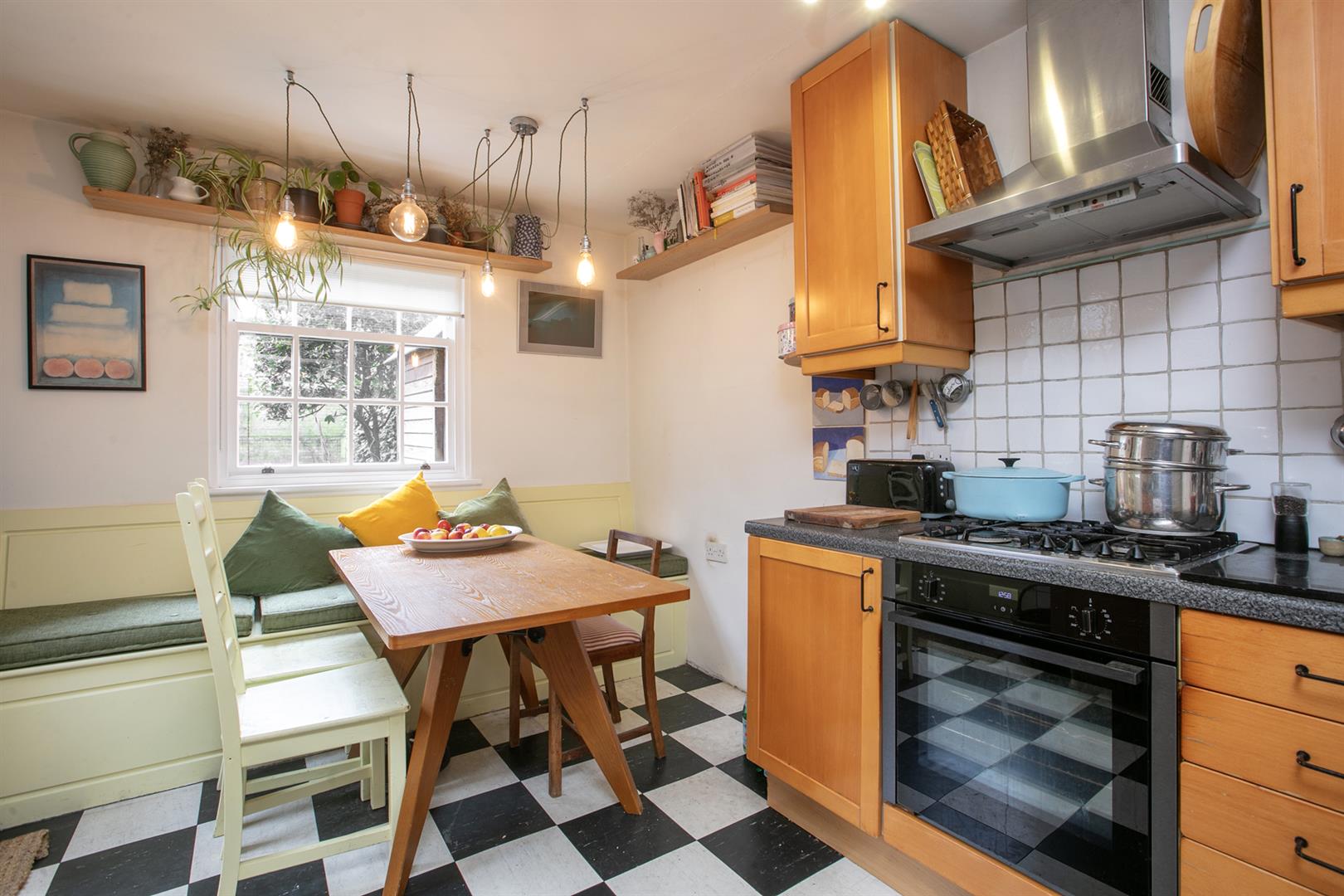 The hall enjoys light from a most elegant arched fanlight which boasts original royal blue stained glass detail. It's a lovely wide, welcoming space with 8-inch reclaimed French oak timber flooring. This continues gracefully to the double reception. Here you meet the first of those expertly recrafted sash windows which have used original materials whilst ensuring 21st century sound and draft-proofing. The view offers a sweeping vista past your regal railings to the central square. The room is a double space offering formal dining and comfortable lounging opportunities. There's a period feature fireplace with gas fire and tasteful shelving and low-level storage units. A further rear-facing sash offers a charming leafy view down the garden. Toward the rear of the hall you descend two steps to find understairs storage and a handy laundry area with space and plumbing for the washing machine. This sits opposite a guest wc. The kitchen/diner has cabinets and counters on both sides and a lovely built-in seat on the rear wall. From here you can get garden access - it's a generous paved space with tonnes of room for bbq's and sun-bathing.