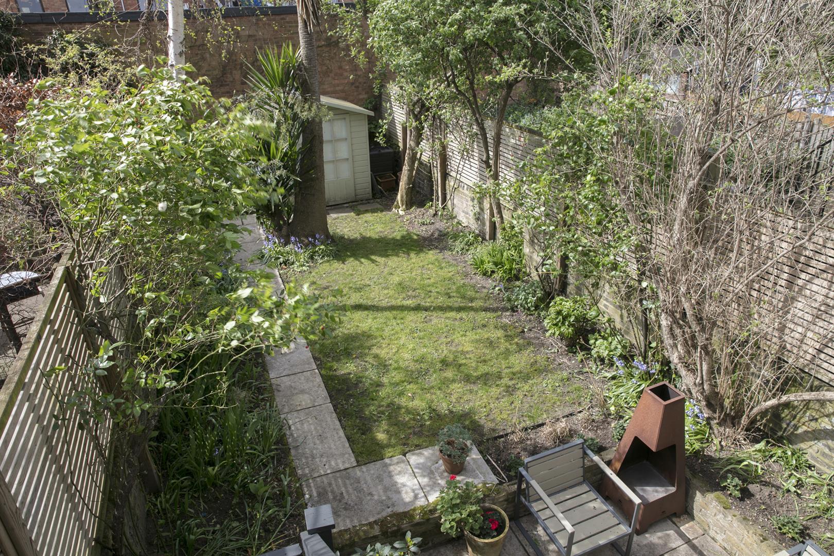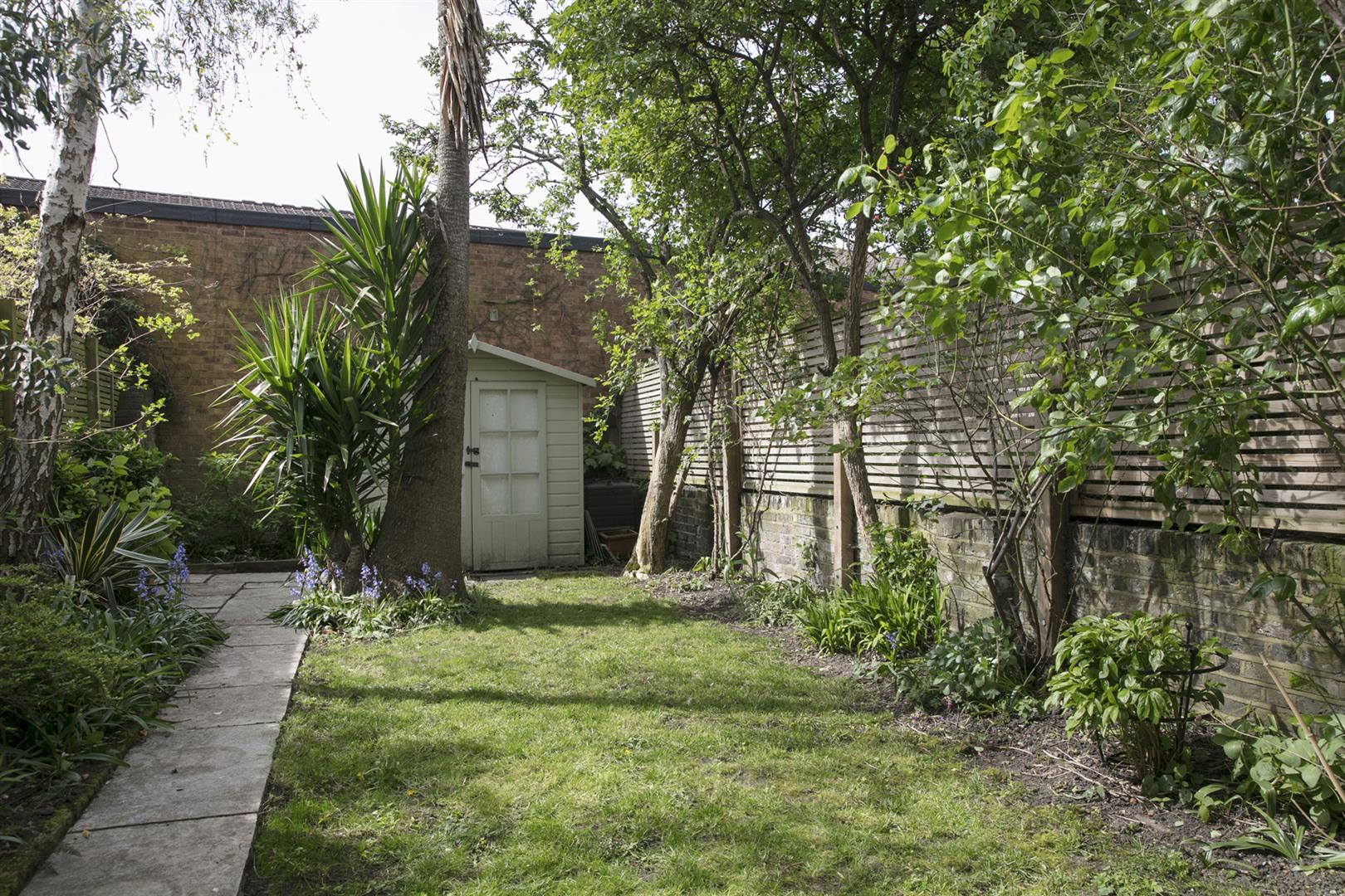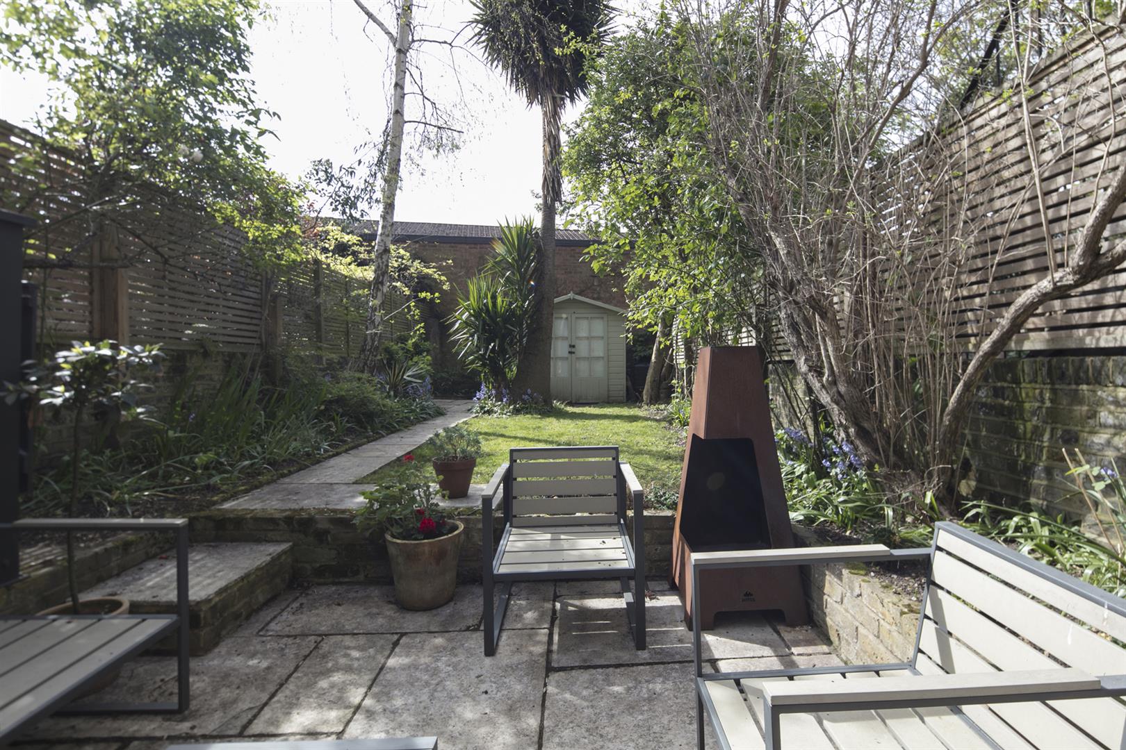 Moving down to the lower ground floor you find a long carpeted landing and understairs storage. The master bedroom fronts the private front garden and enjoys the building's full width. There's abundant fitted storage and a neat front aspect bay with louvered blinds. A second, neater double sits to the rear where French doors open to the side patio. The bathroom is a fine size and boasts walk-in shower, roll top bath and outside access. The garden supplies a second patio, healthy lawn and tonnes of mature greenery.