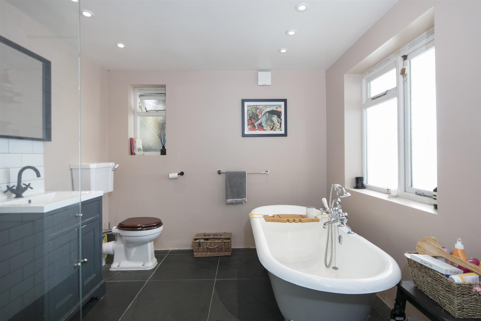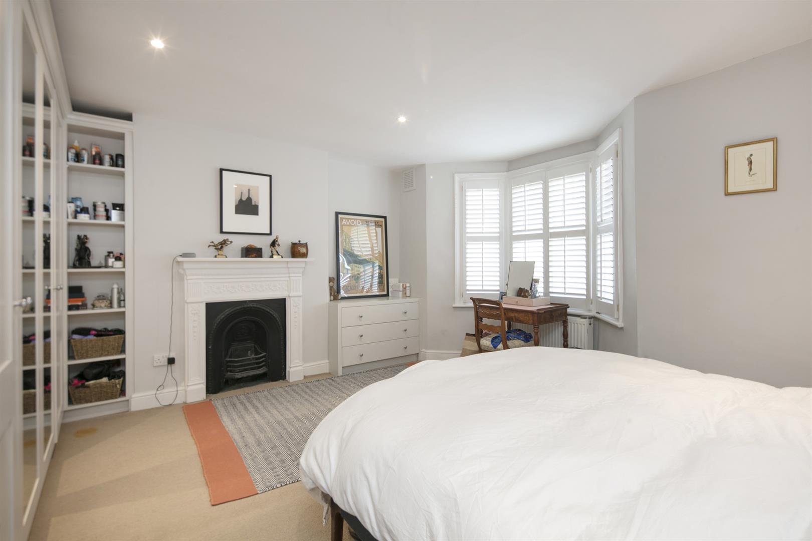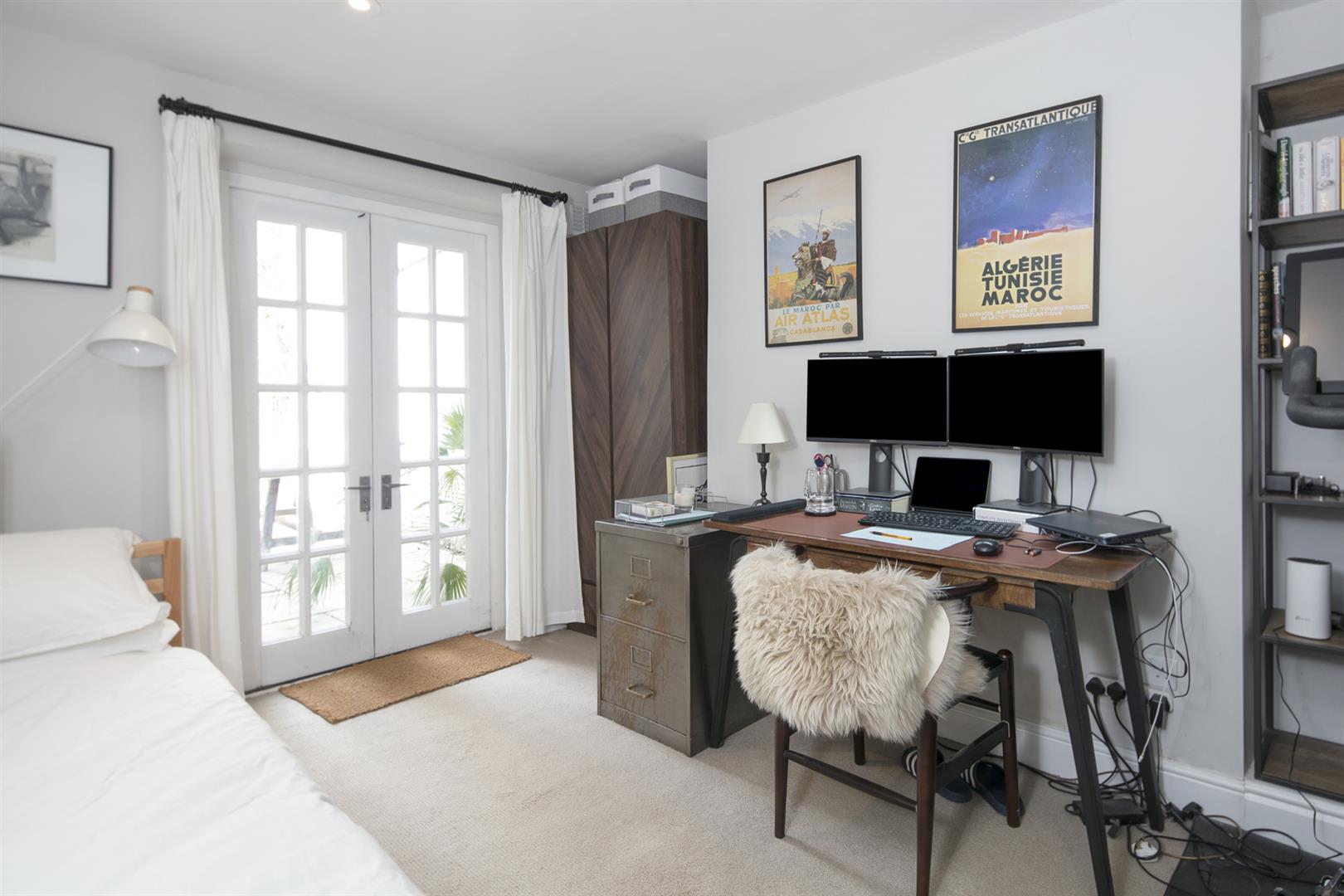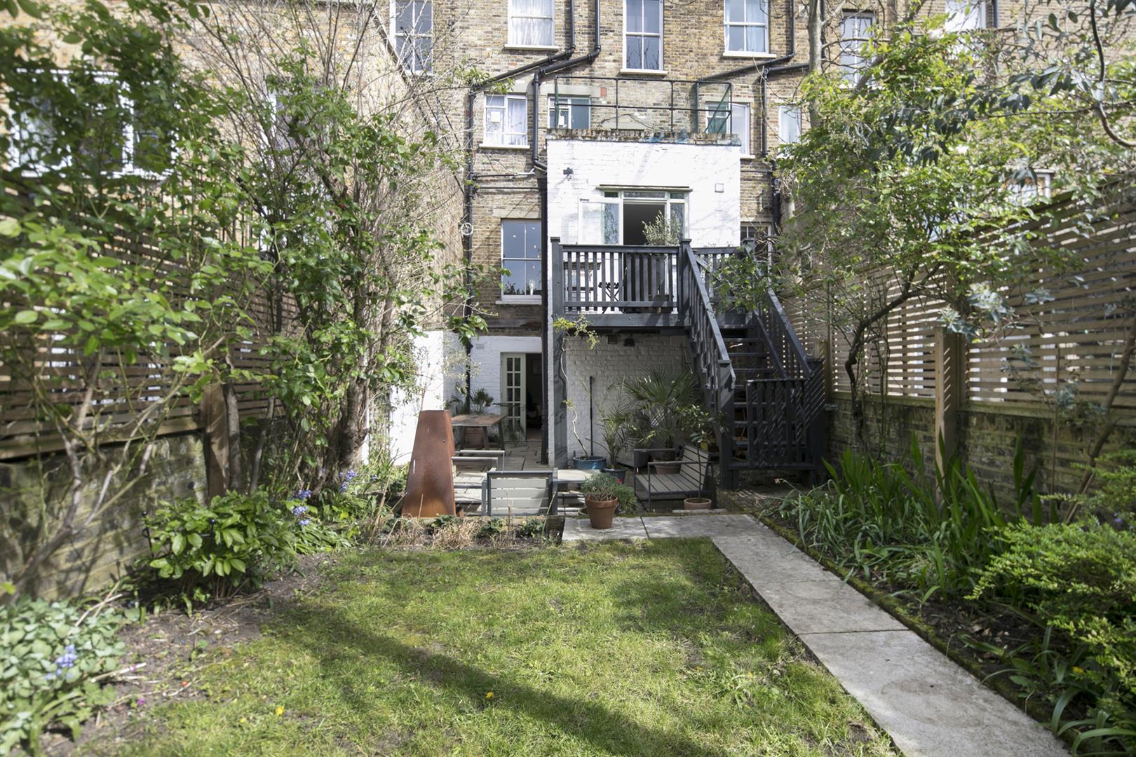 Moving down to the lower ground floor you find a long carpeted landing and understairs storage. The master bedroom fronts the private front garden and enjoys the building's full width. There's abundant fitted storage and a neat front aspect bay with louvered blinds. A second, neater double sits to the rear where French doors open to the side patio. The bathroom is a fine size and boasts walk-in shower, roll top bath and outside access. The garden supplies a second patio, healthy lawn and tonnes of mature greenery.