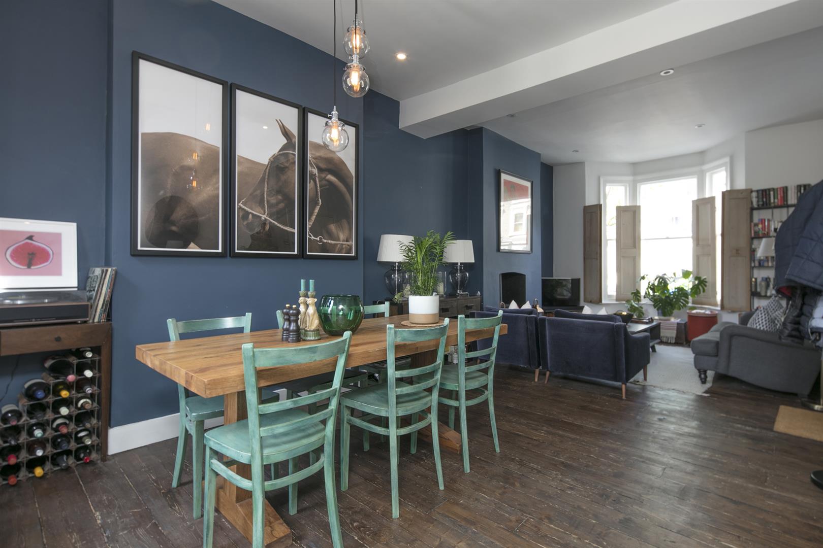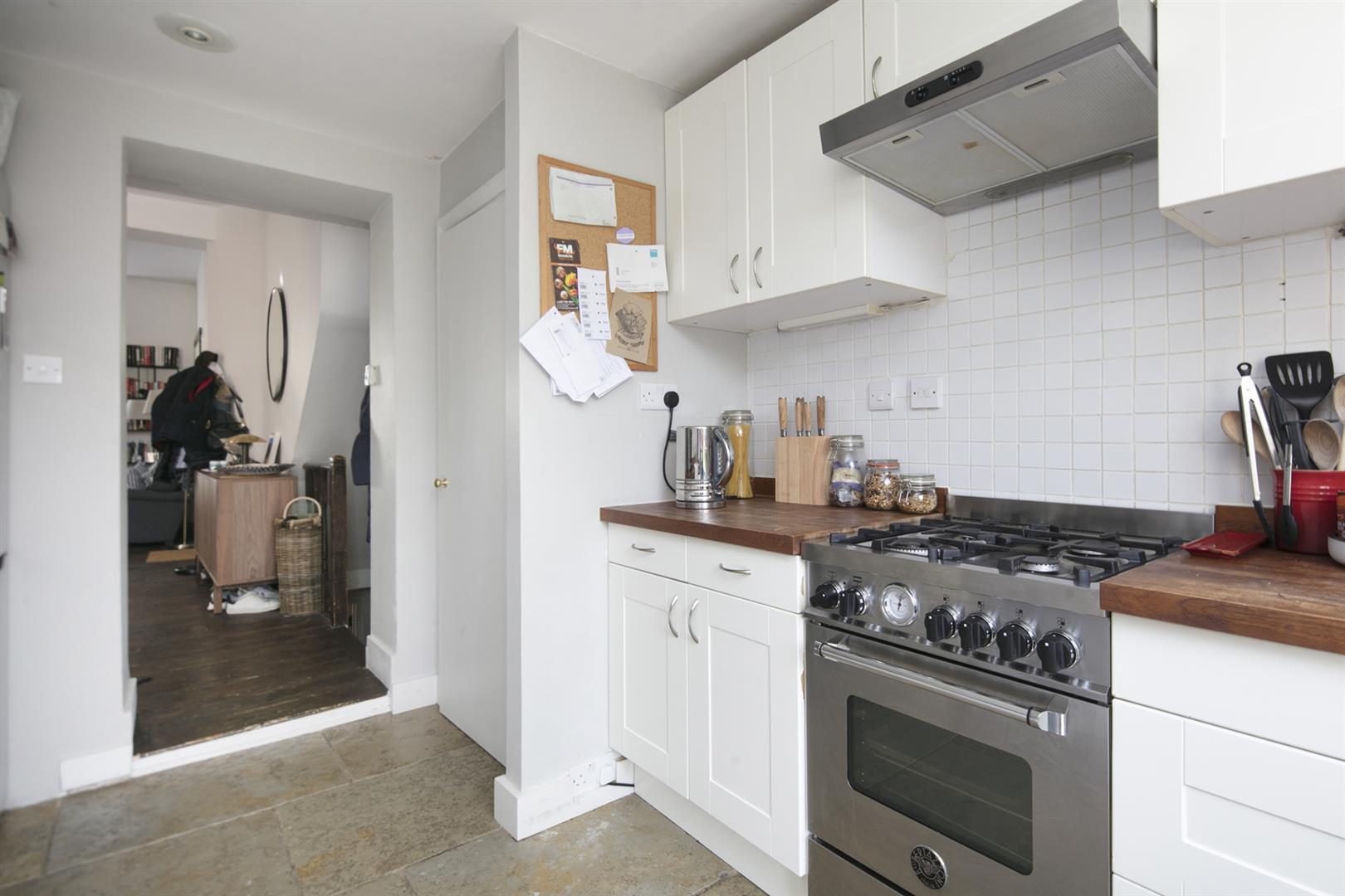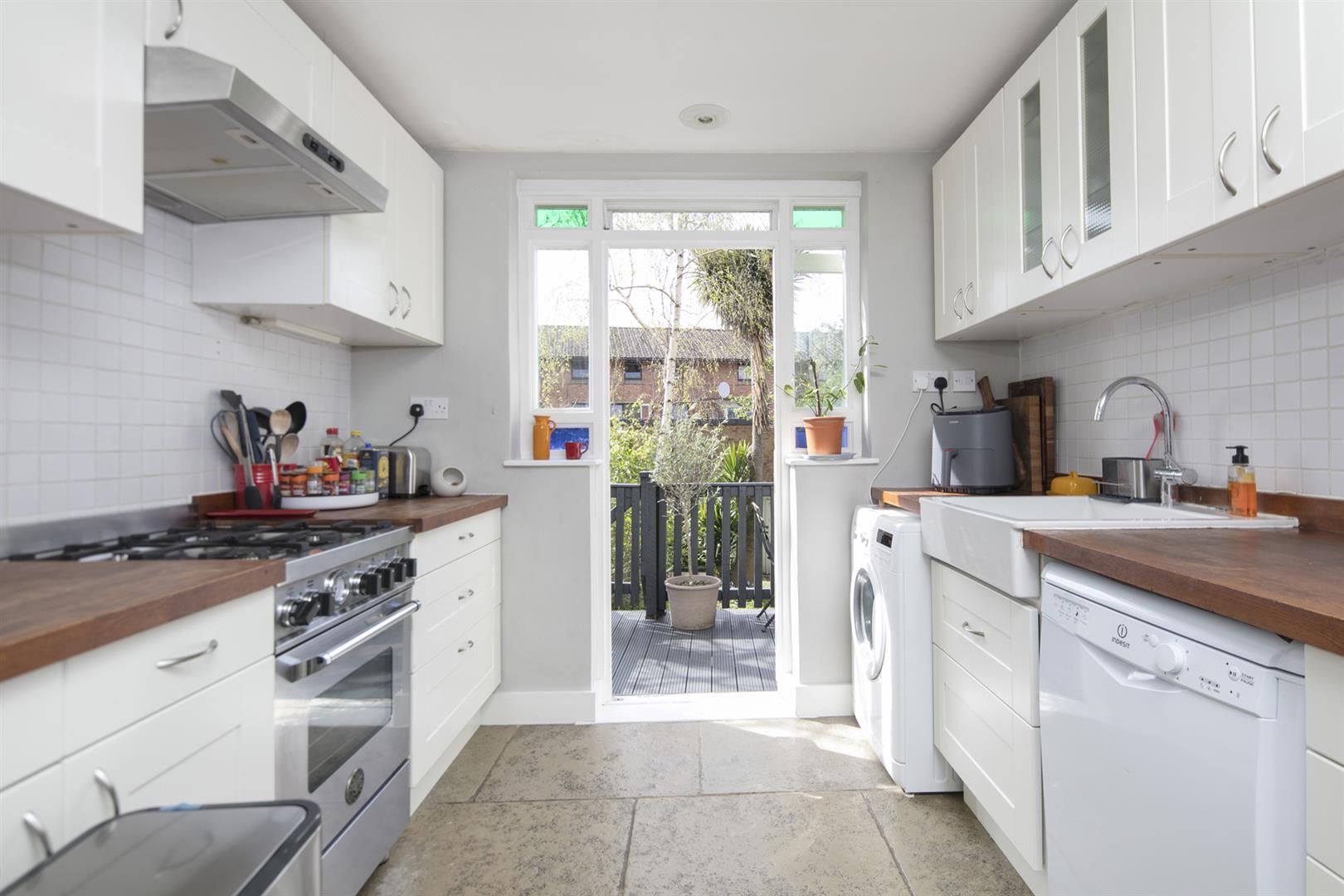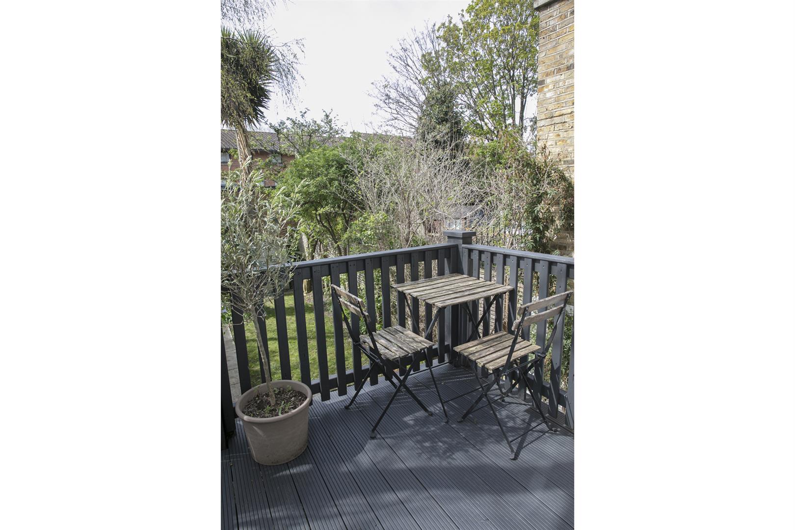 A private front garden with bike storage underneath and shared entrance leads you to the flat's ground floor door. You enter directly into an impressive open plan living area with lofty high ceilings the full glorious length. There's a wood burning stove and a wide front aspect bay of original sash windows with lovely wooden shutters for privacy. There's space to lounge in style and host a banquet too! The kitchen adjoins to the rear with tiled floor, solid oak counters, over-sized ceramic sink and a four ring gas cooker. A decked patio invites you out for some wonderful space to dine al-fresco and the raised balcony captures the late evening sun.