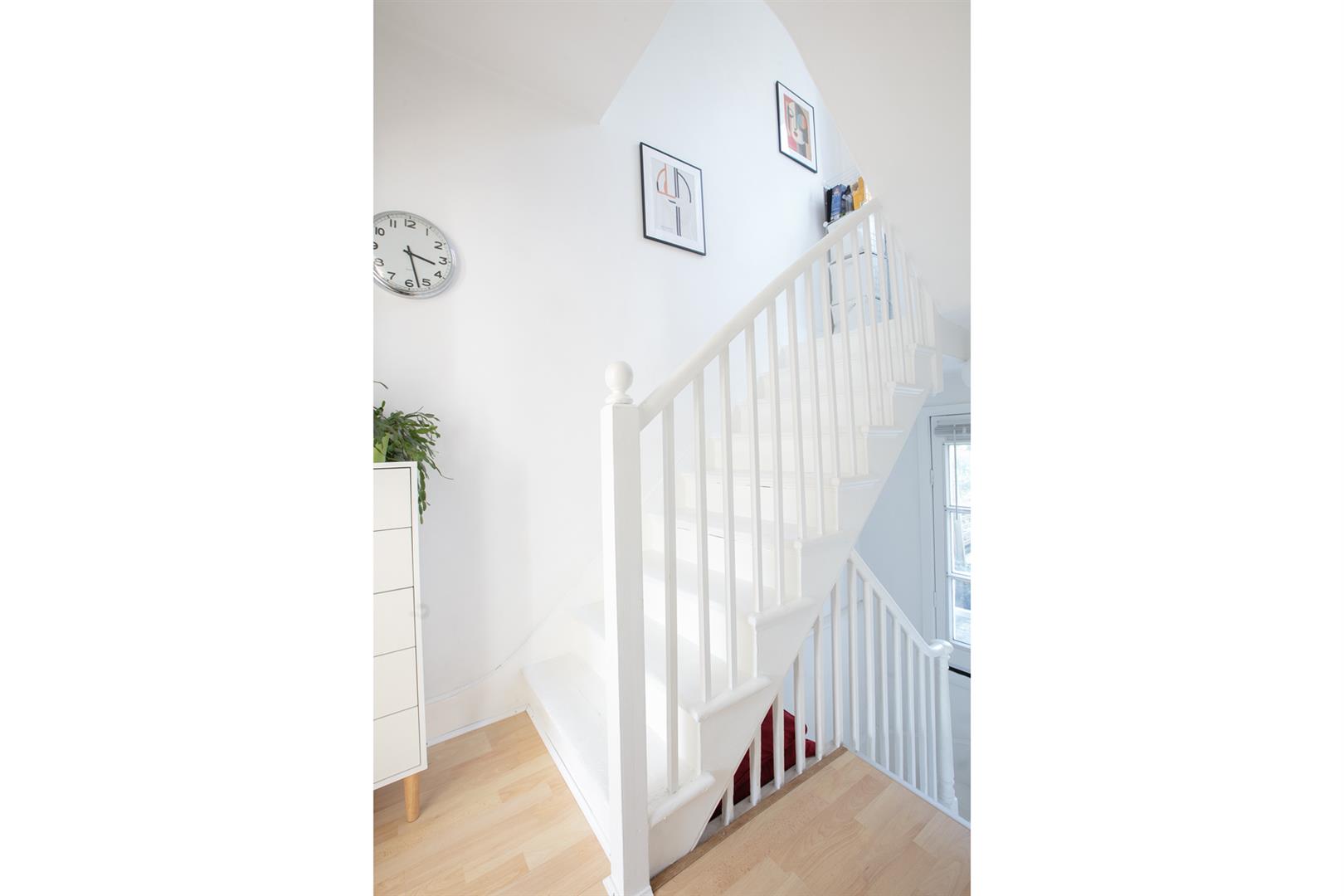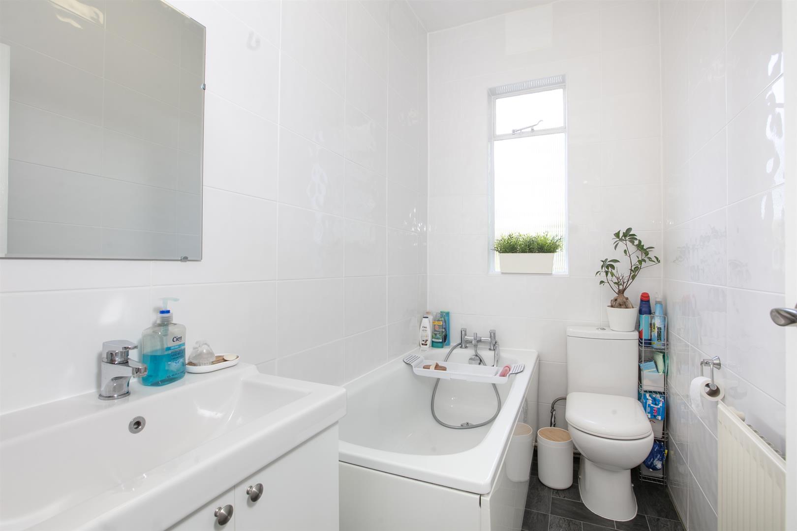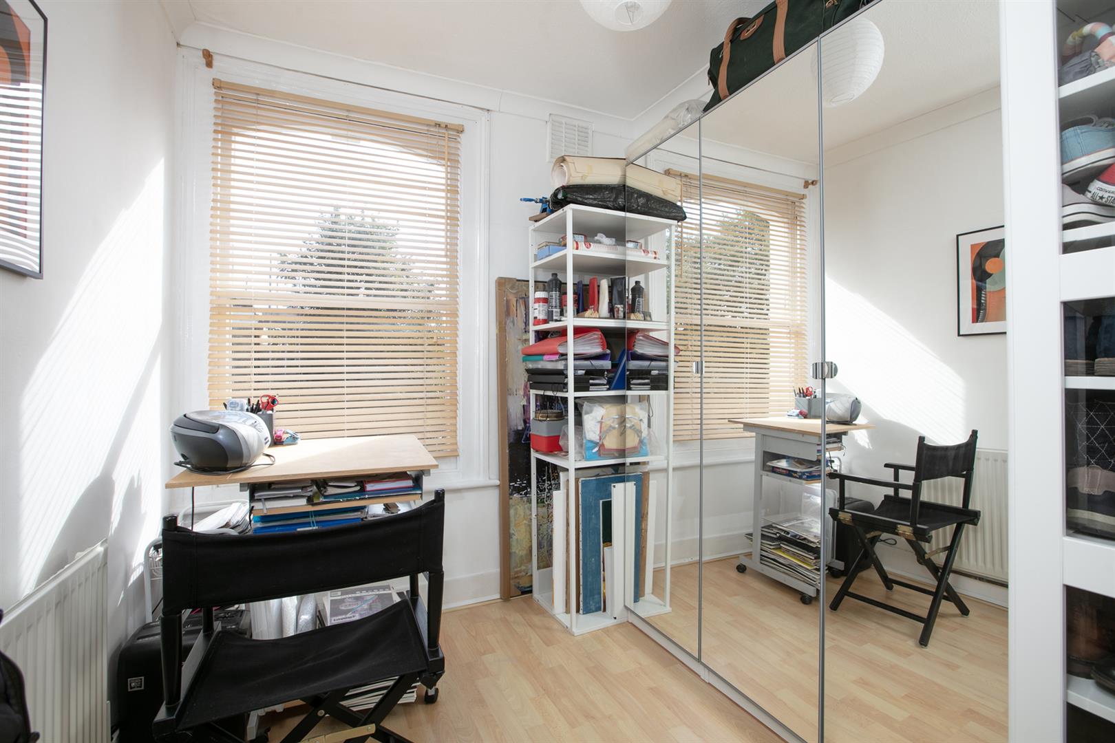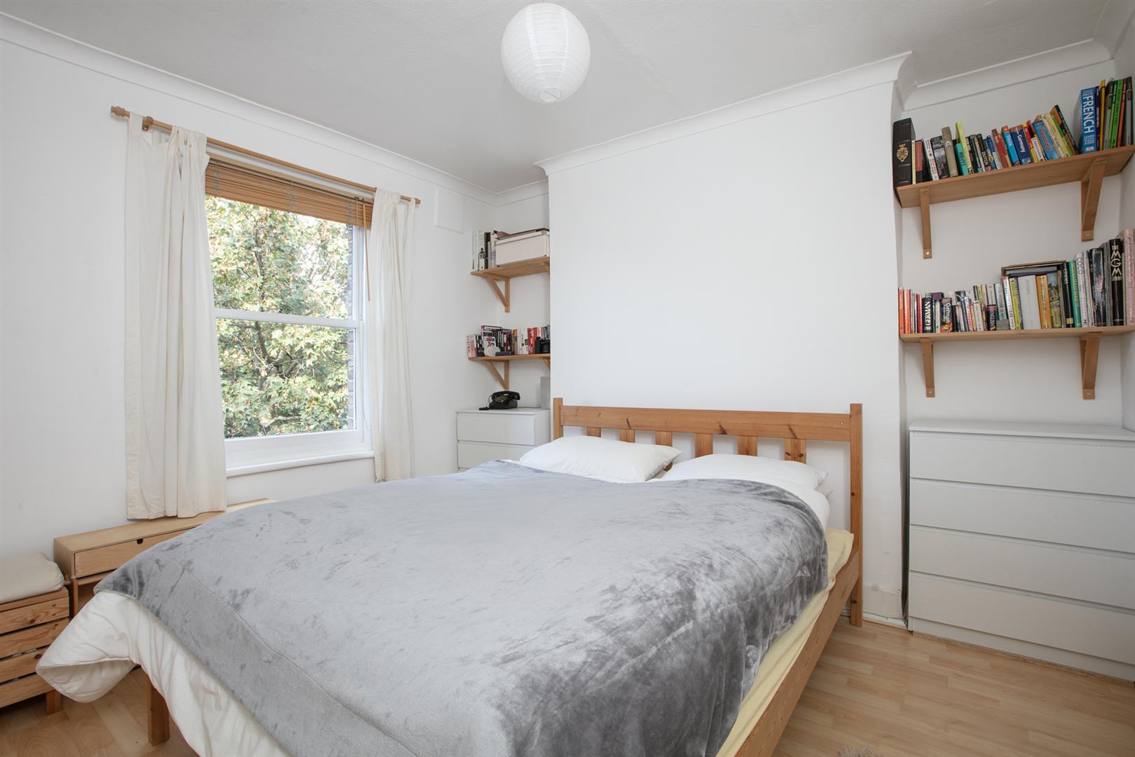 The top landing is kept bright by a large rear facing sash window on the upper return. The stairs, treads and risers are painted white. The largest of your wonderful bedrooms comes first on your left with a leafy, lofty rear view and tonnes of slumber and storage space. The second bedroom fronts the street with a lovely bright streetscape, fitted storage and oodles of room for a double bed. Bedroom three also fronts the street and will make a fine study or single bedroom. There's more fitted storage on the upper landing.