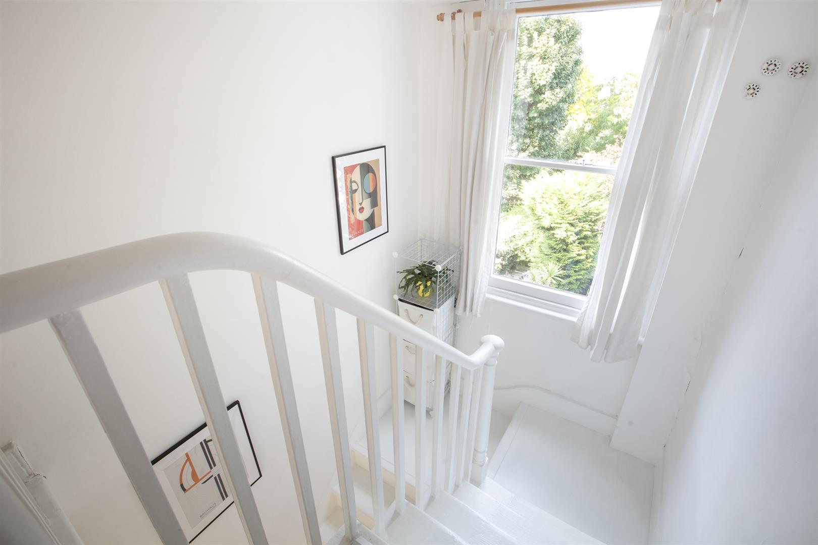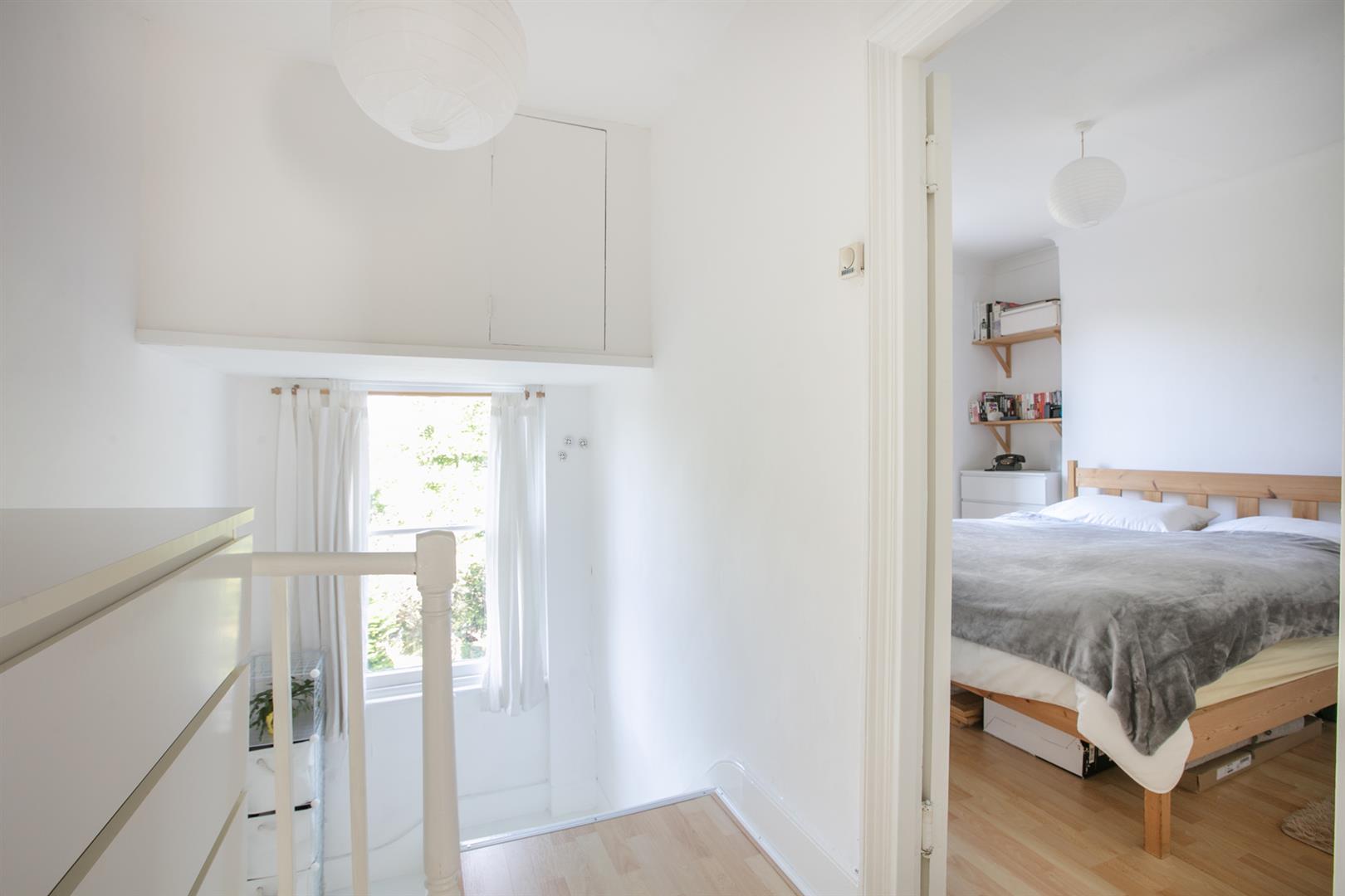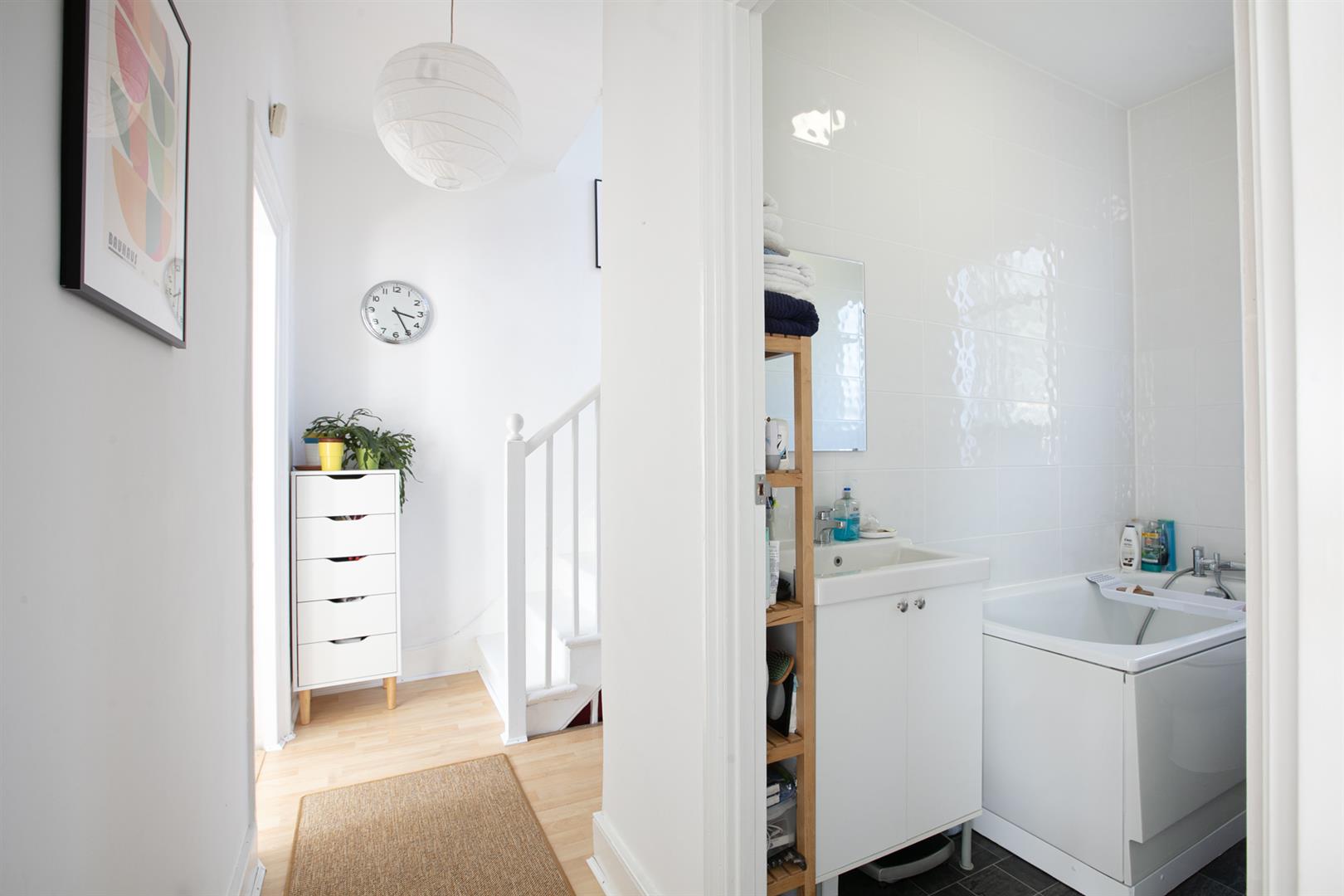 A private entrance invites you up a set of steps to the front of the building. Your inner private hall offers the perfect spot for coat, brollies and bikes. Upward bound to the first floor you find the reception fronts the street into full-width. There are two sash windows, gas fire, and plenty of space for lounging, dining and entertaining. The kitchen adjoins rear with a leafy aspect, fresh tiling, four ring induction hob and oven. Next to this you meet an as-new bath with funky 1930's Crittall window.