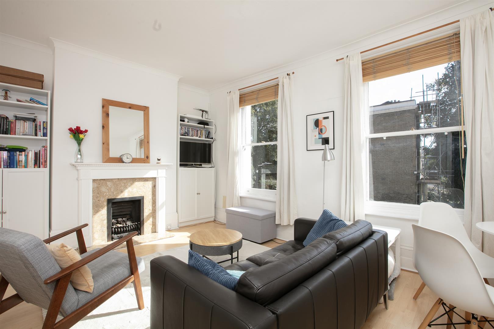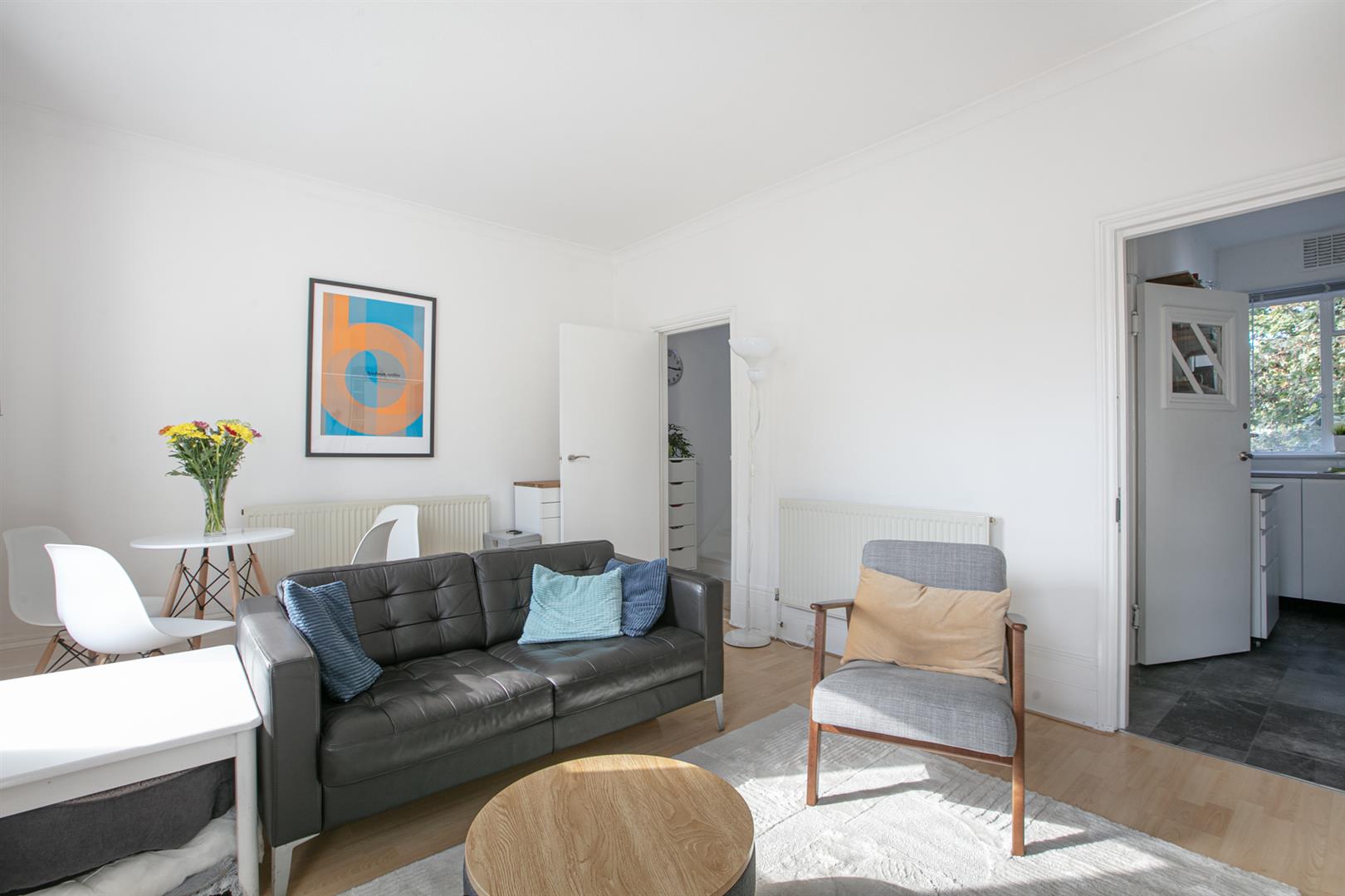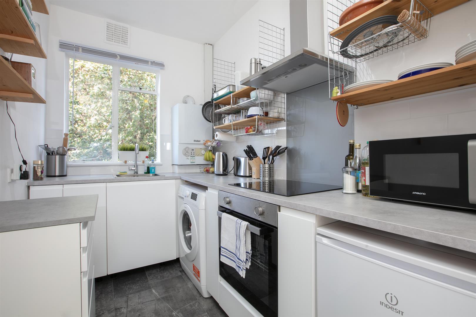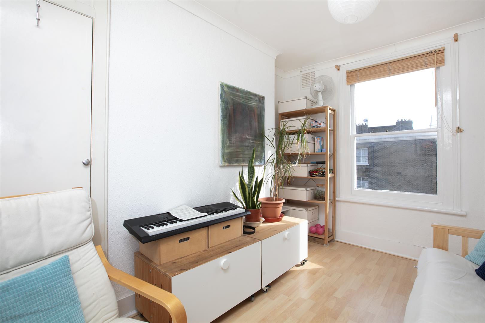 A private entrance invites you up a set of steps to the front of the building. Your inner private hall offers the perfect spot for coat, brollies and bikes. Upward bound to the first floor you find the reception fronts the street into full-width. There are two sash windows, gas fire, and plenty of space for lounging, dining and entertaining. The kitchen adjoins rear with a leafy aspect, fresh tiling, four ring induction hob and oven. Next to this you meet an as-new bath with funky 1930's Crittall window.