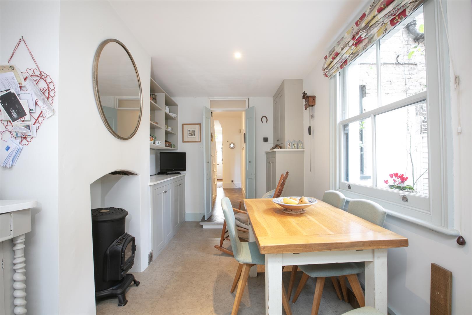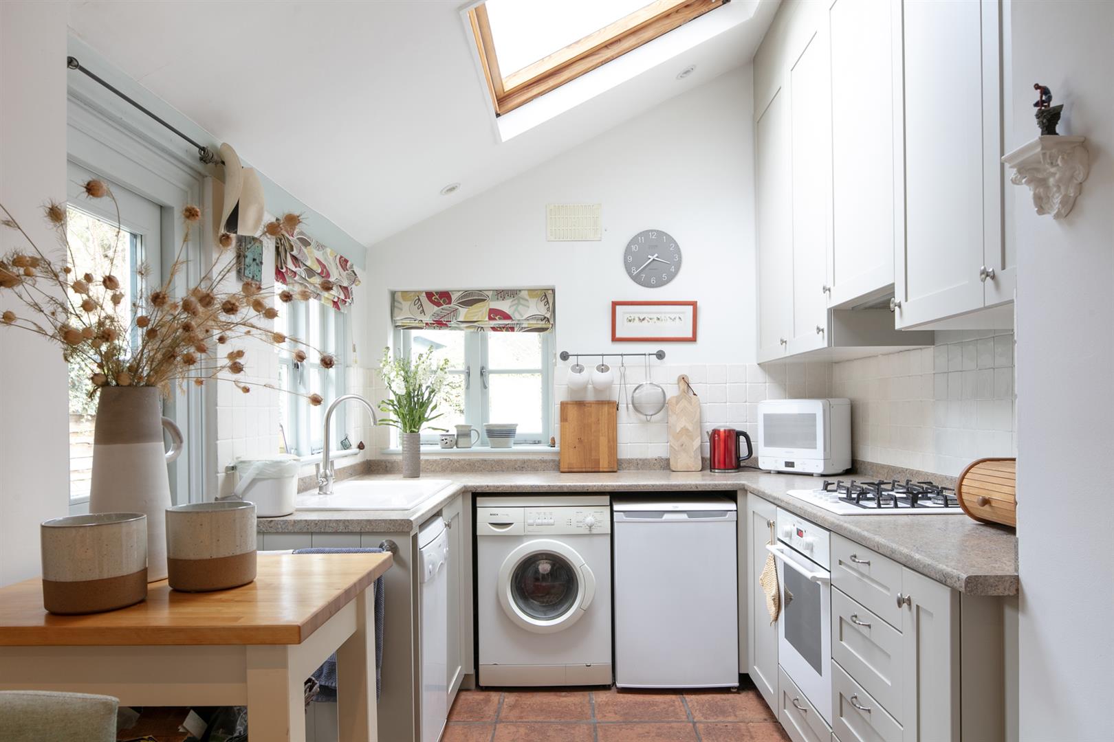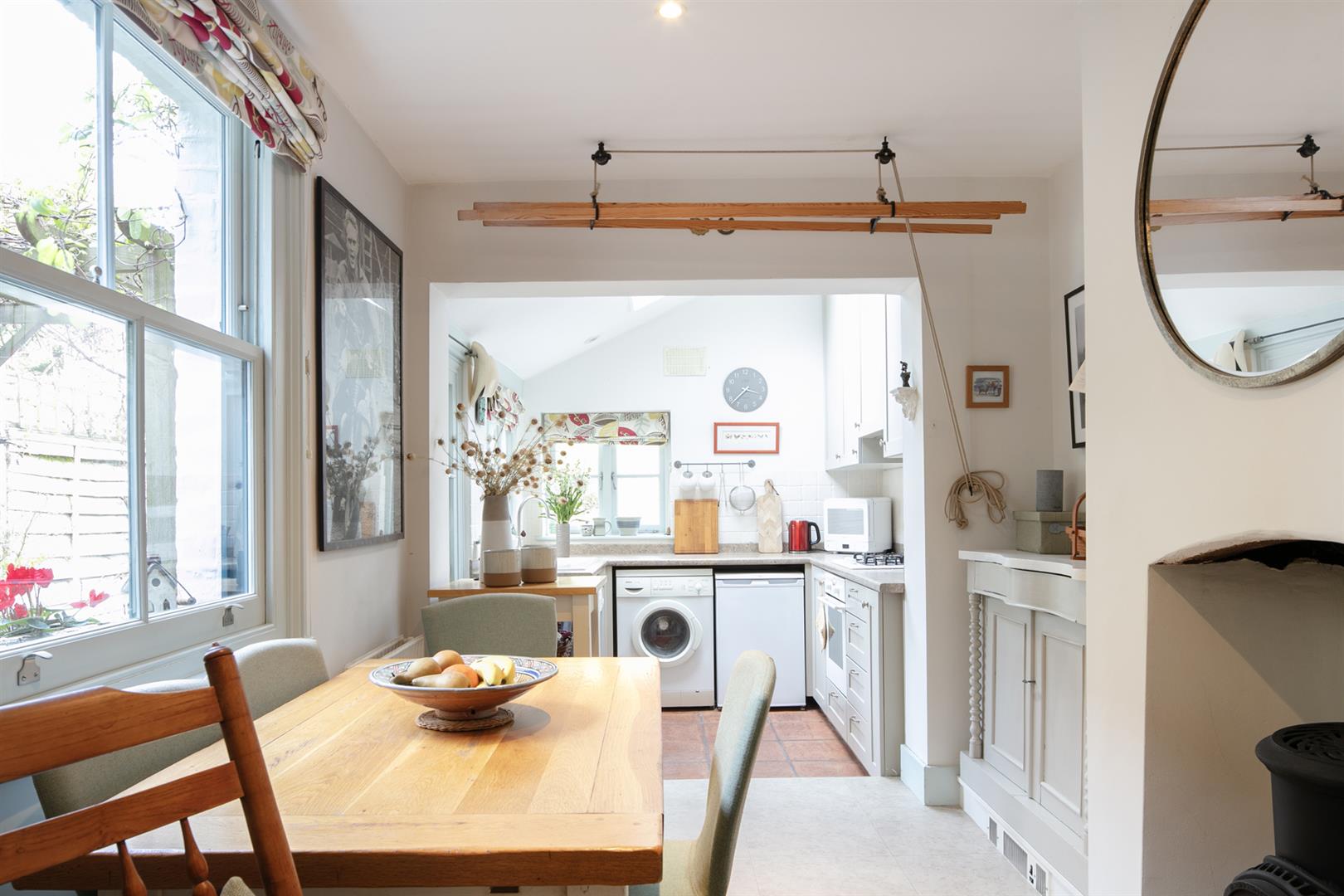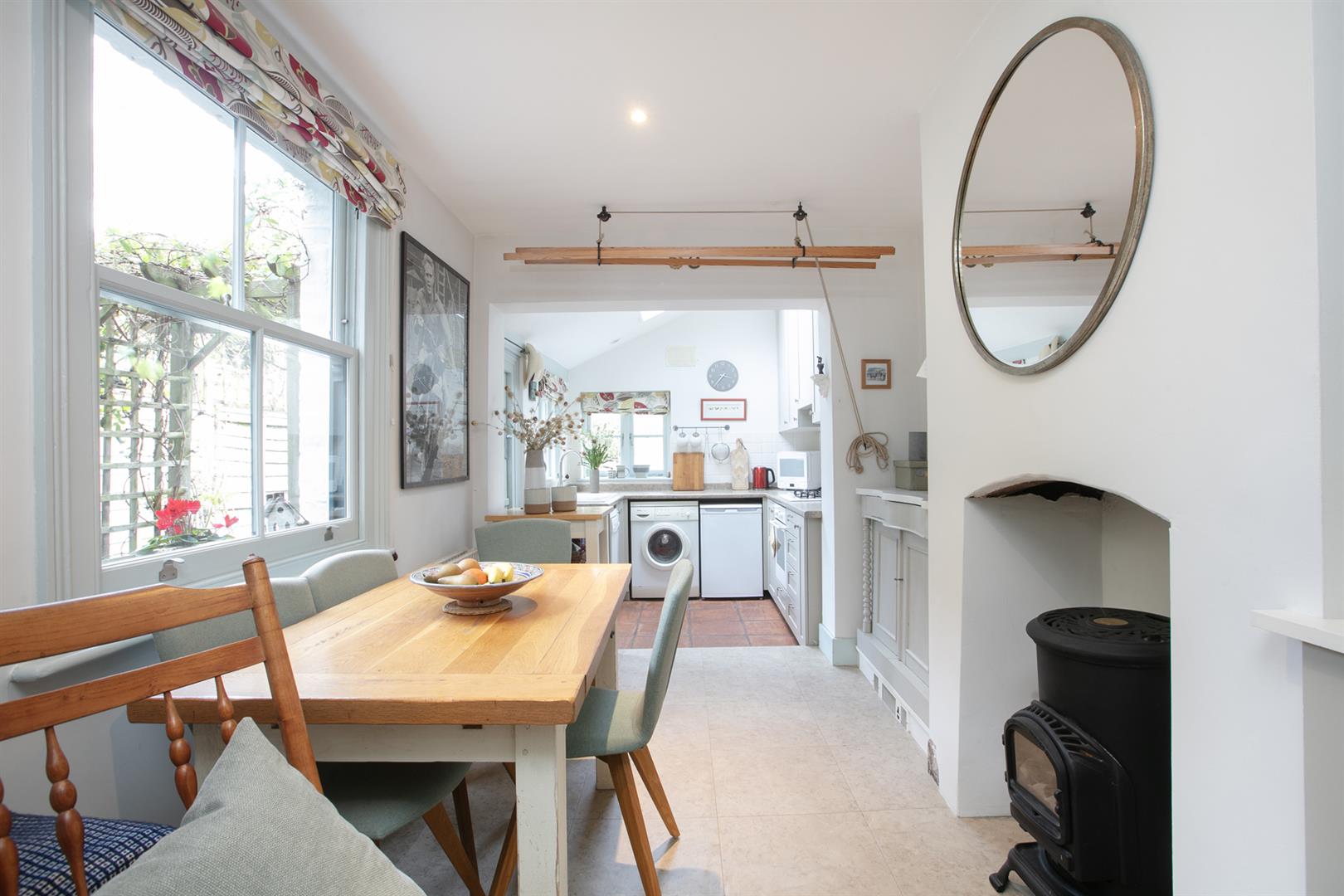 Further along the hall you meet an original staircase which ingeniously houses the tumble dryer and further low level storage for this and that. The kitchen/diner stretches confidently forth with a lovely side facing sash window offering light over the dining area. There's plenty of storage and the cooking area has counter and cabinet space on three sides. Appliances include a four ring gas hob, oven and there's a pretty ceramic sink and drainer. There is a half-glazed stable door leading out to the garden and dual aspect casement window offering more lovely views. Here you'll enjoy pretty brick planters, mature bay and willow trees, agapanthus and roses. There is a raised decking area at the end of the garden, which catches the evening sun in the summer and a narrow pond runs half the length of the garden, containing a water lily, irises, oxygenating plants, newts and the occasional frog!