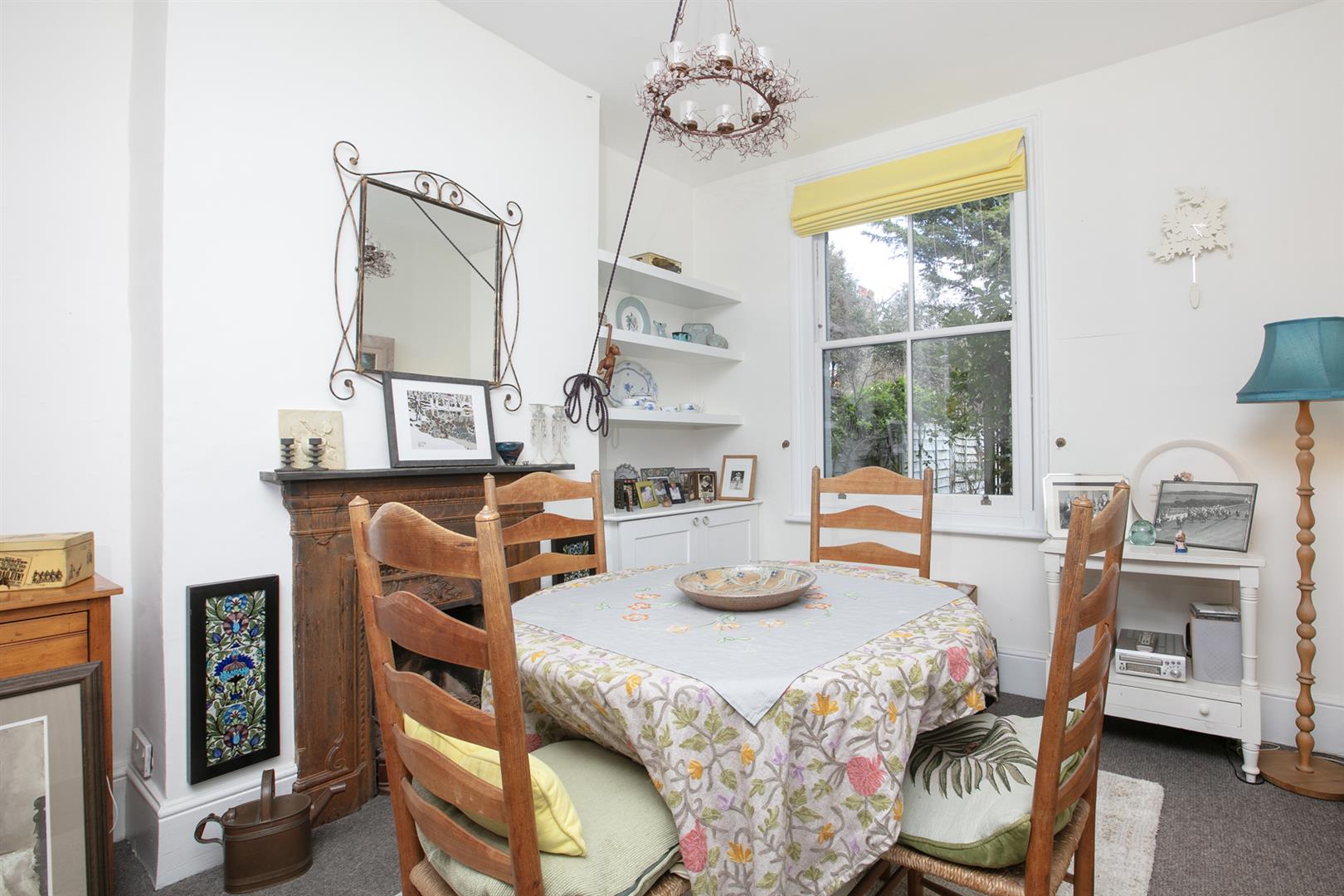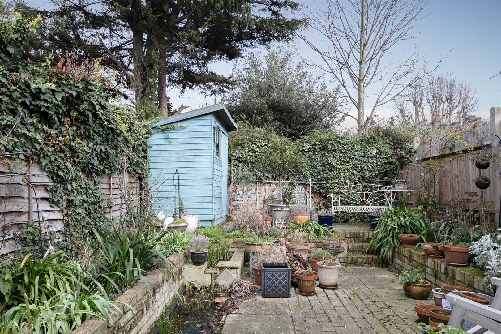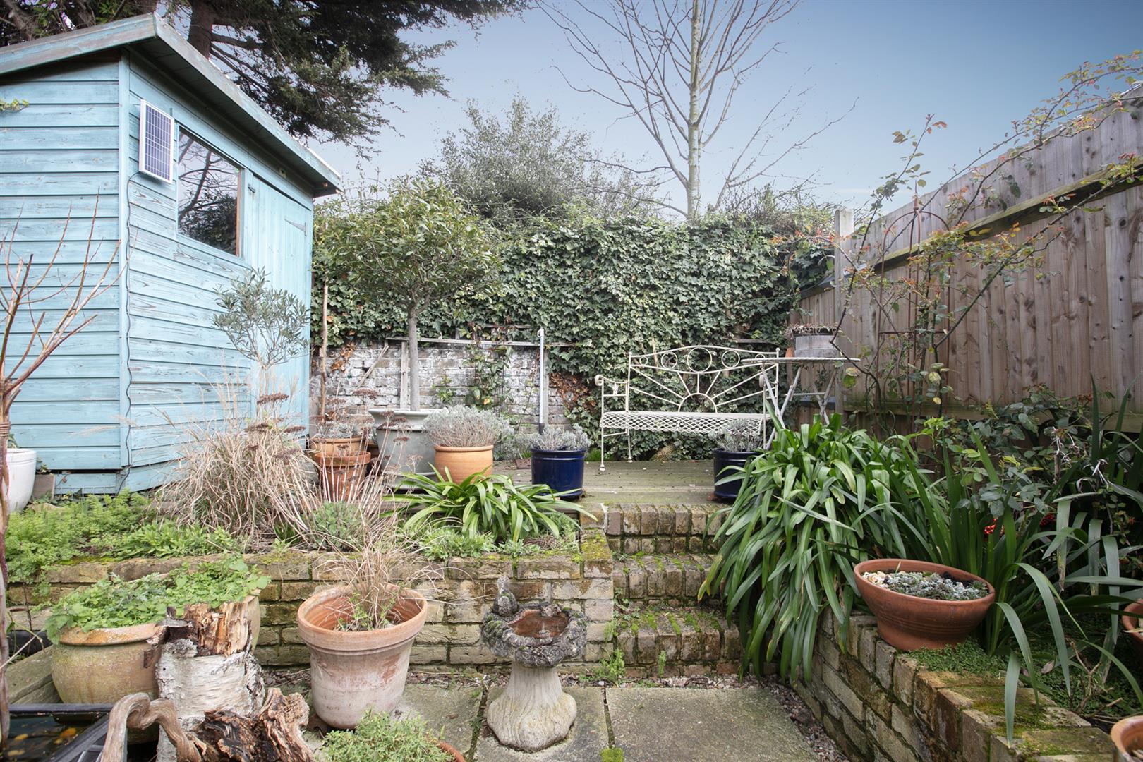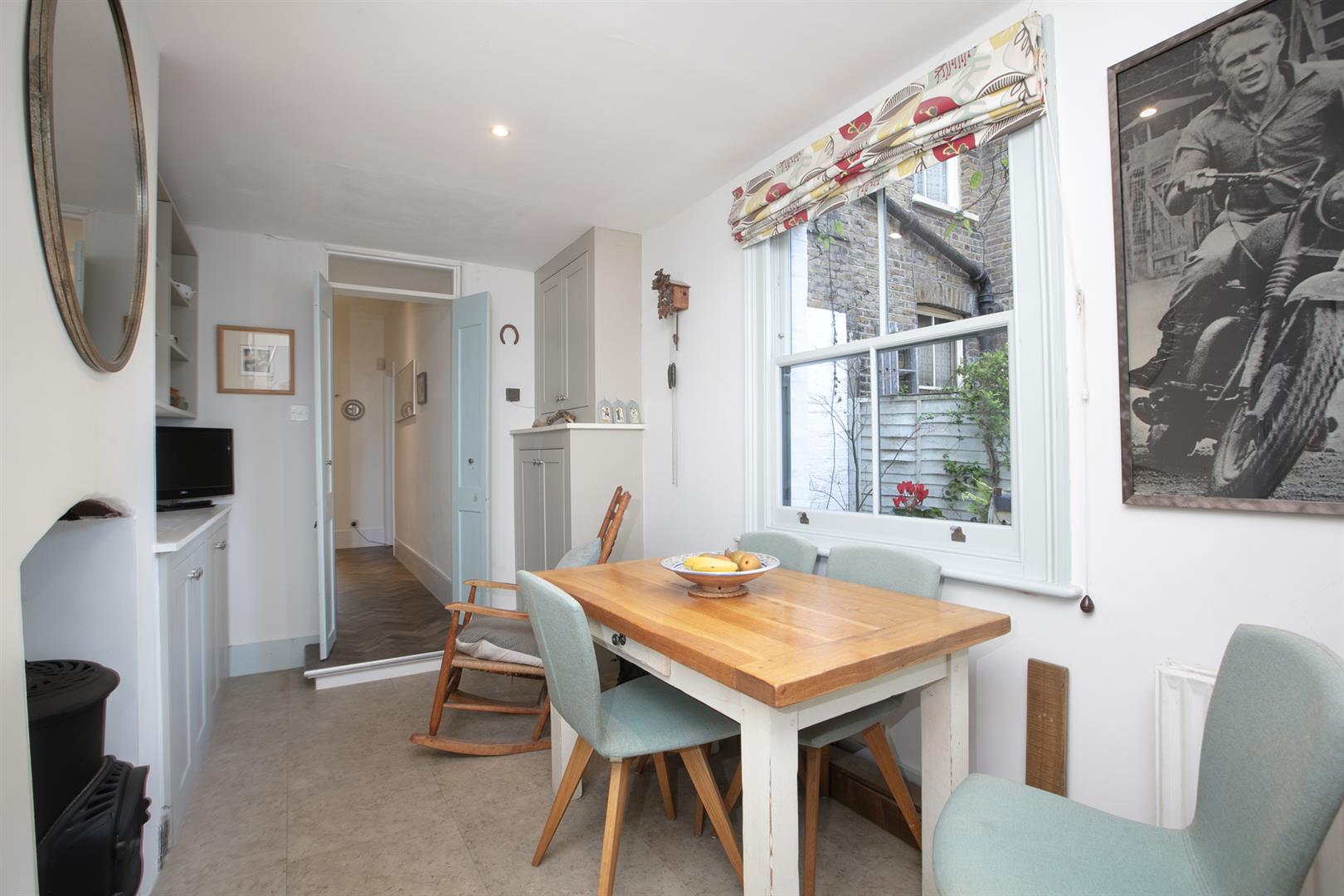 Further along the hall you meet an original staircase which ingeniously houses the tumble dryer and further low level storage for this and that. The kitchen/diner stretches confidently forth with a lovely side facing sash window offering light over the dining area. There's plenty of storage and the cooking area has counter and cabinet space on three sides. Appliances include a four ring gas hob, oven and there's a pretty ceramic sink and drainer. There is a half-glazed stable door leading out to the garden and dual aspect casement window offering more lovely views. Here you'll enjoy pretty brick planters, mature bay and willow trees, agapanthus and roses. There is a raised decking area at the end of the garden, which catches the evening sun in the summer and a narrow pond runs half the length of the garden, containing a water lily, irises, oxygenating plants, newts and the occasional frog!