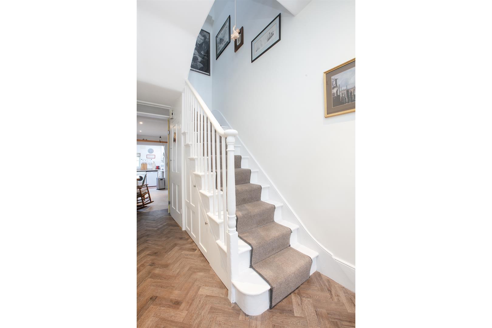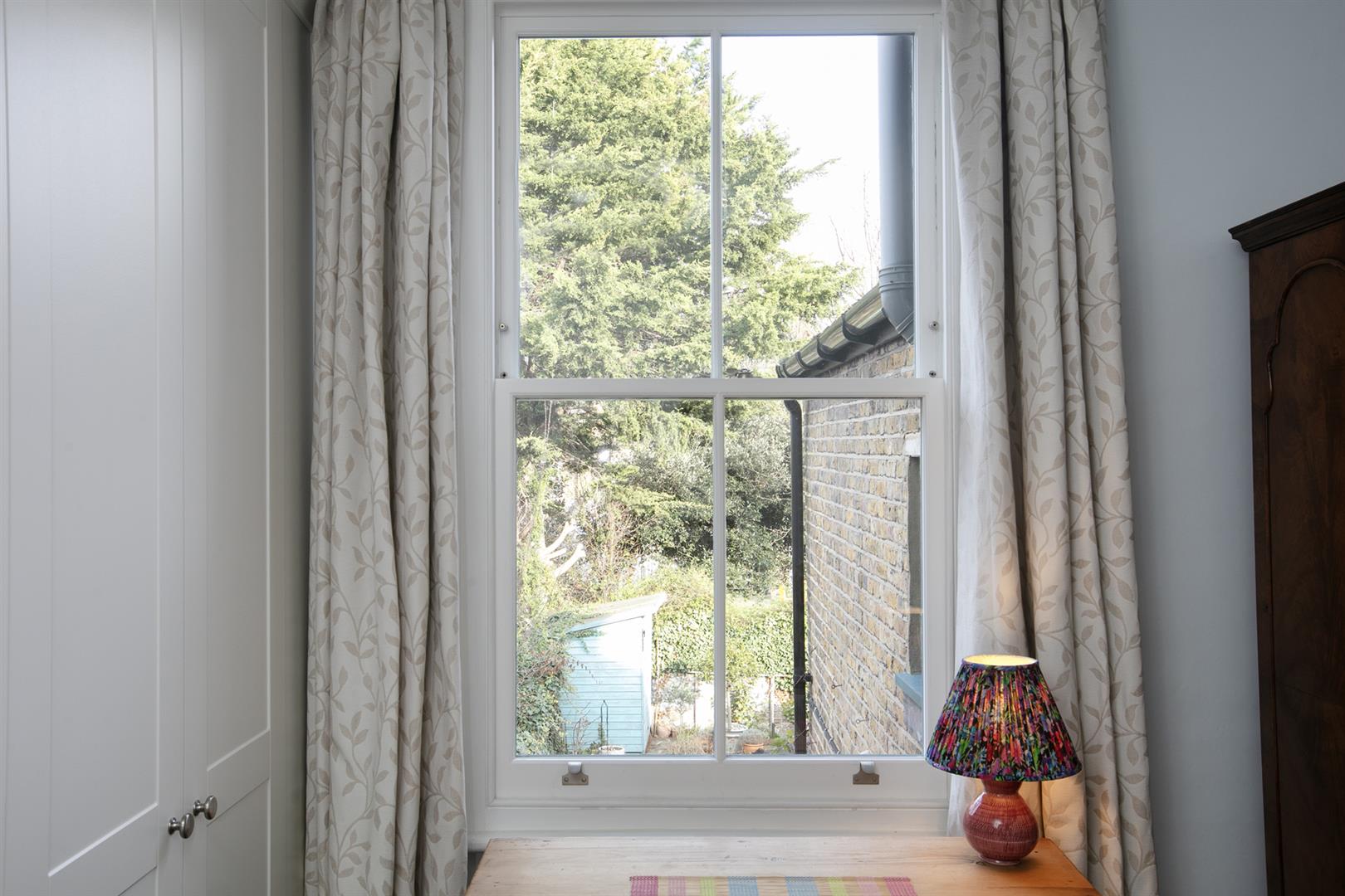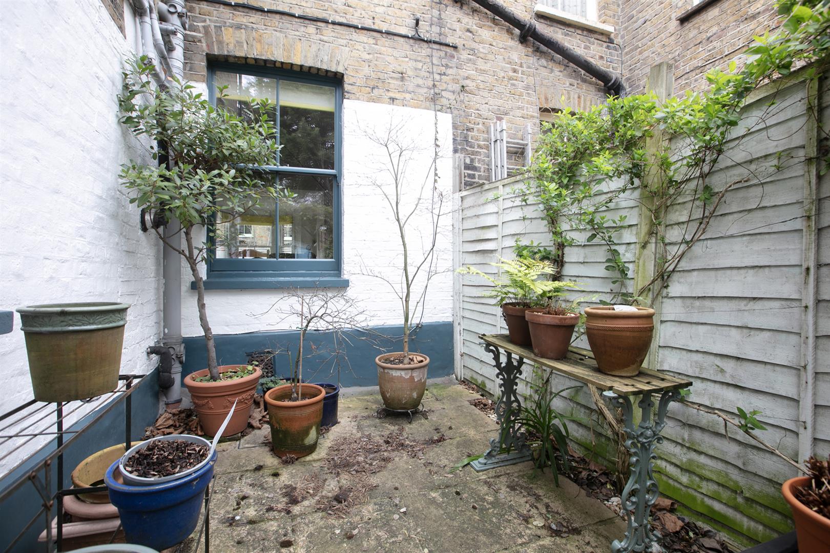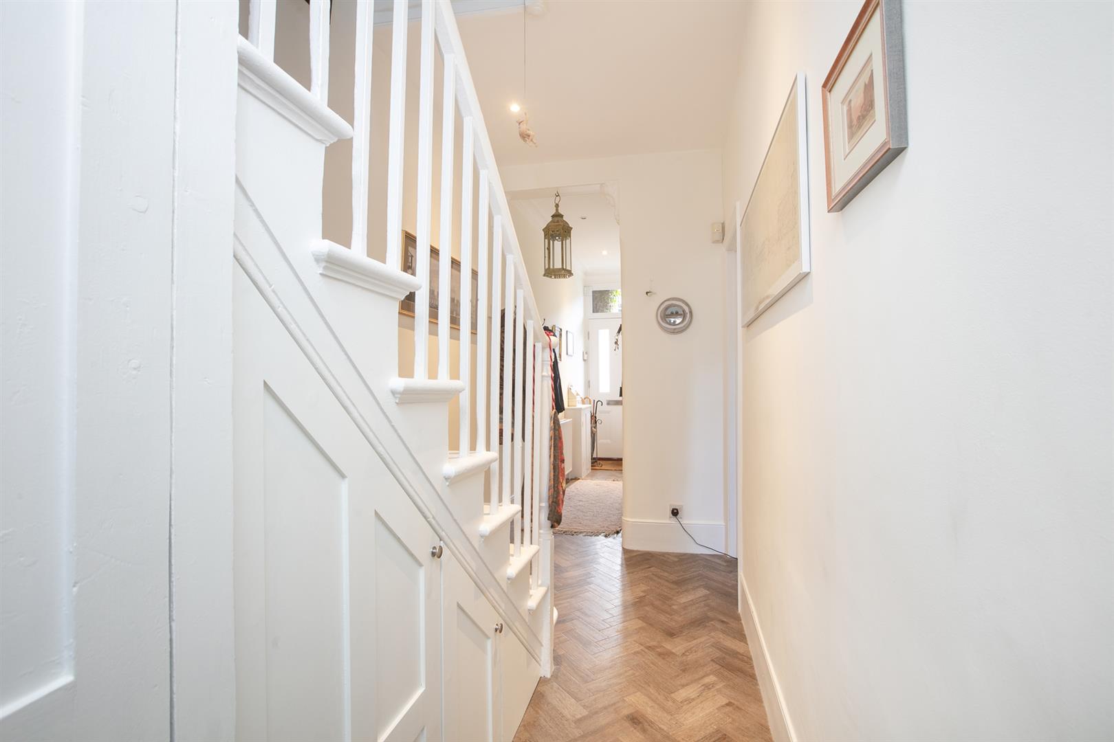 Further along the hall you meet an original staircase which ingeniously houses the tumble dryer and further low level storage for this and that. The kitchen/diner stretches confidently forth with a lovely side facing sash window offering light over the dining area. There's plenty of storage and the cooking area has counter and cabinet space on three sides. Appliances include a four ring gas hob, oven and there's a pretty ceramic sink and drainer. There is a half-glazed stable door leading out to the garden and dual aspect casement window offering more lovely views. Here you'll enjoy pretty brick planters, mature bay and willow trees, agapanthus and roses. There is a raised decking area at the end of the garden, which catches the evening sun in the summer and a narrow pond runs half the length of the garden, containing a water lily, irises, oxygenating plants, newts and the occasional frog!