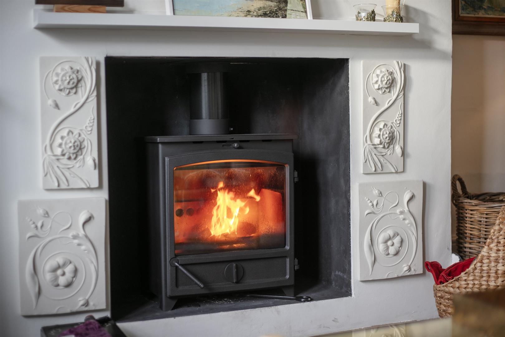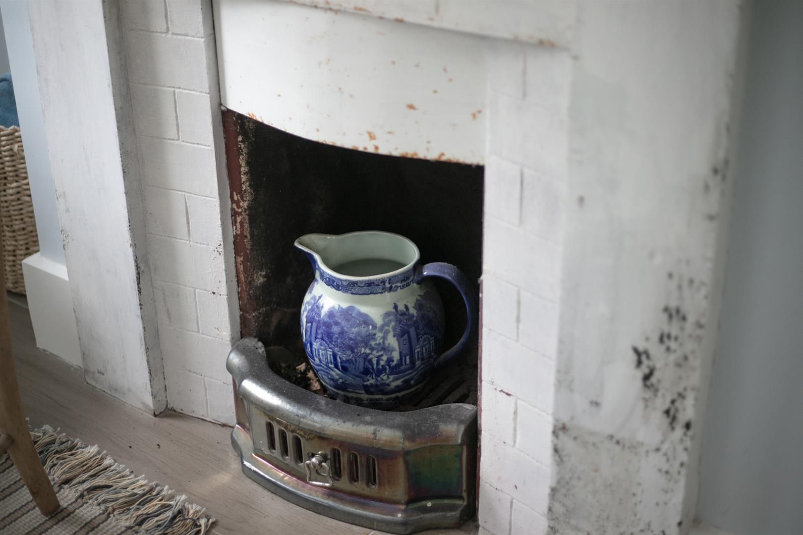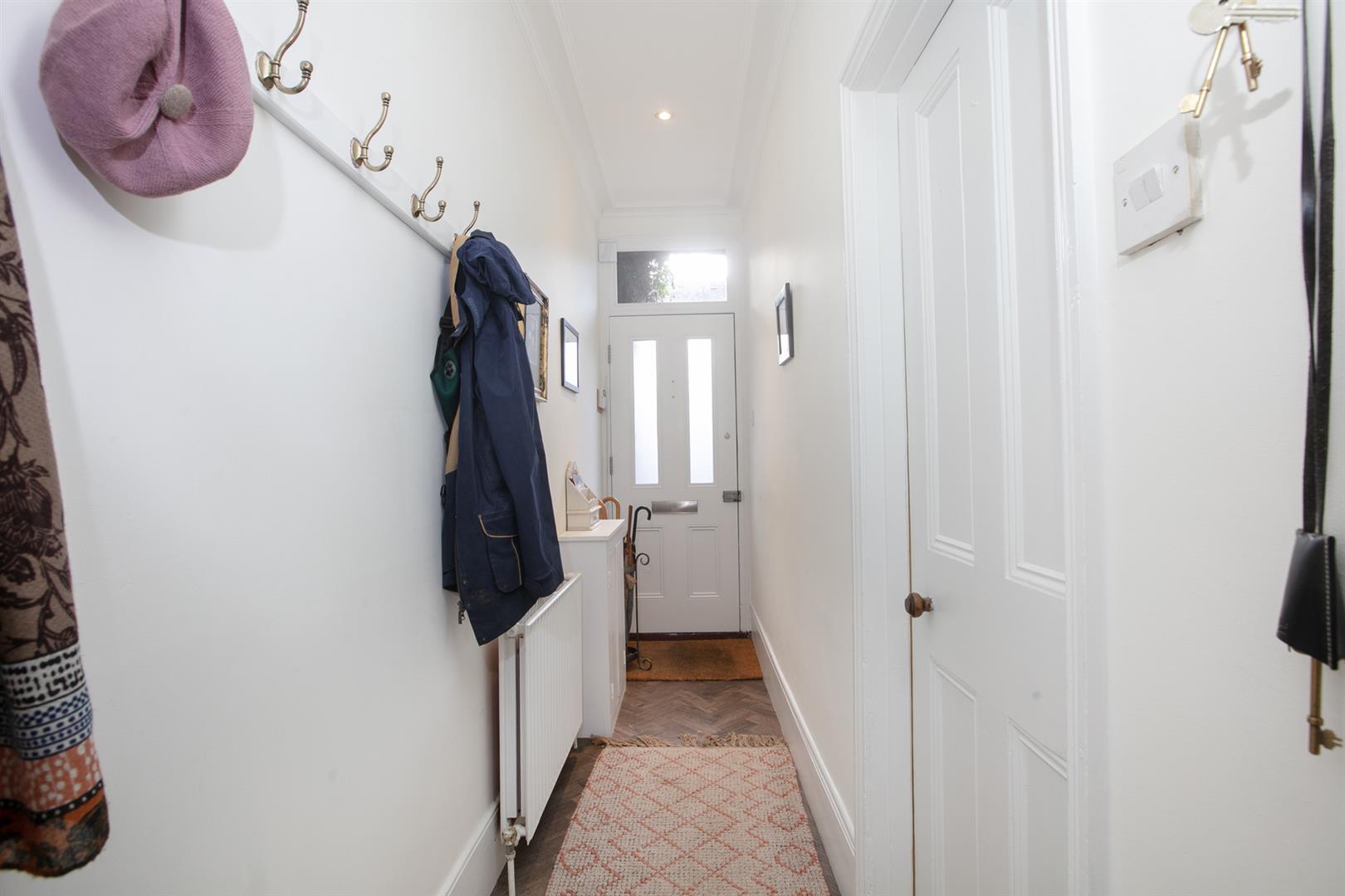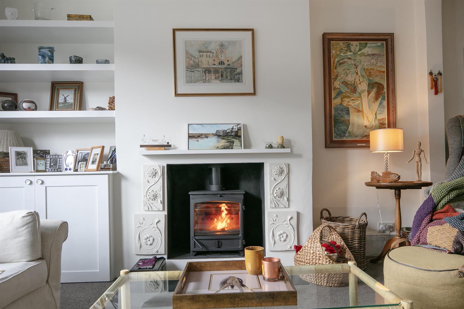 The handsome exterior sits behind a neat garden with hedging. The inner hall has high ceilings, crisp walls, simple coving and some lovely Amtico herringbone flooring. The double carpeted reception is simply delightful - homely yet spacious and with a fab wood burner. An additional feature mantel sits to the rear along with shelving. Both ends of the space enjoy bespoke storage. A front aspect bay of double glazed sash windows and a further rear facing sash supply abundant light and pleasant views.
