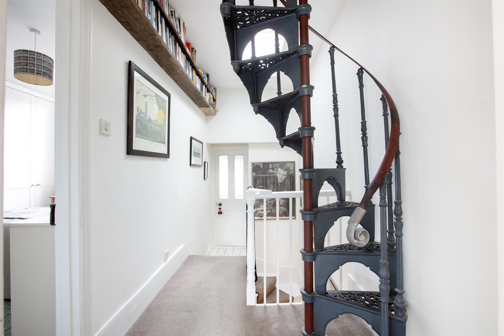 Trotting upstairs you find white painted treads and risers on the stairs complimented perfectly by a quality runner. The bathroom is simply delightful - boasting a Kohler suite, deep, contemporary freestanding bath, double walk-in shower and a period feature fireplace for good measure. Your master bedroom fronts the street and sparkles in wonderful westerly light. Bespoke wardrobes flank either side of a period feature fireplace. Bedroom two is another lovely double and has a further period feature fireplace and storage. A fancy wrought iron spiral staircase curls upward from the first landing to your fab loft room.