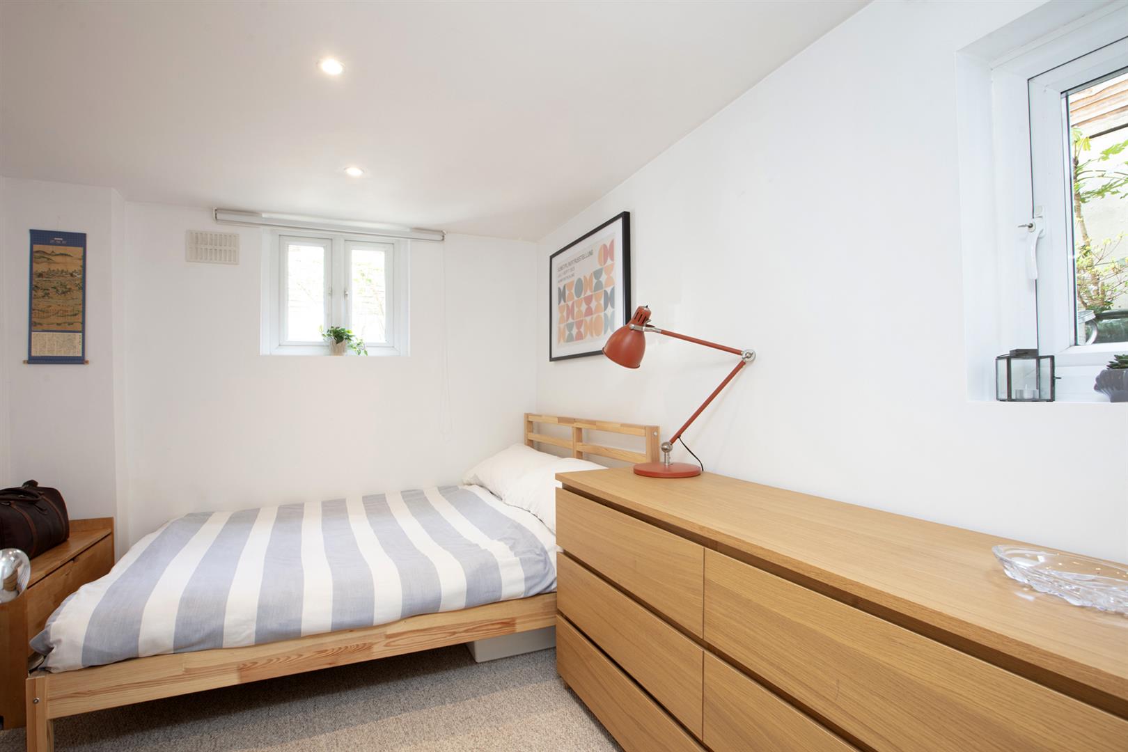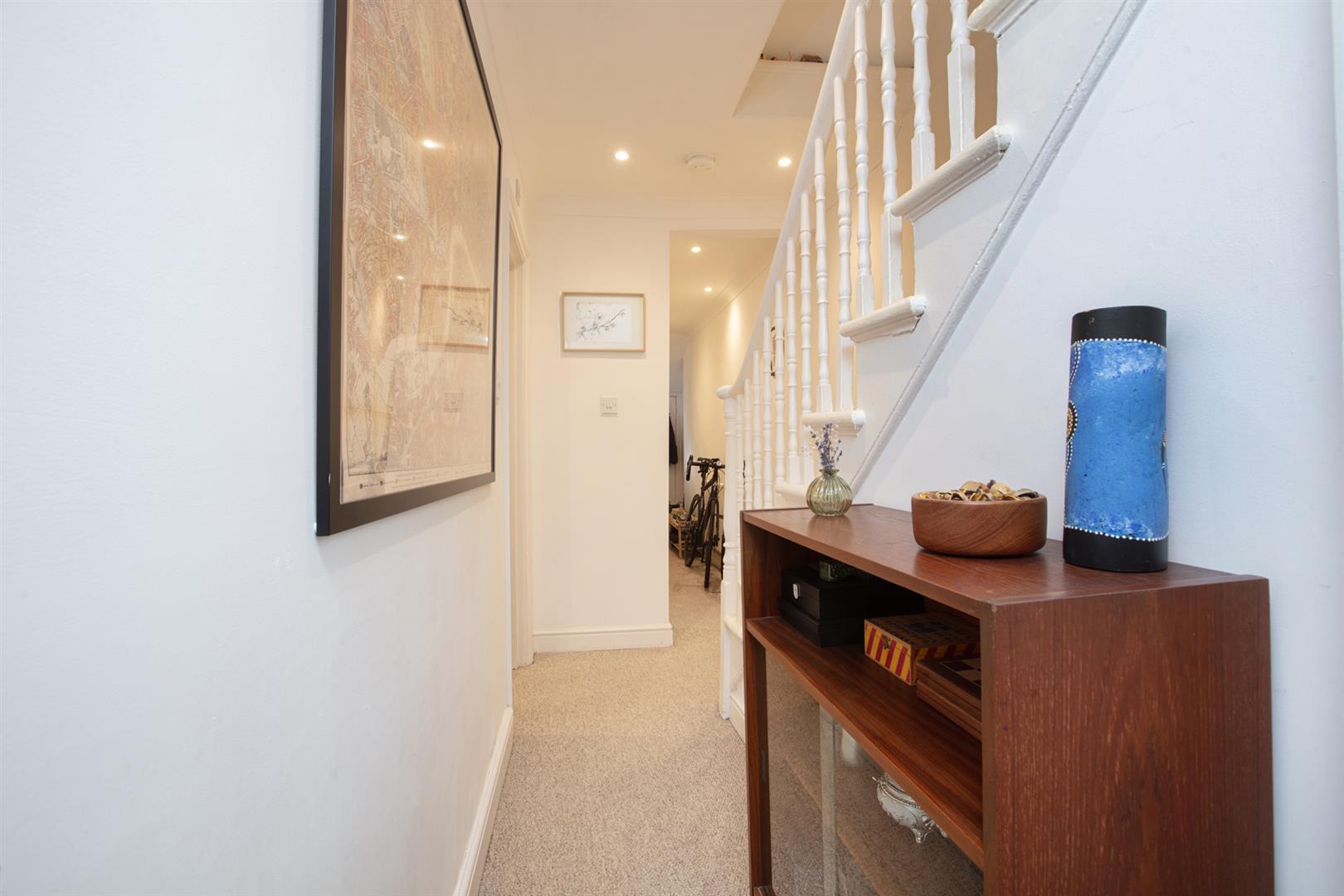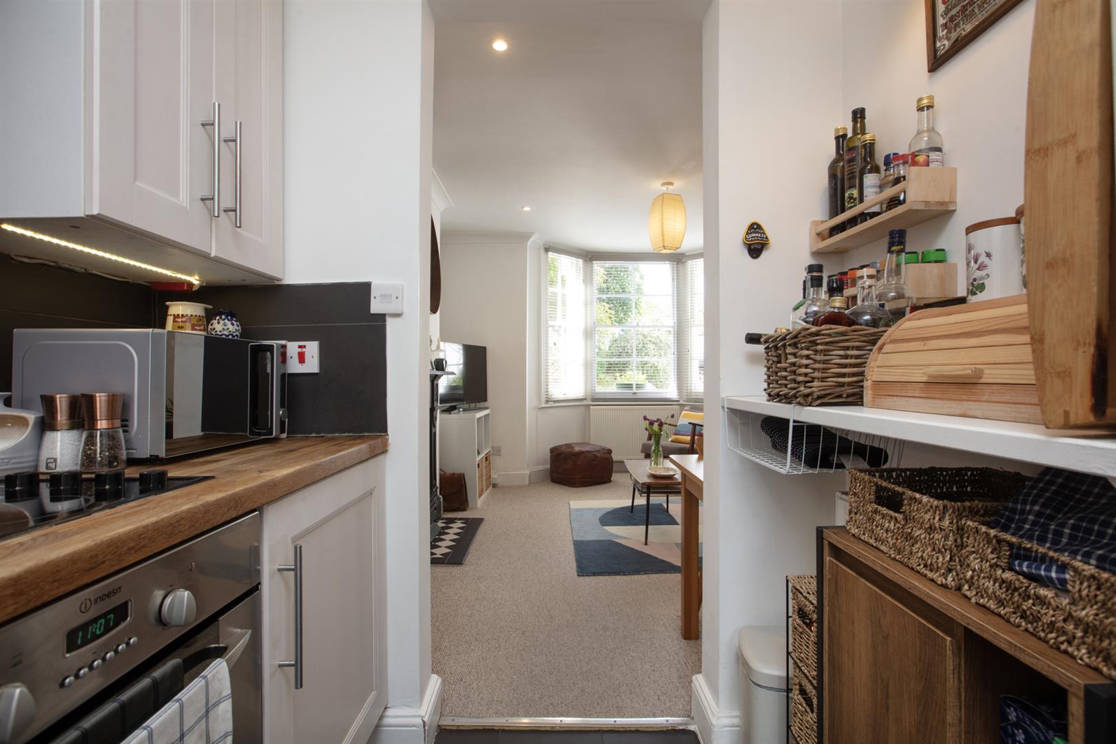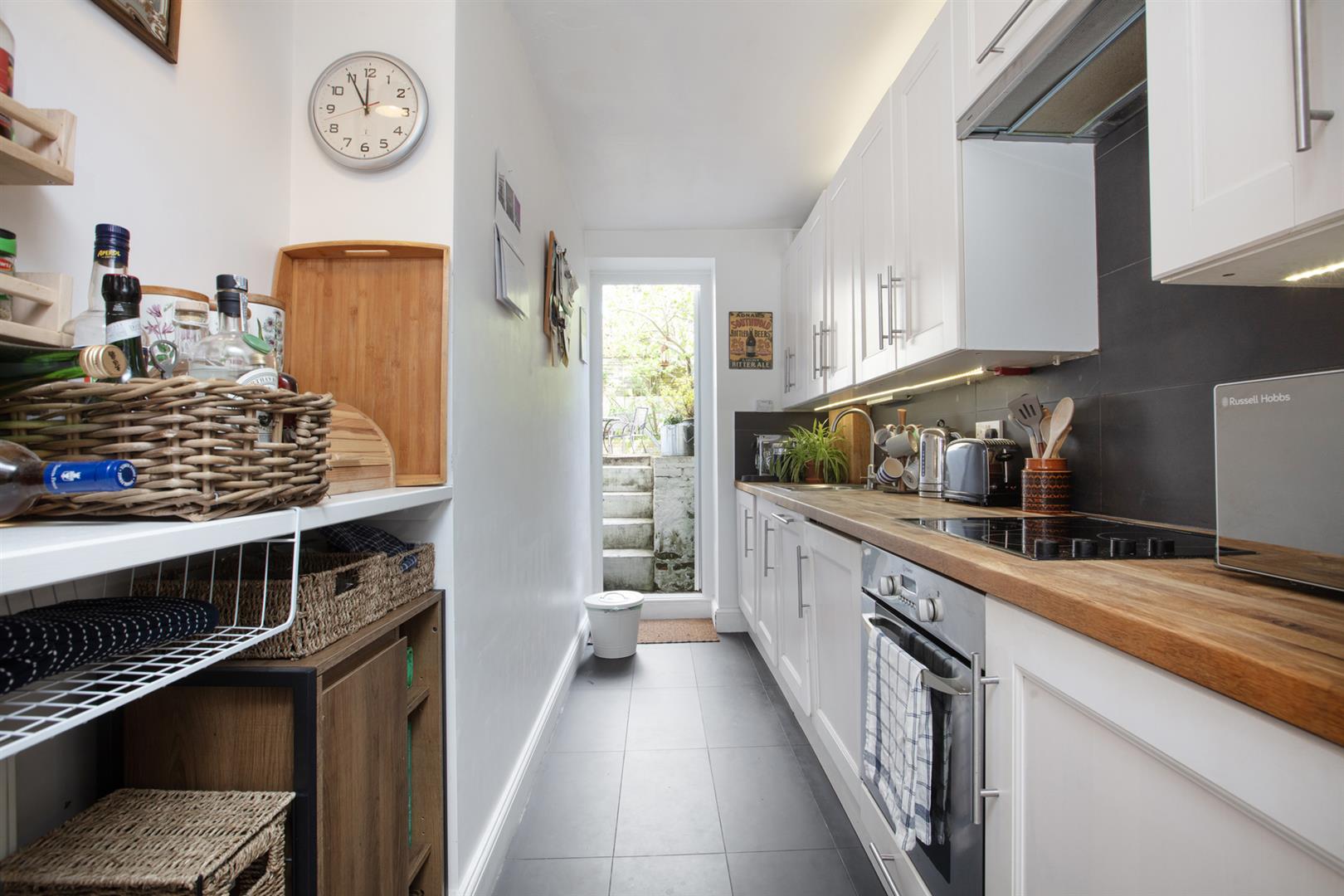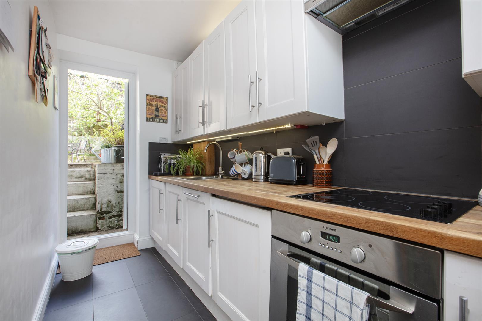 Enter through your own private entrance on the lower ground floor. Your inner hall offers a recessed storage point. The front facing reception is a pleasantly bright room with an ever so lovely feature fireplace. A front bay of sash windows peers over the front garden which is nicely stocked with greenery. The open arch leads rear to your well equipped contemporary kitchen where a handy shelf allows for dining. To the rear you'll gain access to the lower section of the garden. Back inside, you meet the bathroom, with fresh white suite. After this, a further storage point precedes your first bedroom which too has a storage cupboard. Head upward to the upper ground floor to find the second bedroom which in turn leads to the upper section of the garden. Your olive tree will supply all you need for the house warming tapenade.