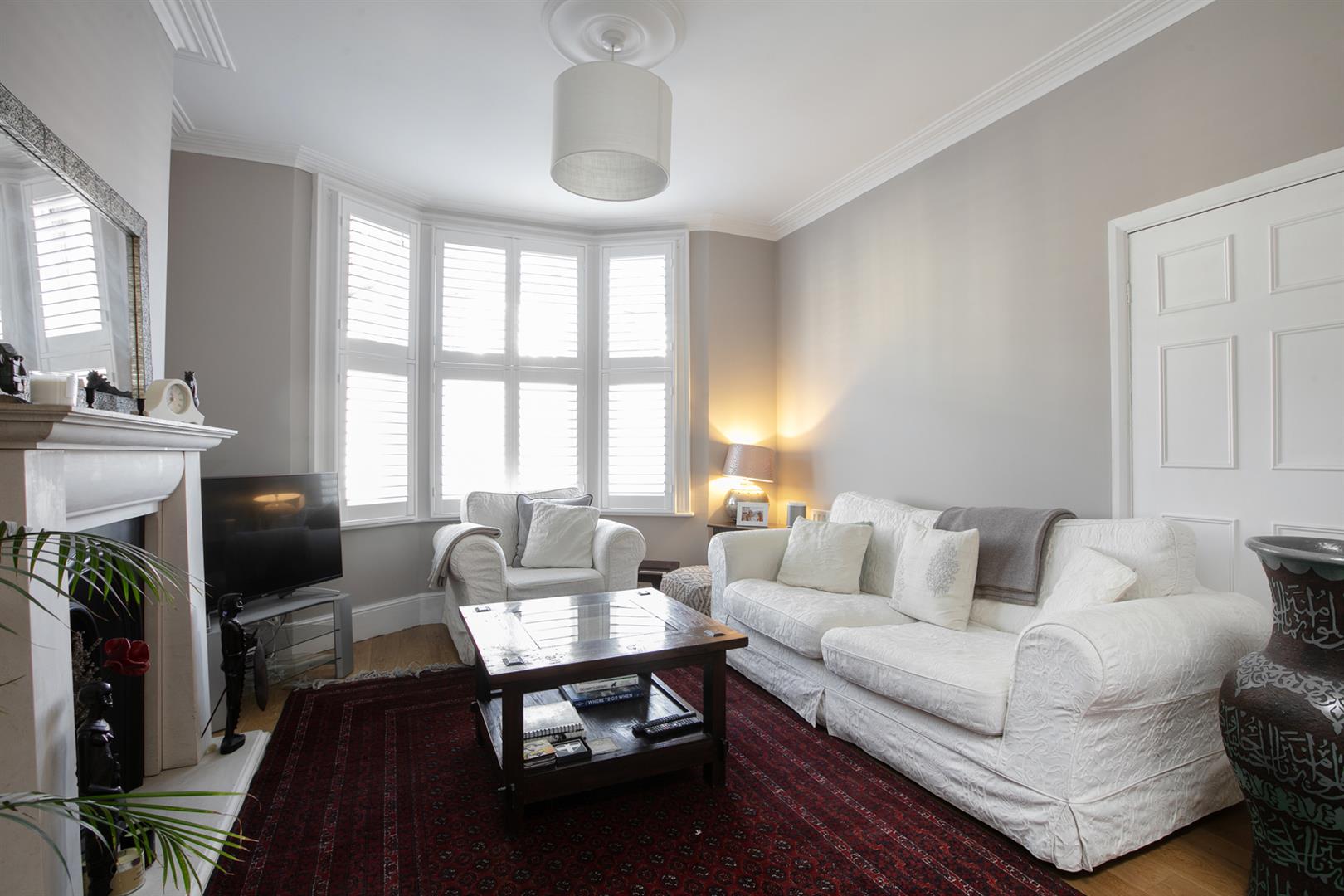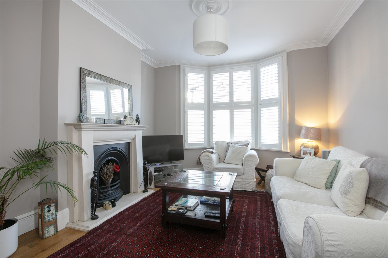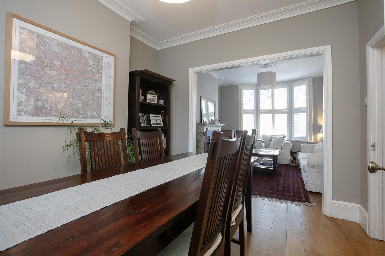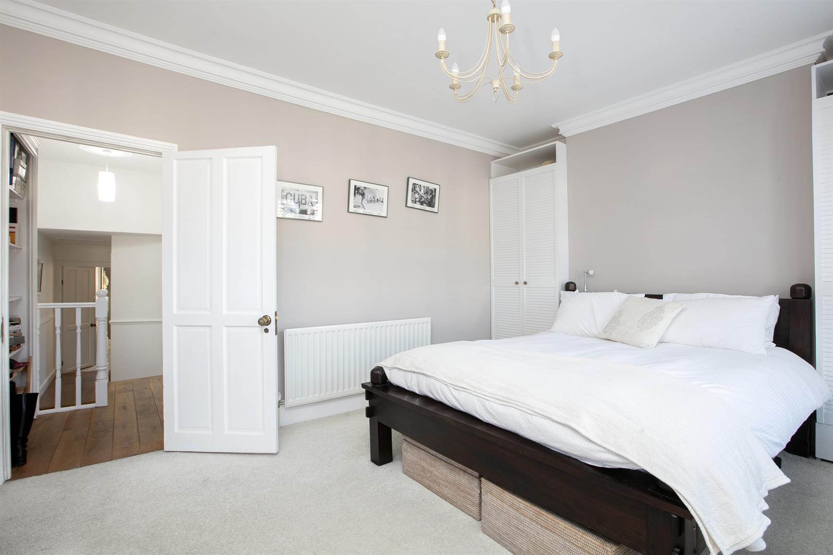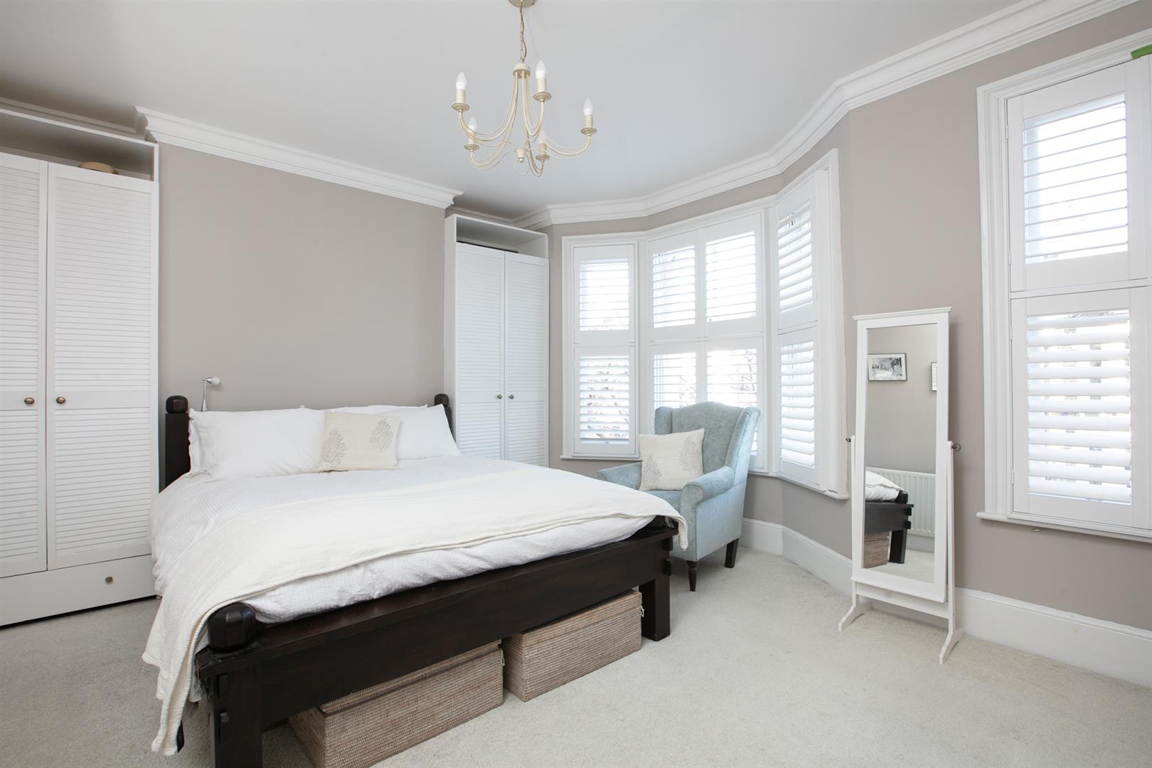 Upward to the first return you meet a wonderful rear facing double bedroom with fitted storage, plantation shutters and dishy grey walls. The family bathroom neighbours this offering a roll top freestanding bath, period style suite and gorgeous wooden panelling to dado level. The stairs boasts delightful wooden treads and risers to add to the charm. The upper landing has fitted shelving. This precedes bedroom two which is another lovely double with fitted storage and a dainty period feature fireplace. The master bedroom fronts the street through the bay with has yet more fitted storage and plantation shutters.