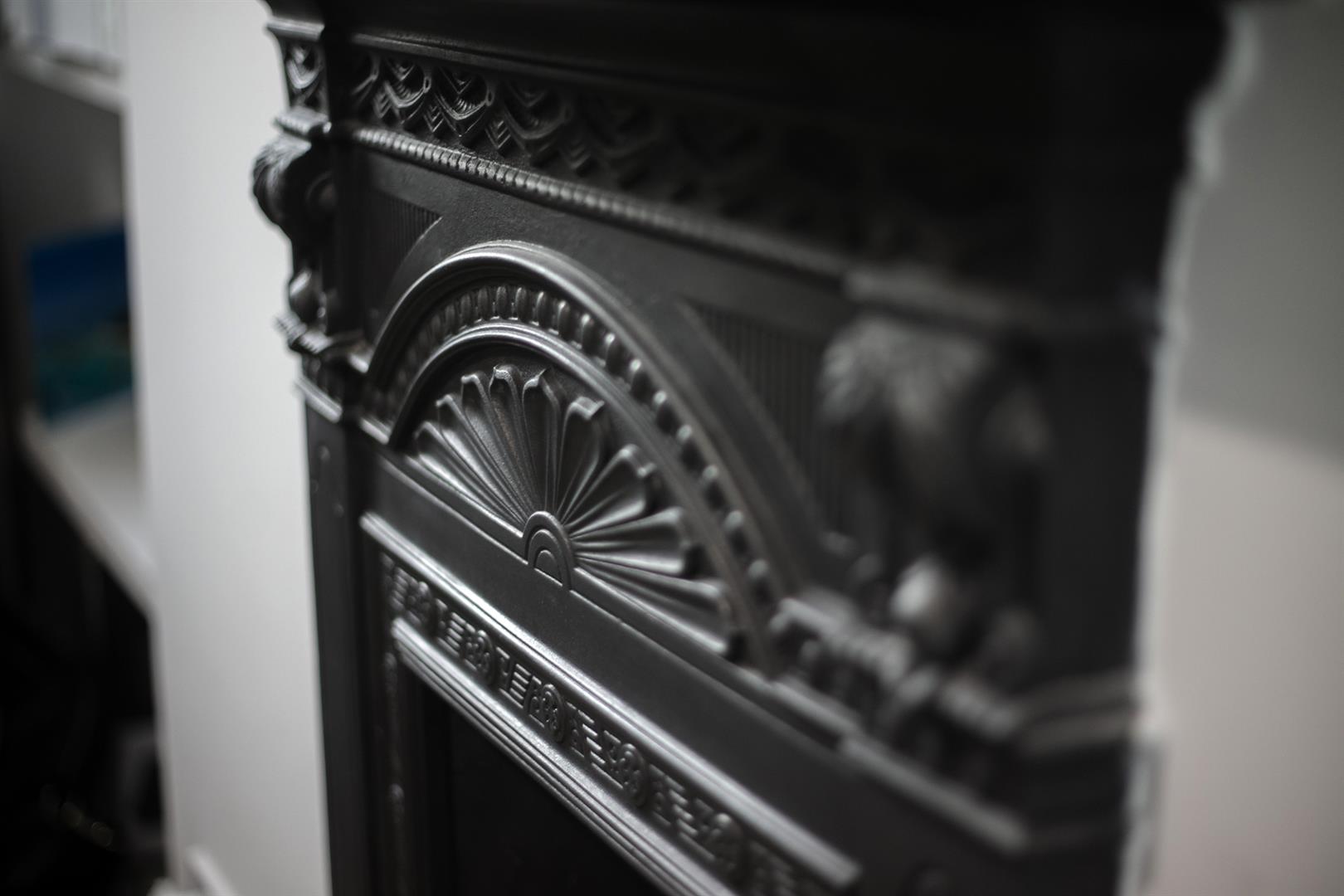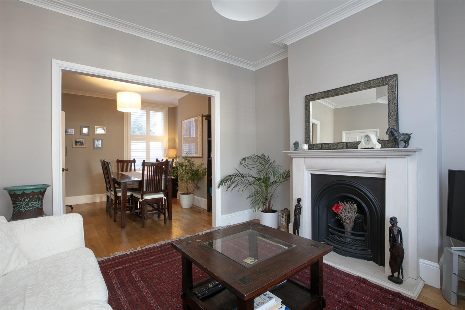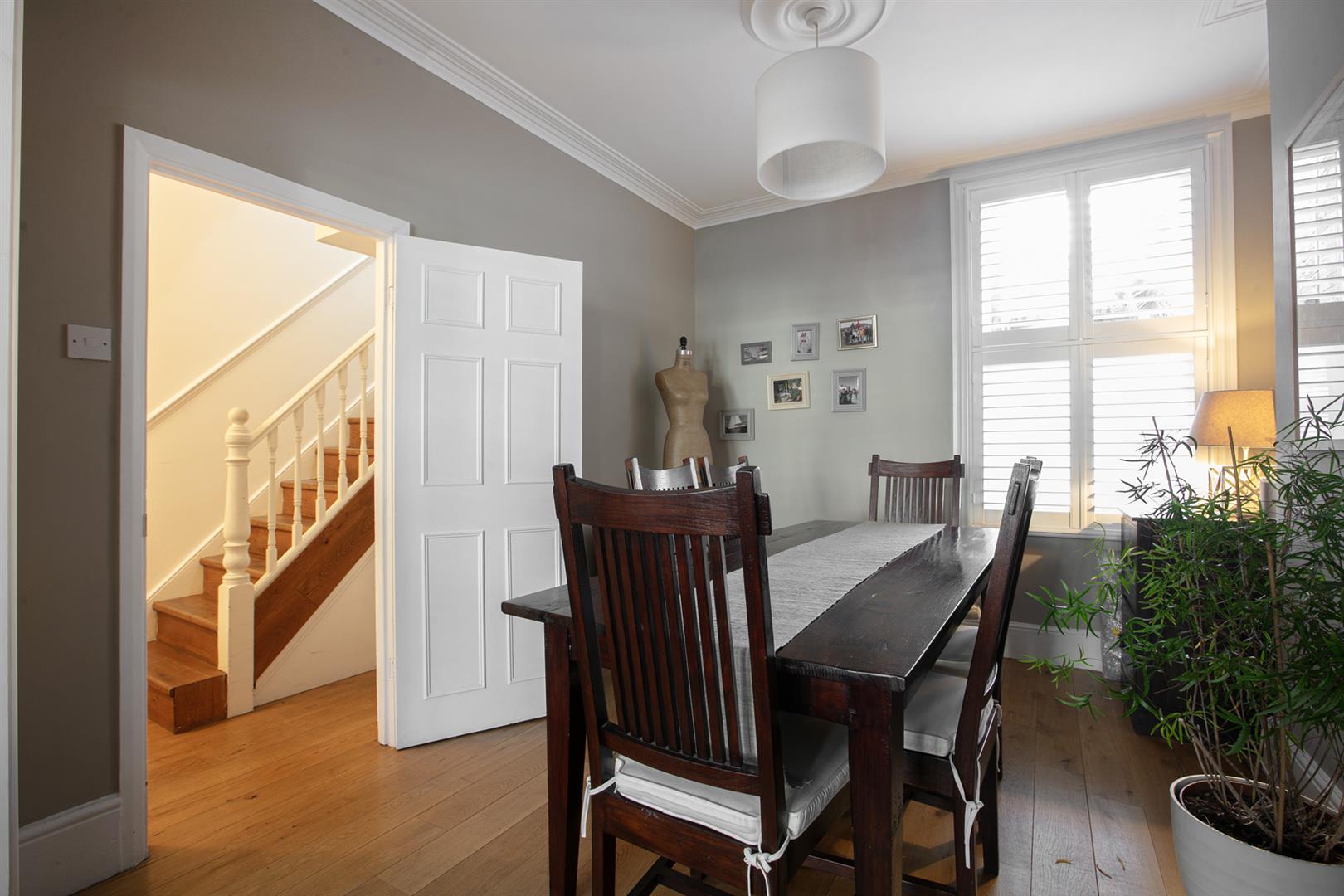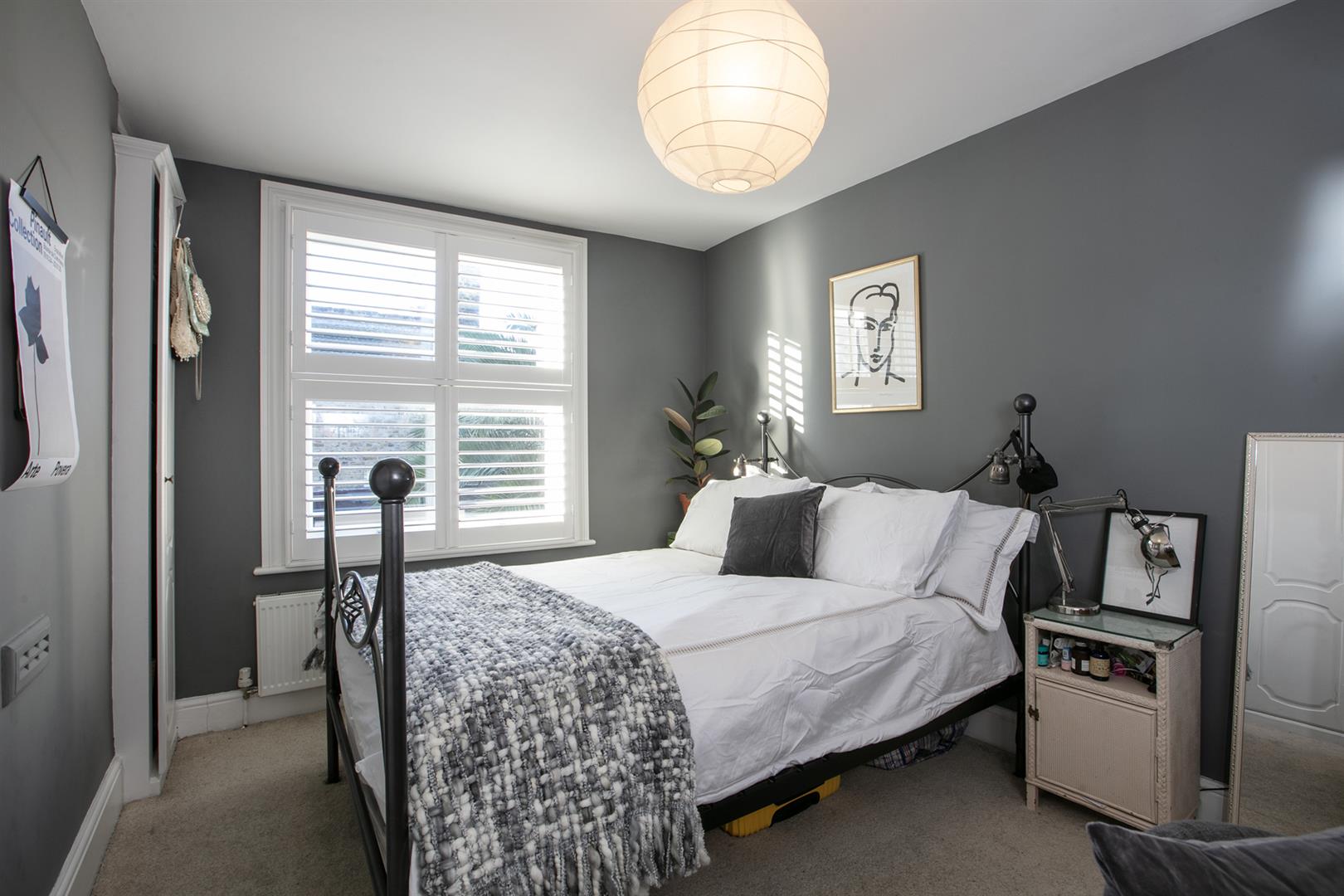 Upward to the first return you meet a wonderful rear facing double bedroom with fitted storage, plantation shutters and dishy grey walls. The family bathroom neighbours this offering a roll top freestanding bath, period style suite and gorgeous wooden panelling to dado level. The stairs boasts delightful wooden treads and risers to add to the charm. The upper landing has fitted shelving. This precedes bedroom two which is another lovely double with fitted storage and a dainty period feature fireplace. The master bedroom fronts the street through the bay with has yet more fitted storage and plantation shutters.