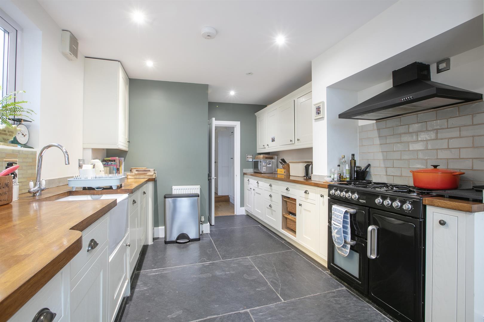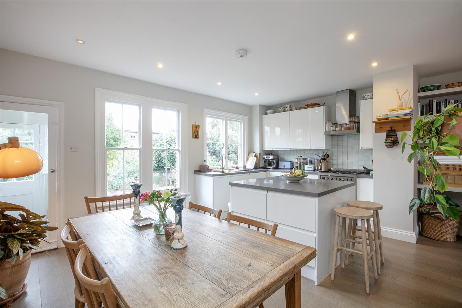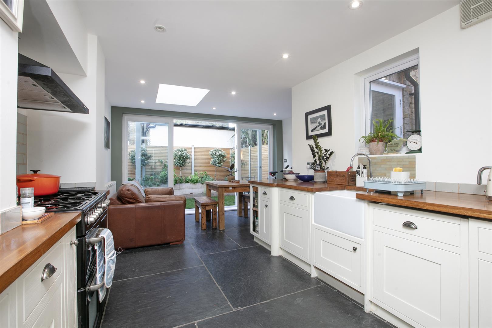 A wall of double fitted storage sits opposite the shower room which benefits from yummy tiling, double walk-in shower and two side aspect frosted windows. The kitchen/diner is a really great space - stretching to full width at the rear and offering access to two separate patio gardens. It's well presented with solid counters, ceramic sink and shaker-style cabinets. Appliances include five ring gas range and an integrated dishwasher. A skylight and wall of glass to the rear frame a most pretty garden vista with seating area, raised sleeper planters and abundant greenery.