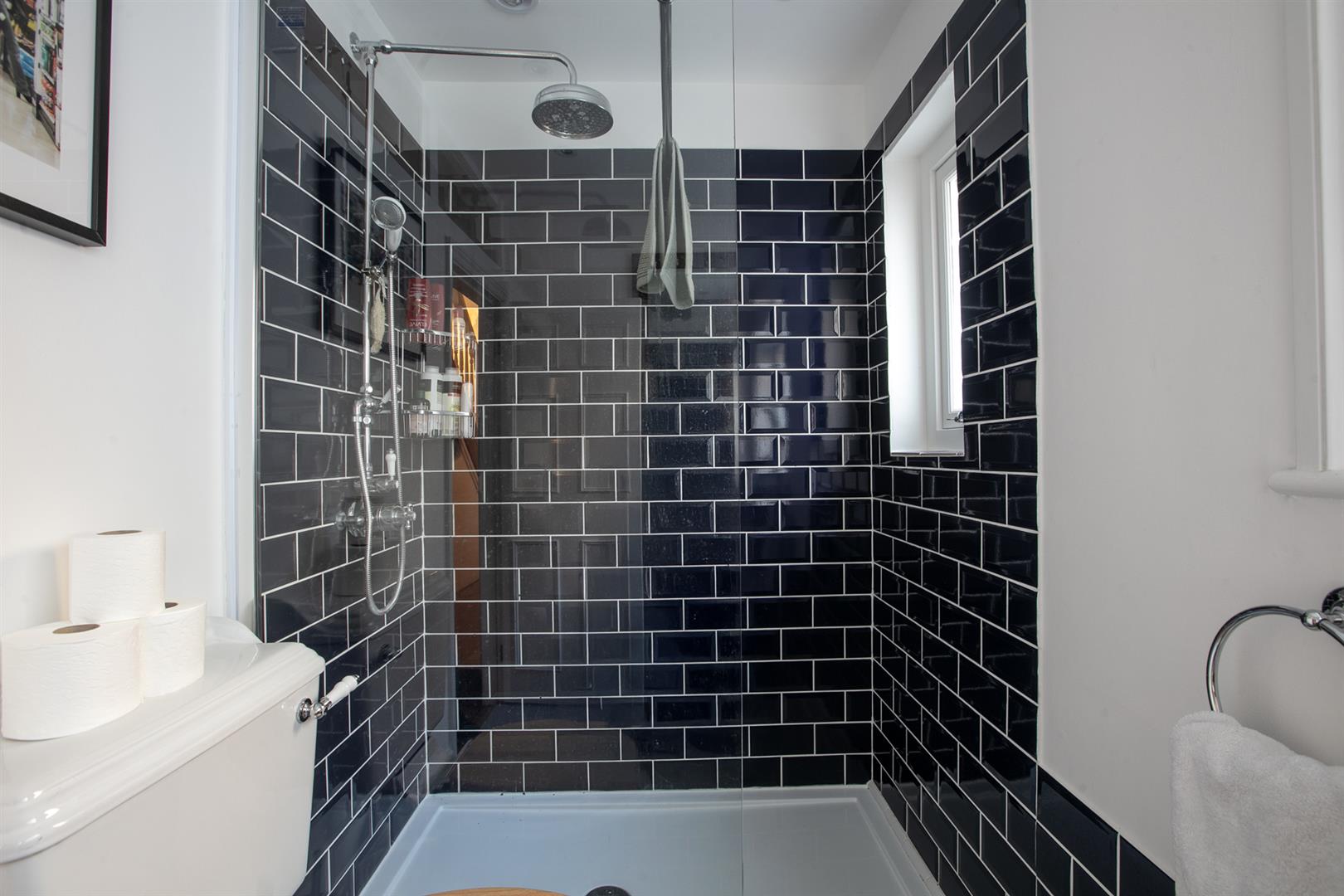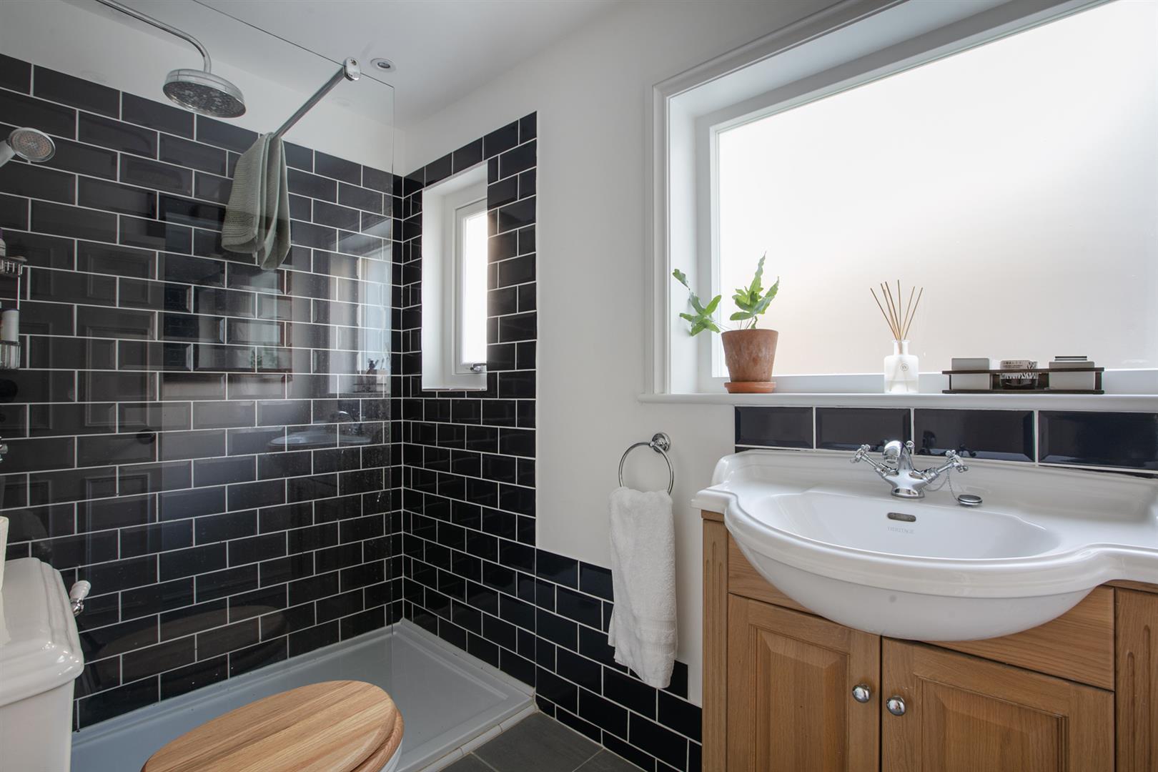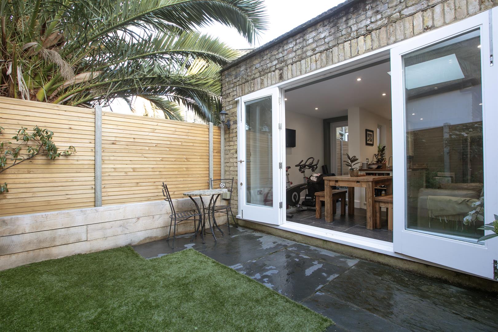 A wall of double fitted storage sits opposite the shower room which benefits from yummy tiling, double walk-in shower and two side aspect frosted windows. The kitchen/diner is a really great space - stretching to full width at the rear and offering access to two separate patio gardens. It's well presented with solid counters, ceramic sink and shaker-style cabinets. Appliances include five ring gas range and an integrated dishwasher. A skylight and wall of glass to the rear frame a most pretty garden vista with seating area, raised sleeper planters and abundant greenery.