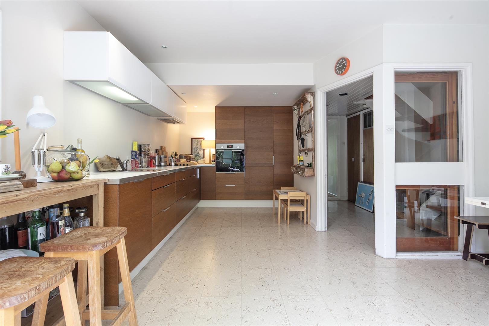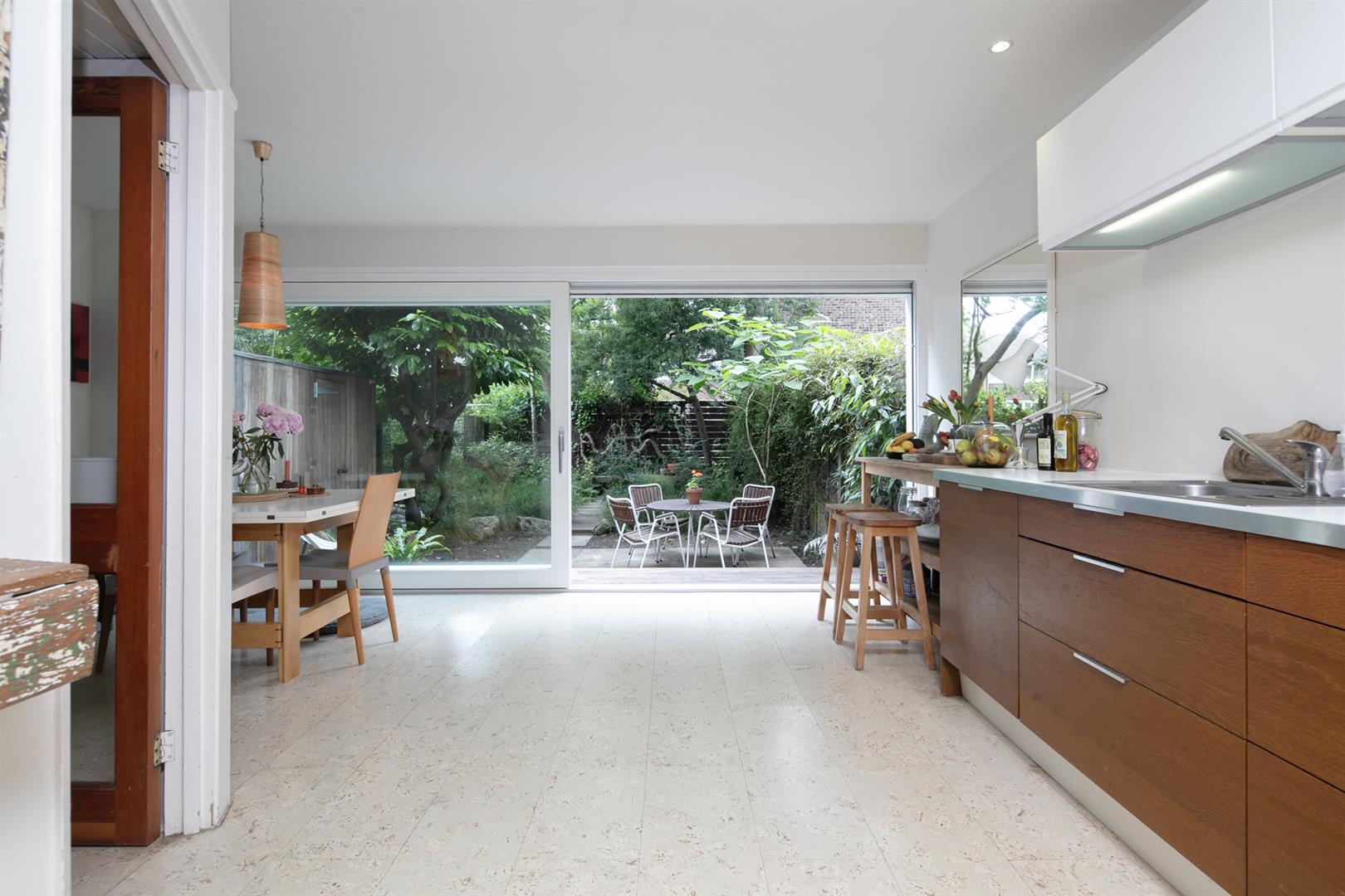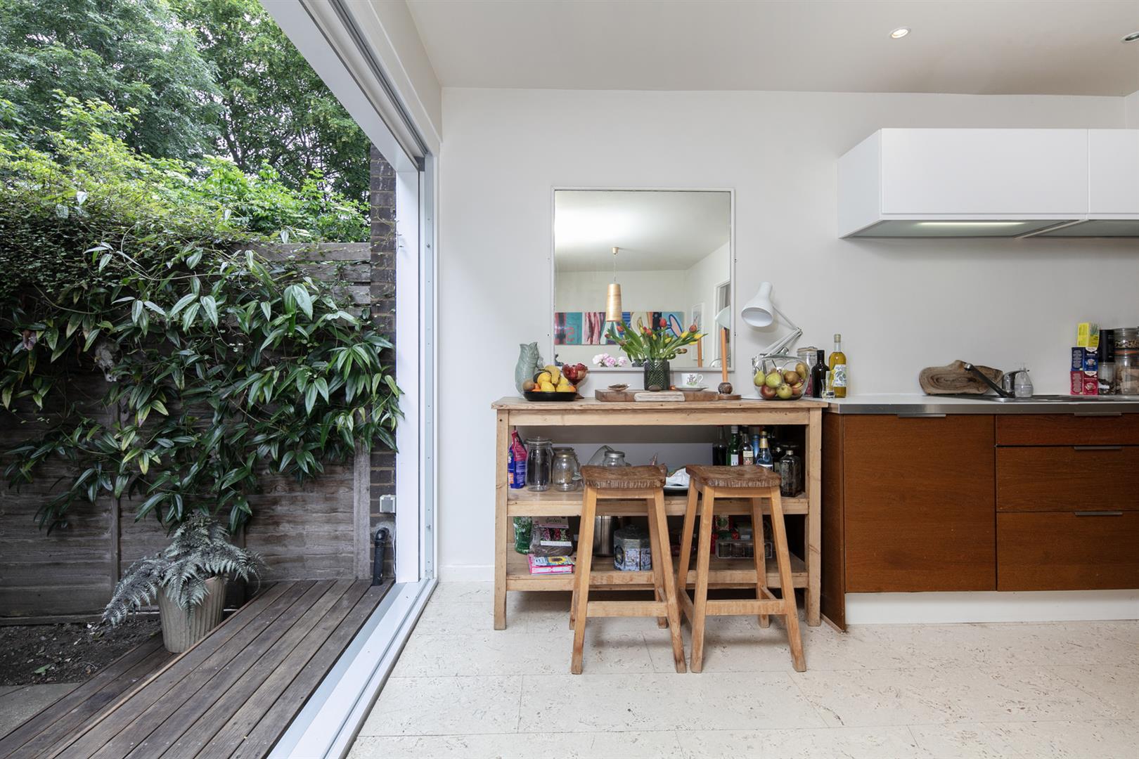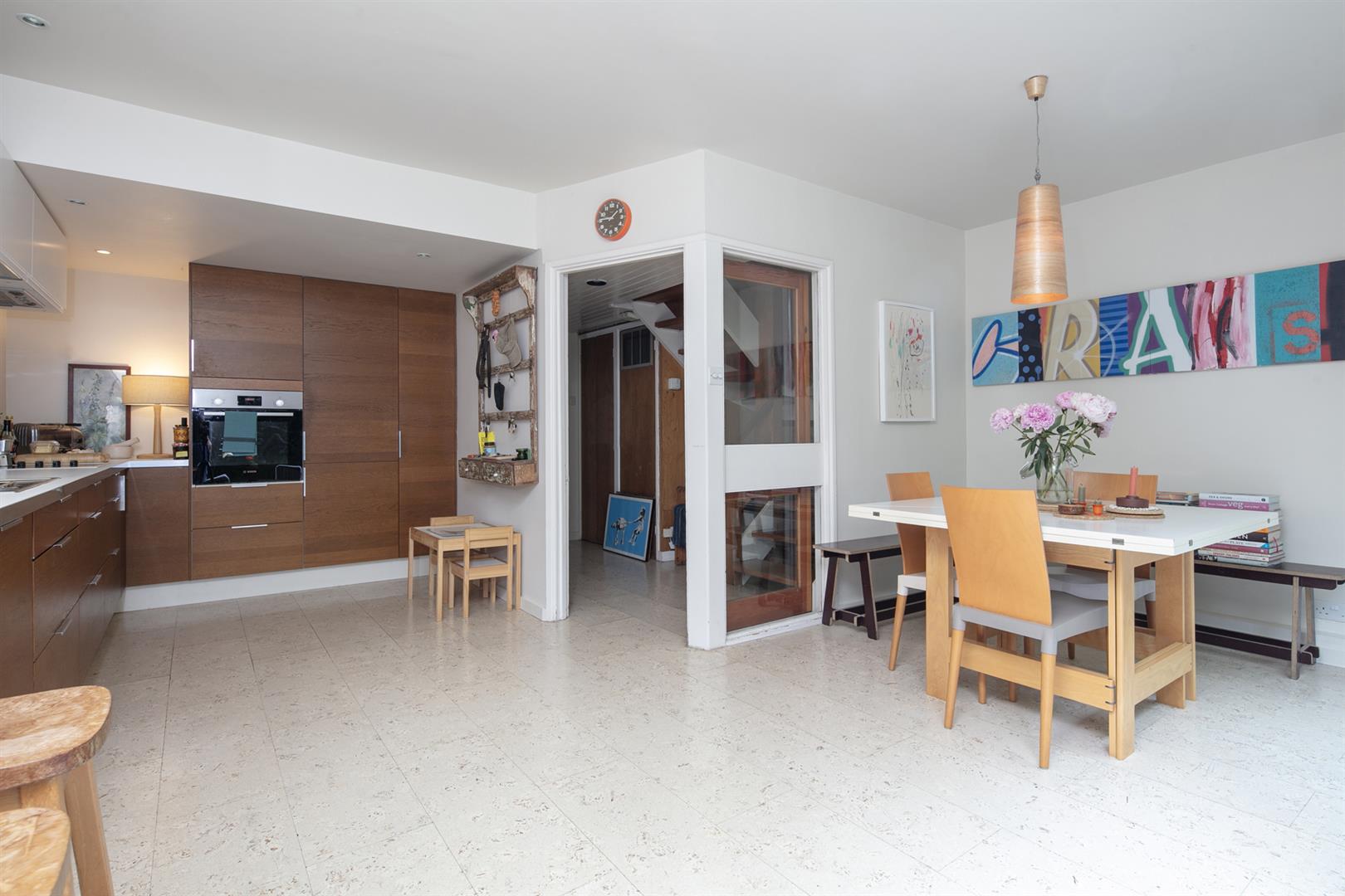 The communal grounds are pleasant and inviting. Guest parking is offered and a central green space with seating and mature flora invites a convivial vibe. The house sits to the left immediately overlooking the central space. A recessed portico entrance is flanked by handy storage points and access to the garage. The inner hall also offers access to the garage and a handy wc with retro suite and recessed storage. To the rear of the ground floor you find a fantastic L-shaped kitchen/diner which sprawls into the full width of the property. Facing onto the garden through sliding glass doors, the space supplies ample dining, cooking and entertaining space. Outside you'll delight in a leafy, mature oasis awash with mature flora and shrubs.