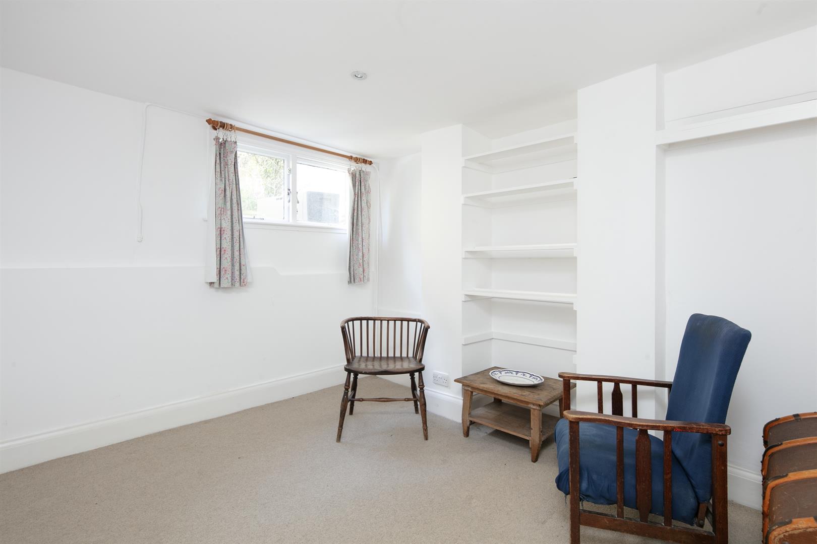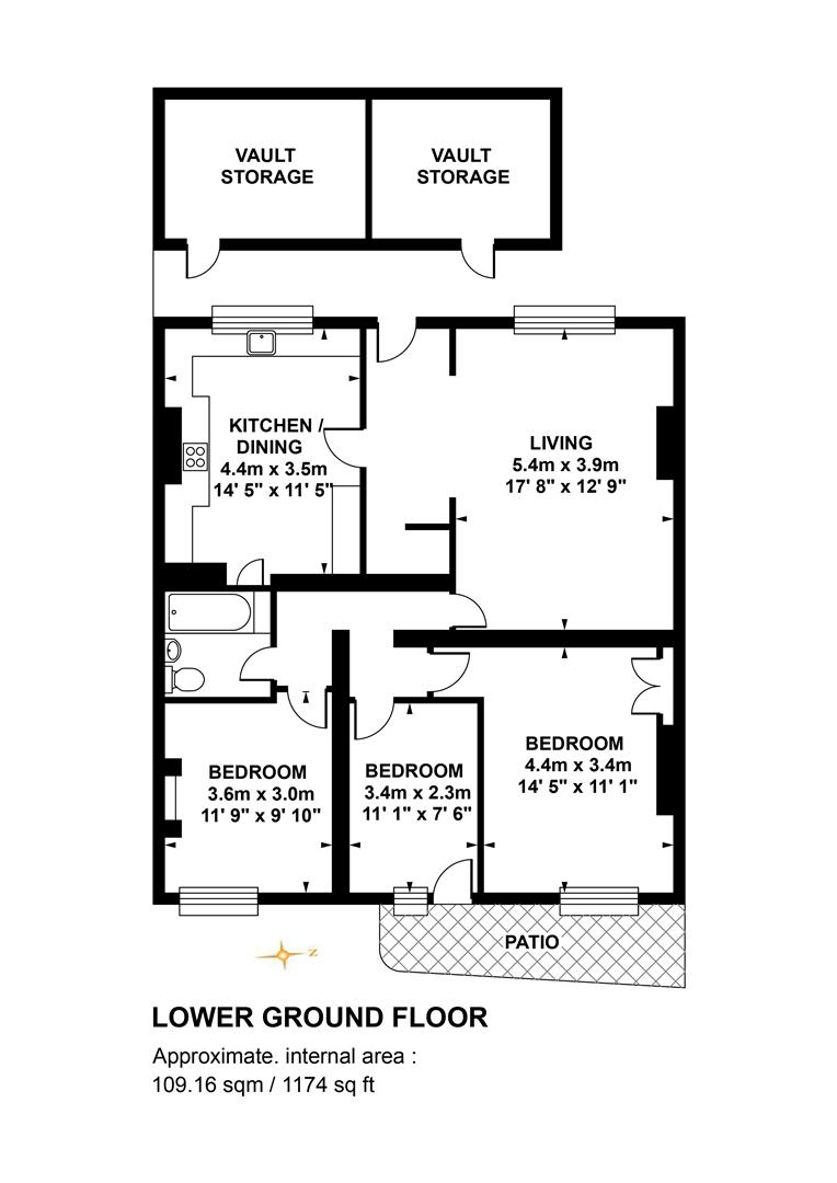 The exterior sits back from the gently sloping tree lined grove behind mature trees and hedging. Steps lead down from the shared front garden to your private entrance opposite which sits your two vault storage points. A neat inner hall with recessed storage for coats and brollies greets you well. To the left, through an open arch, sits your reception which enjoys a large front facing sash window and plenty of space for lounging and formal dining. The far side of the hall invites you to a well appointed kitchen/diner which also enjoys a front facing sash window. Moving rear you meet a hallway offering access to each of your three bedrooms, the middle of which supplies access to your shared patio garden. It's leafy, sunny space with abundant greenery.