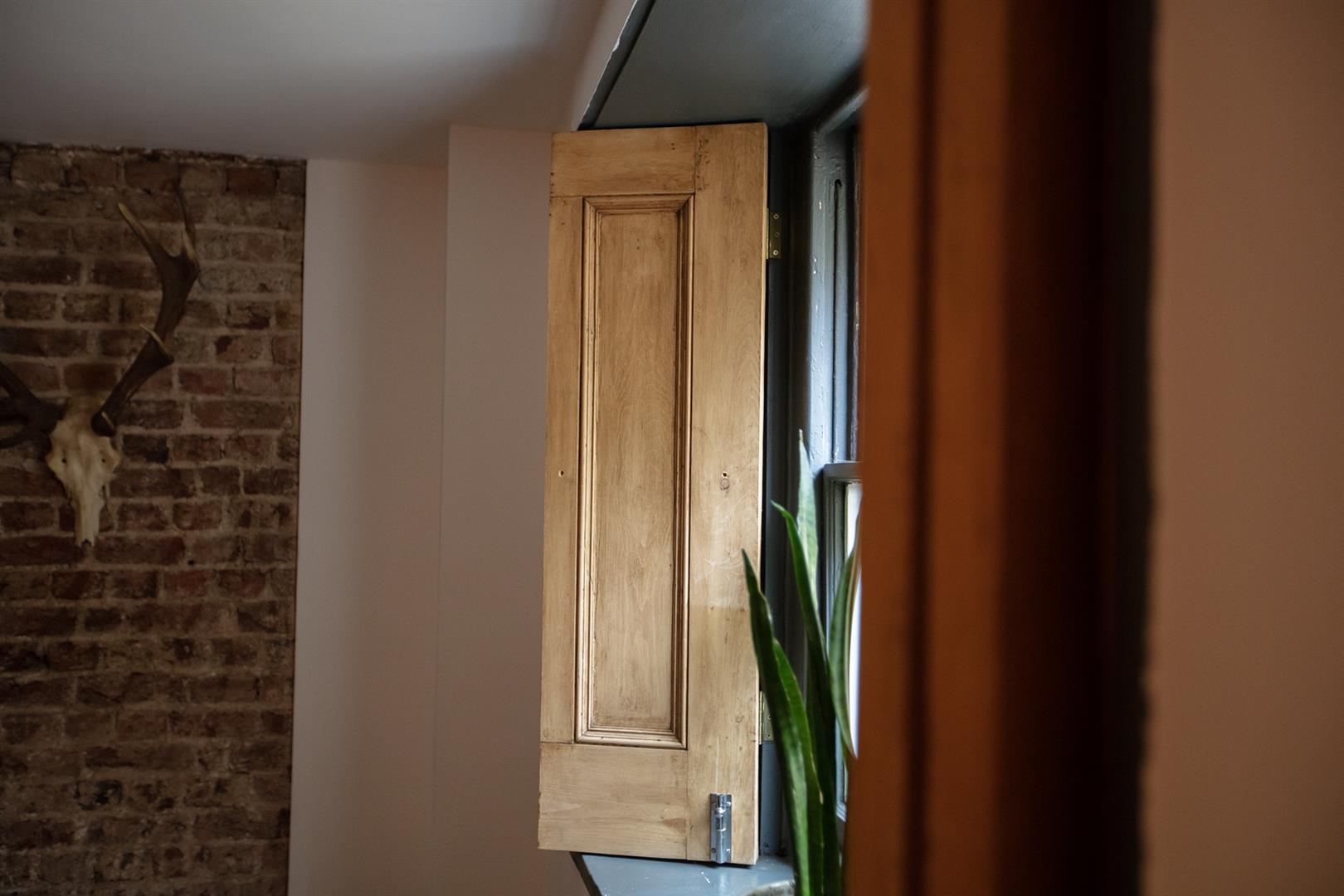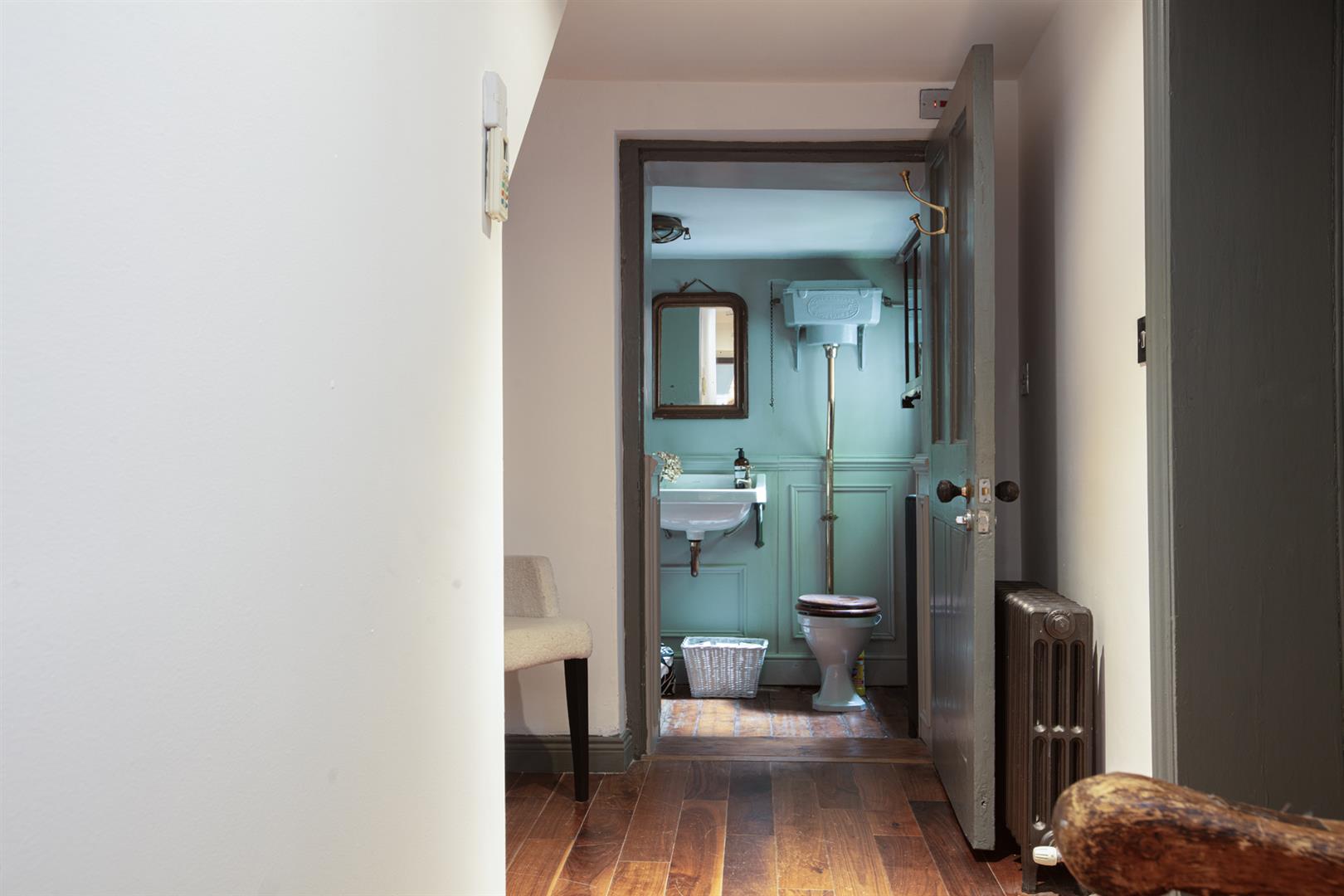 Turn right at the end of the main hall to reach the master bedroom. A beautiful sash window provides plenty of natural light and a pleasant view onto the patio. The shutters on the window are custom-made from antique Victorian doors, a really smart touch. A reconditioned column radiator sits under the window, perfectly matching the style of the room. Storage needs are taken care of with a large cupboard, housing shelving, a clothes rail and shoe rack. To cap it all off there's an en suite shower, wc and hand basin. Exit the bedroom and turn right into the bathroom. It's a fantastic example of period design and packed with beautiful reclaimed pieces that fit sympathetically in the space. Original floor boards, wood panelling, salvaged Victorian wc with cistern, art deco sink and taps (circa 1925), vintage cast iron bath with brass claw feet, wall integrated Lefroy Brooks taps are all wonderful, well thought out touches. Light is supplied by a box window looking out onto the patio.