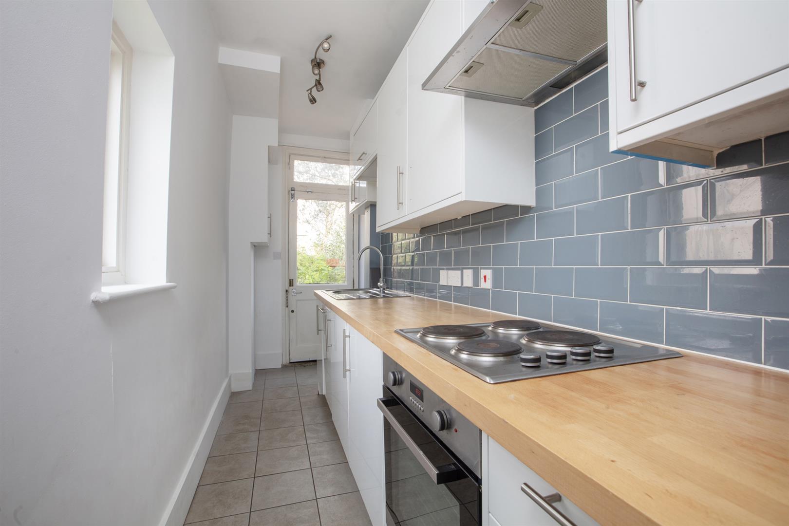 A further reception faces over Camberwell Grove through two arched sash windows. It's a dual aspect room with plenty of light and could easily make a double bedroom depending on requirements. This resides in the original part of the house. Next comes the dining room with sash window, original fitted storage and access to the galley kitchen. This is well stocked with contemporary cabinets, solid wooden counters, a four ring electric hob, oven, integrated fridge, freezer and dishwasher and some lovely tiled splashbacks. A door leads from here to the gravel bed garden which is leafy and pleasant and offers direct gated access for the car from Grove Park.