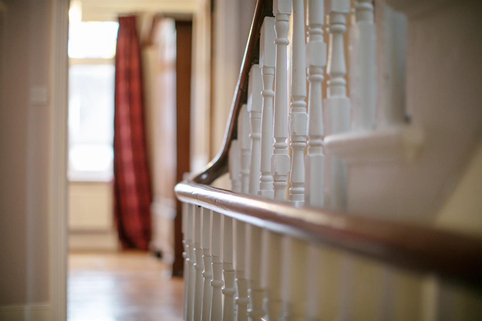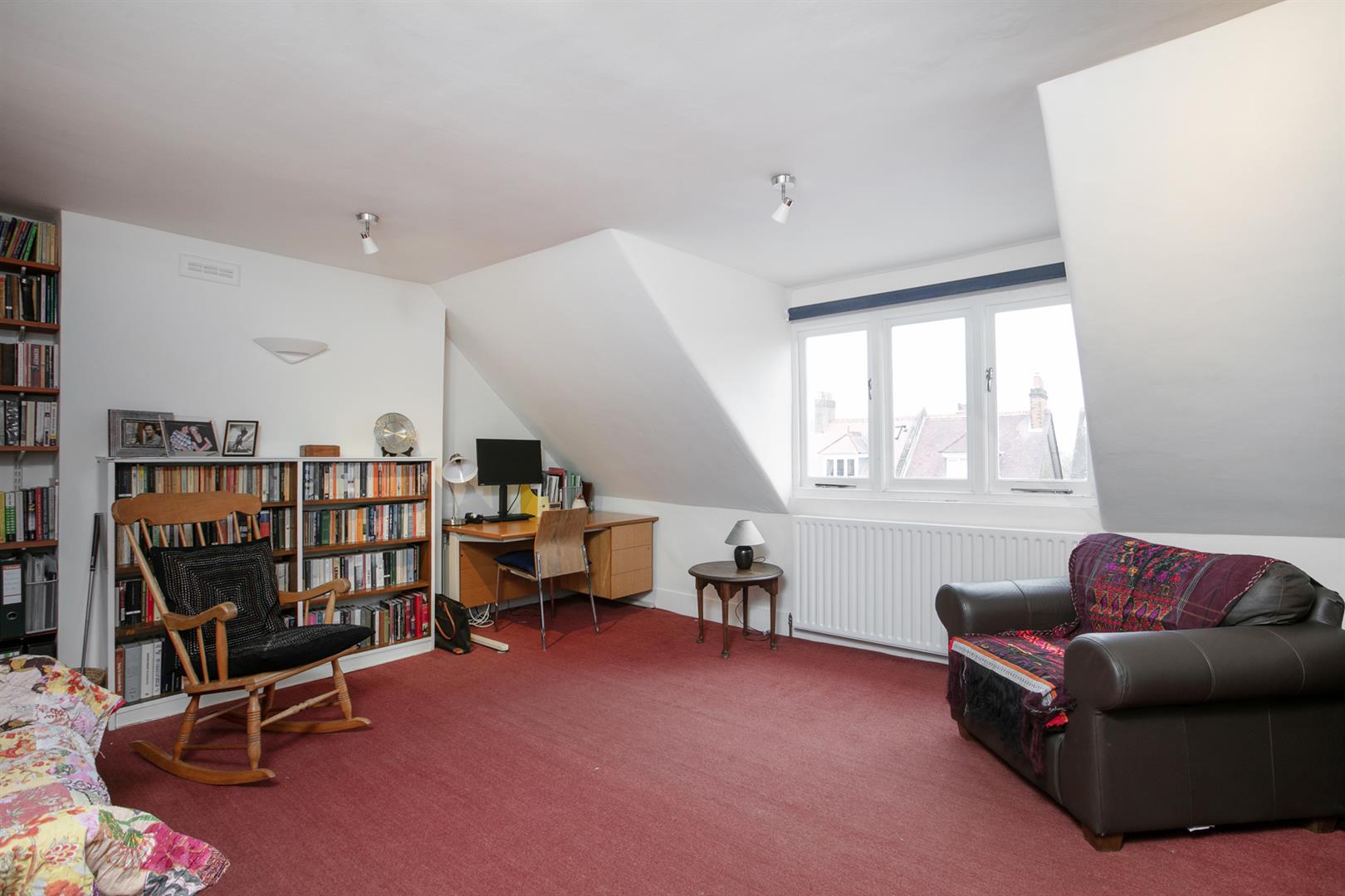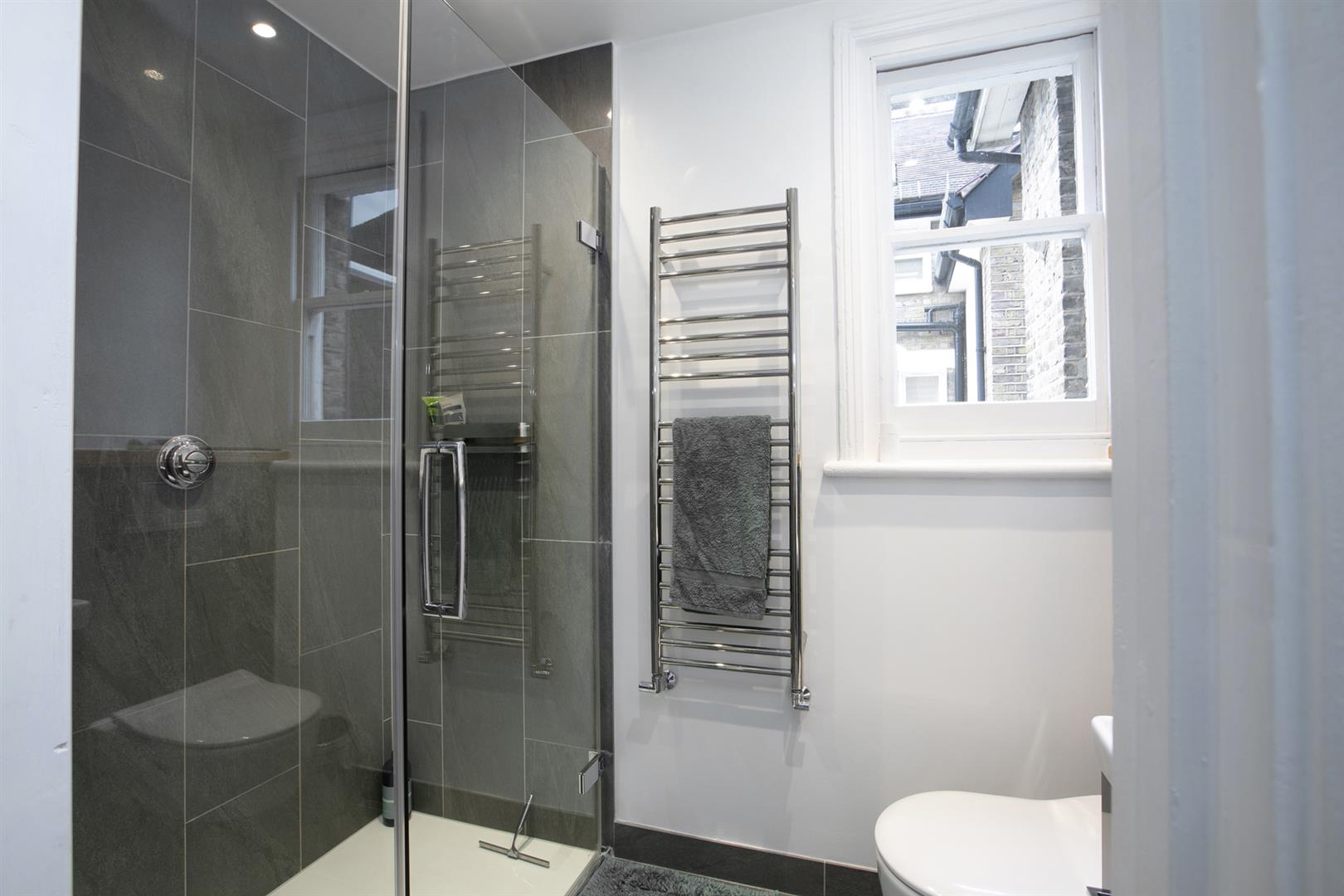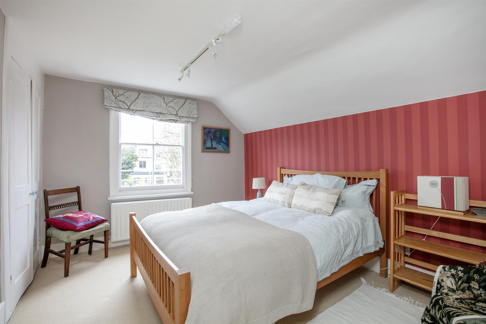 The second return is carpeted and hosts bedroom three which is a spacious rear-facing double with fab garden views and plenty of southerly light. Next to this is a modern shower room. Upward to the second floor you find a wonderfully spacious front-facing double bedroom with sloping eaves and a majestic period streetscape. Bedroom five is currently arranged as a nursery and work-from-home space. It has pretty yellow walls and an integrated desk.