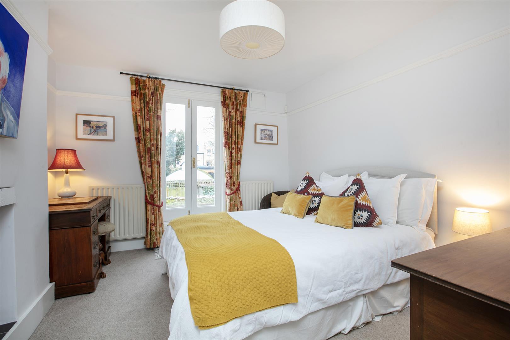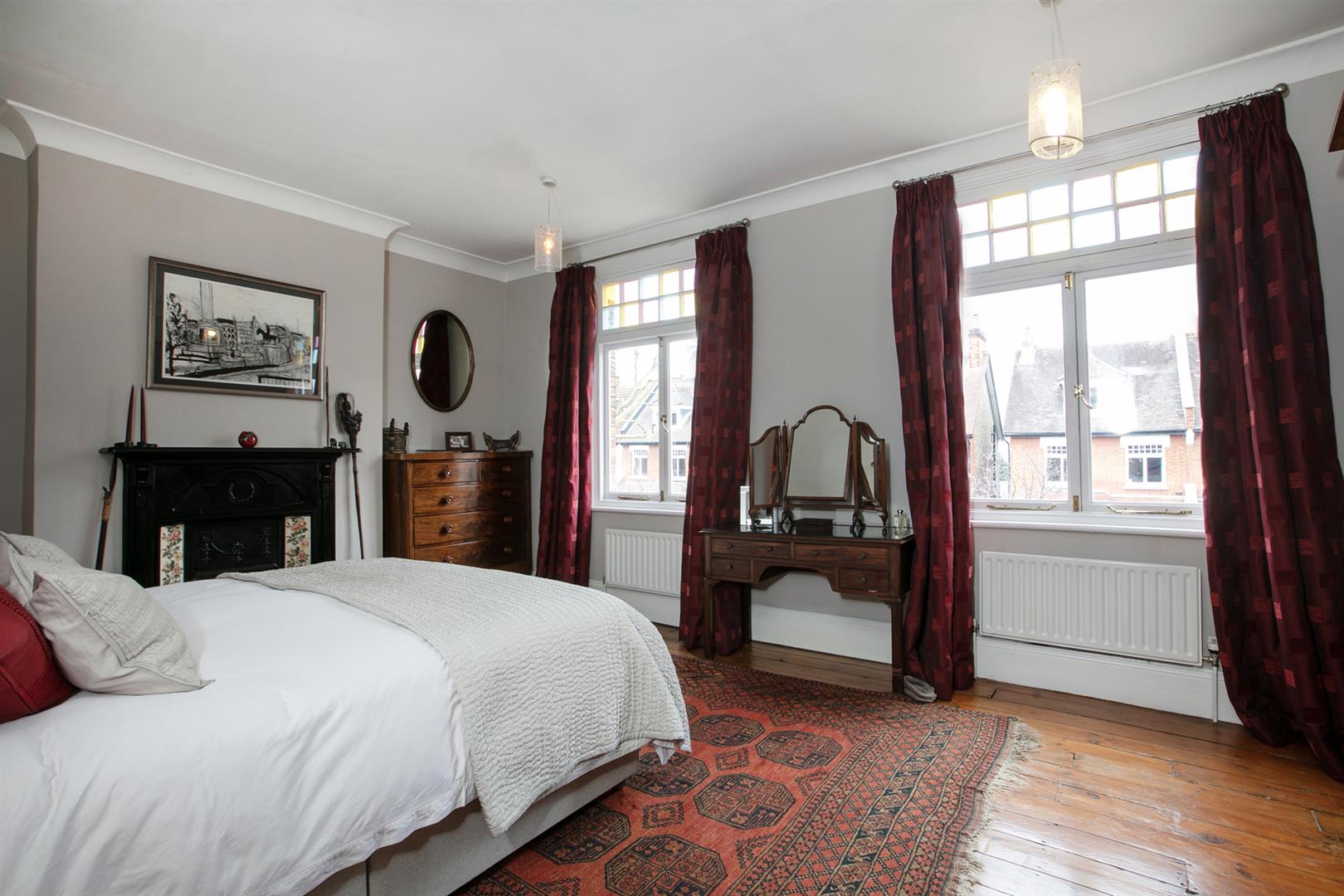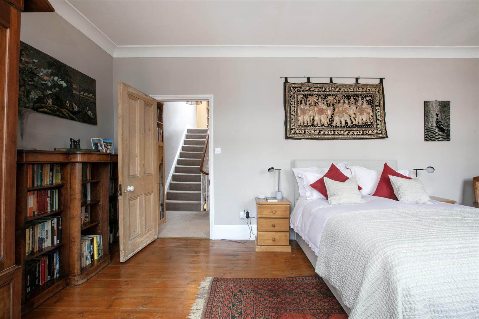 Heading upward to the first return you meet the first of your beautiful bedrooms, a rear-facing double with picture rails and French doors opening to a green sedum roof with pretty pebble edging. There is a decked section too for morning croissants and coffee! A modern shower room completes this level nicely. The first landing rises two steps. Here you meet a most impressive master bedroom that spans full width and has two gorgeous double glazed casement windows each crowned in original stained glass. A pretty feature fireplace and original timber floors add to the charm. A huge family bathroom sits next to this with extra deep bath and twin wash hand basins.