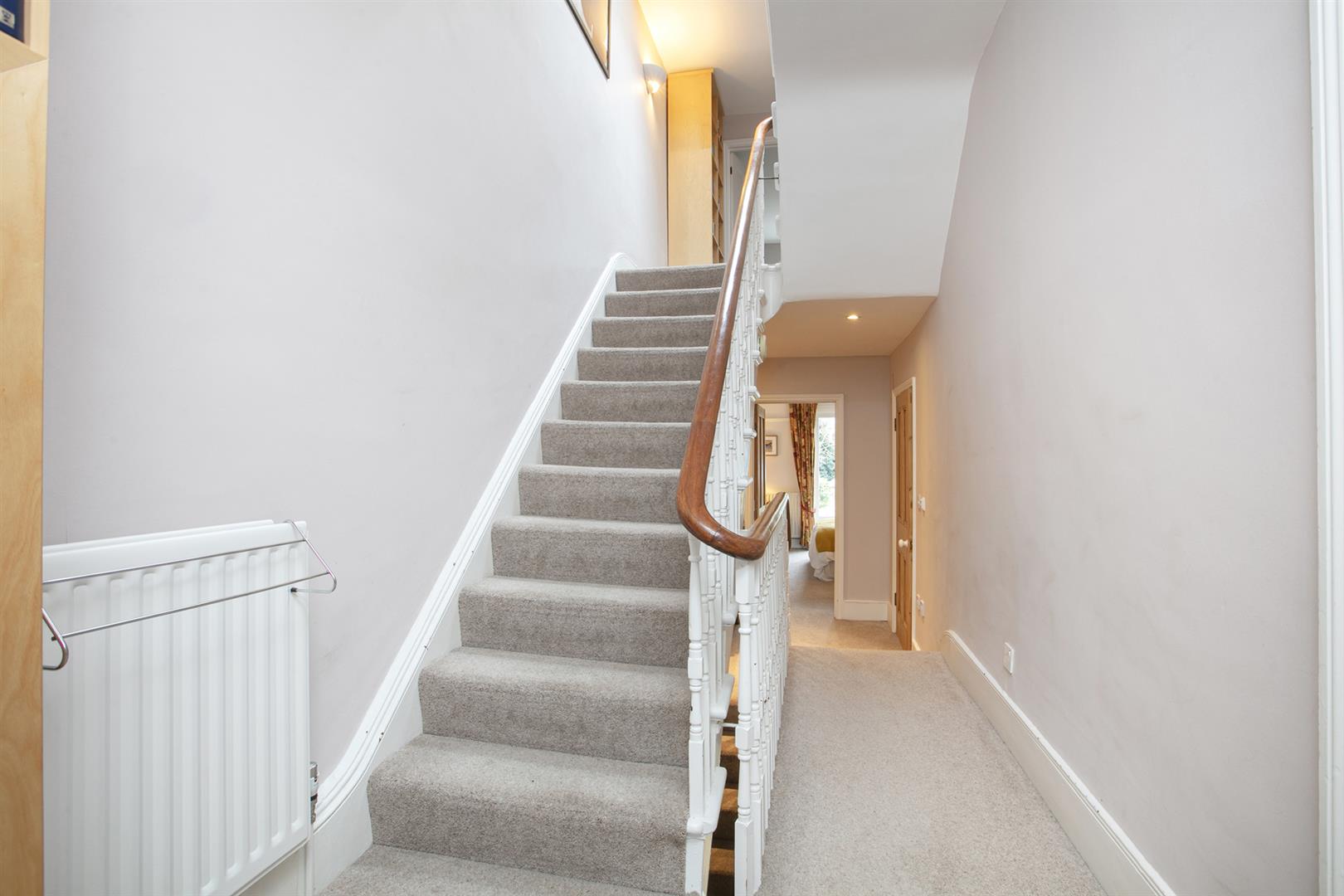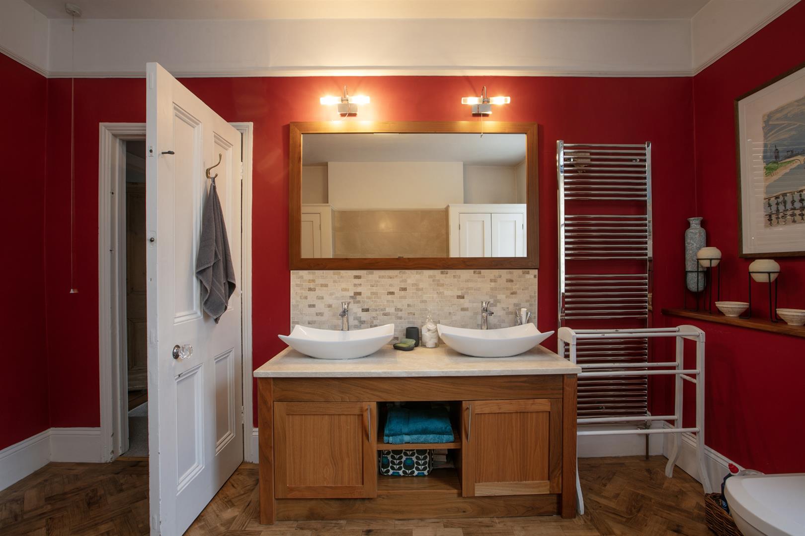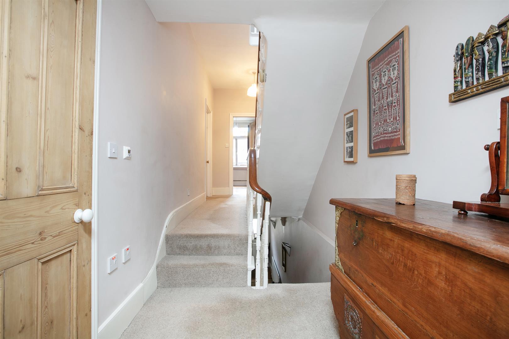 Heading upward to the first return you meet the first of your beautiful bedrooms, a rear-facing double with picture rails and French doors opening to a green sedum roof with pretty pebble edging. There is a decked section too for morning croissants and coffee! A modern shower room completes this level nicely. The first landing rises two steps. Here you meet a most impressive master bedroom that spans full width and has two gorgeous double glazed casement windows each crowned in original stained glass. A pretty feature fireplace and original timber floors add to the charm. A huge family bathroom sits next to this with extra deep bath and twin wash hand basins.