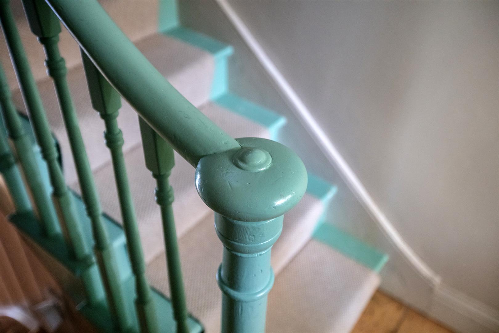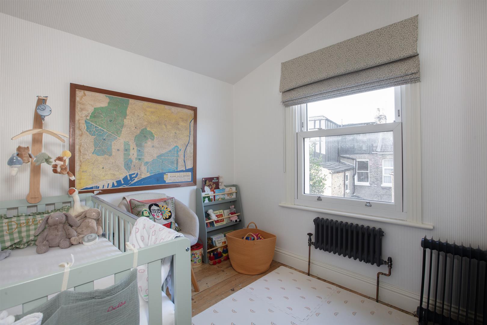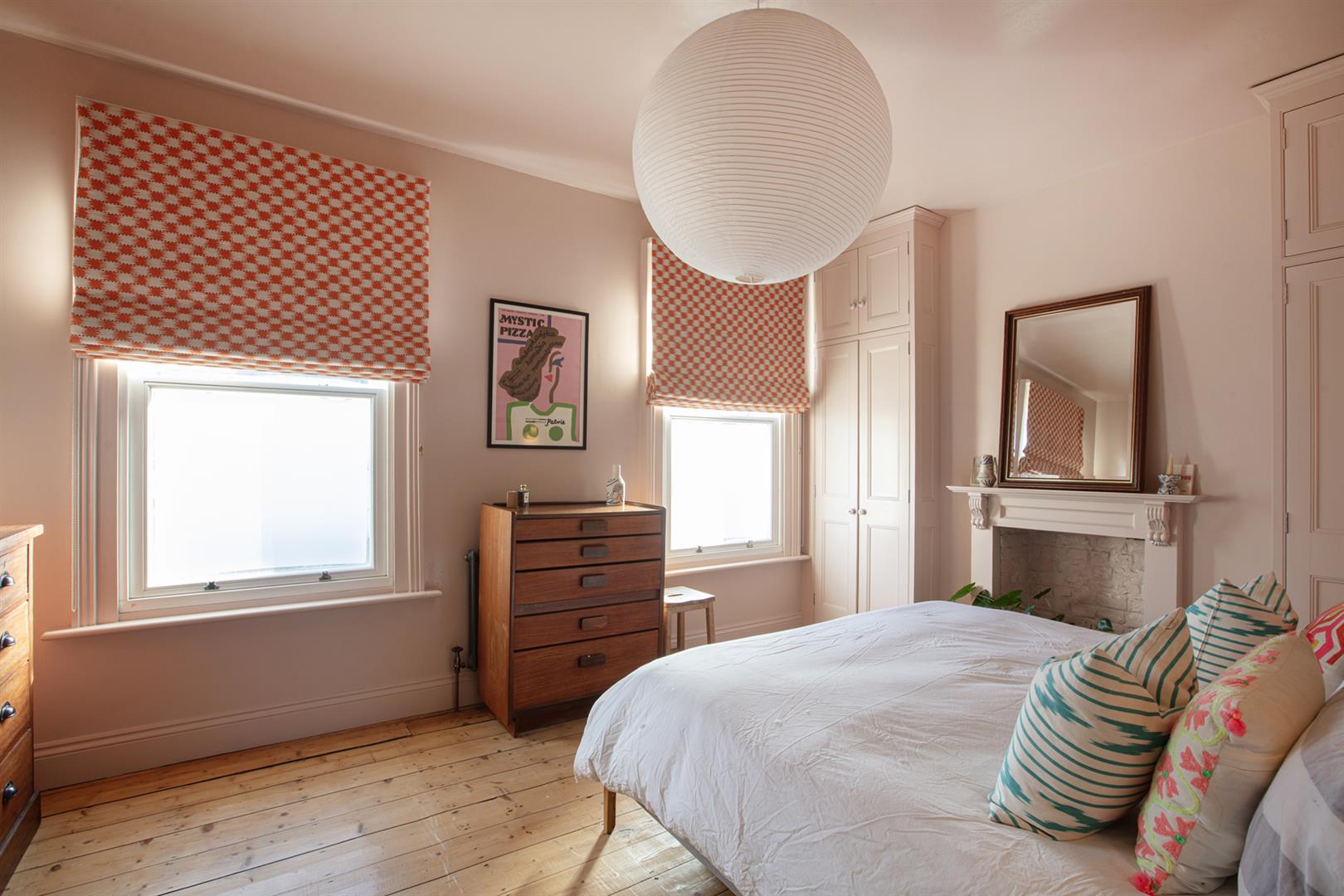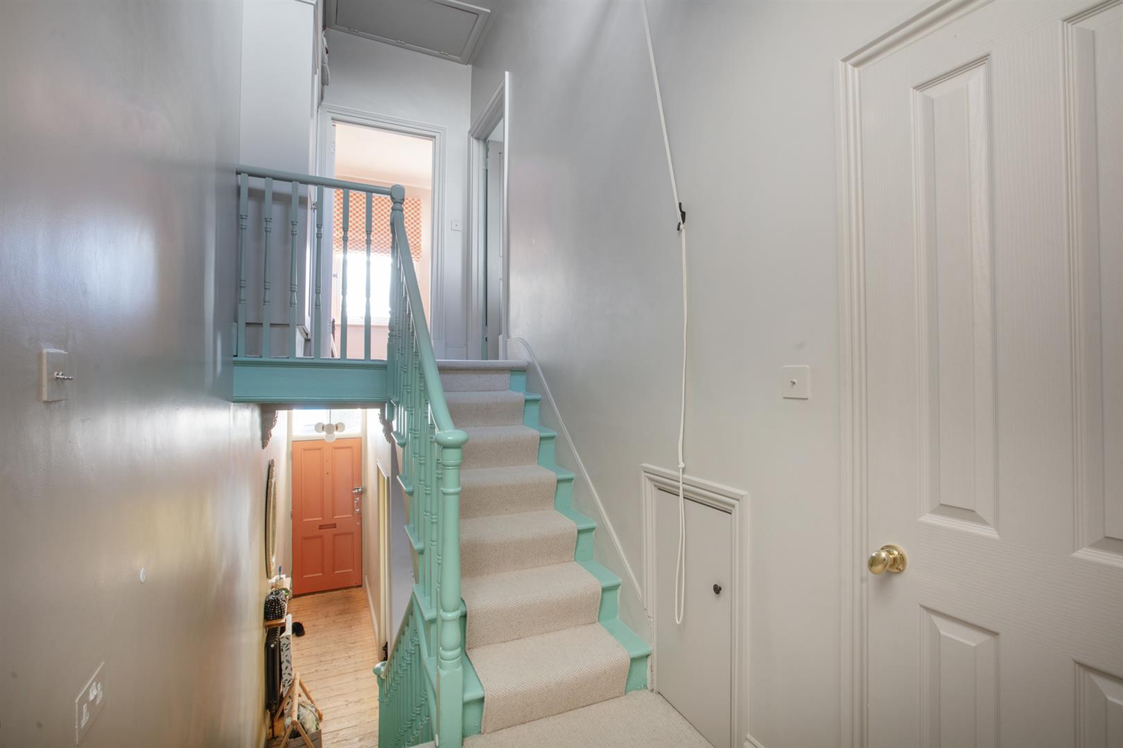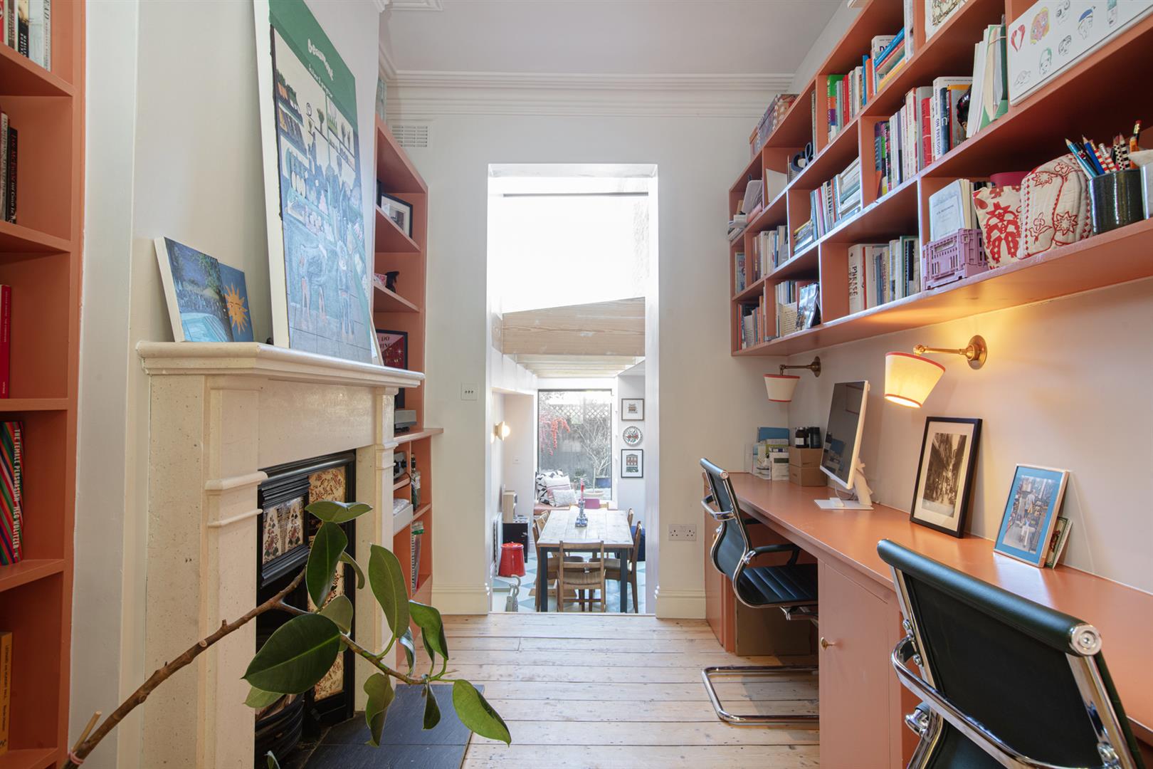 Upward to the first floor you meet a front-facing full width double bedroom with two large sash windows. Floor-to-ceiling bespoke storage sits either side of your feature mantel which is all colour-drenched in a beautiful plaster pink. Further fitted storage on the landing precedes a lovely second double bedroom with more designer wallpaper and matching feature mantel, storage and skirting. This gorgeous colour can also be found on the staircase, balustrades, treads and risers. A laundry cupboard on the rear return precedes the bathroom which is partially tiled and has a beautiful wooden cabinet under your square wash hand basin and a drencher over the bath. The third and final bedroom completes your tour with calming garden views.