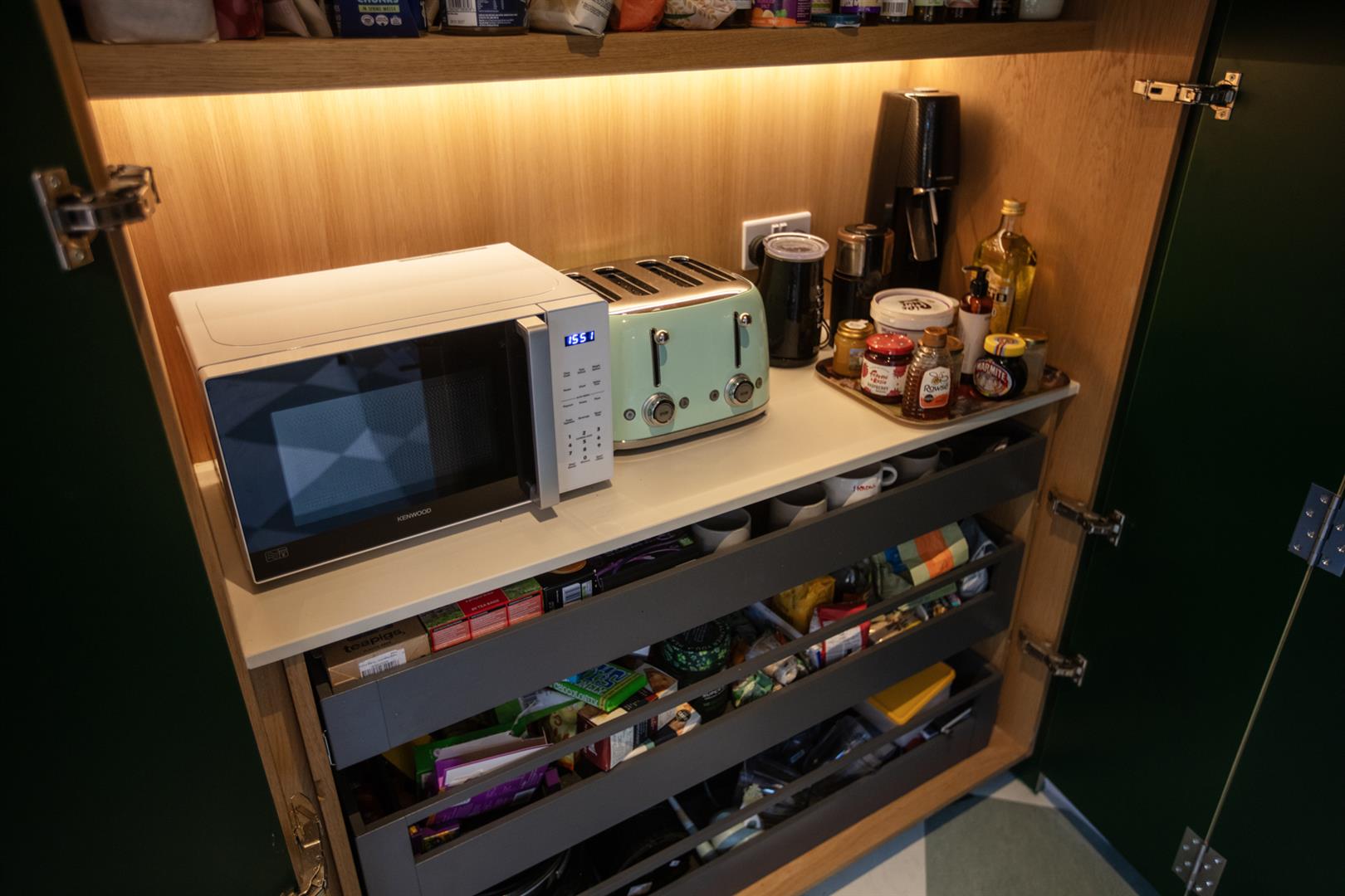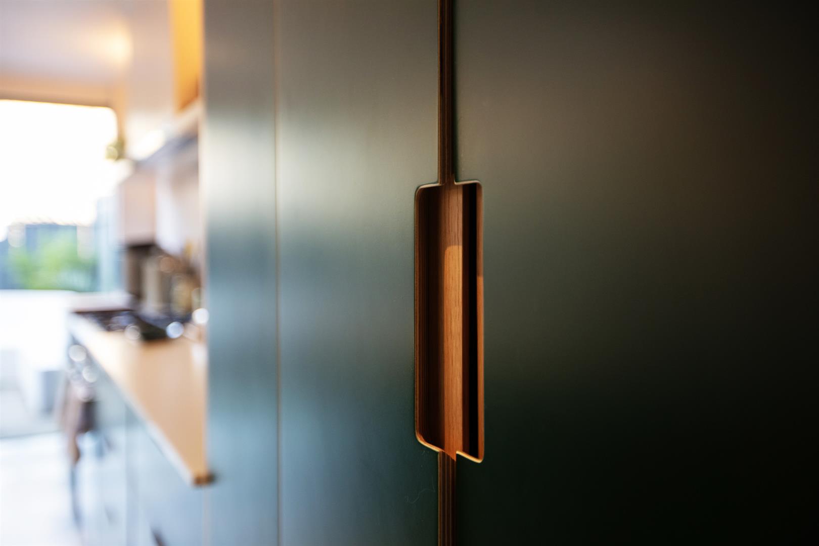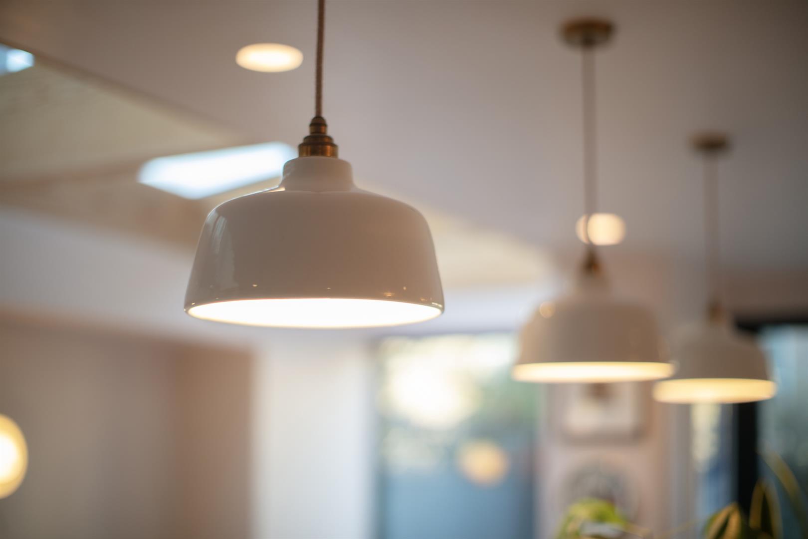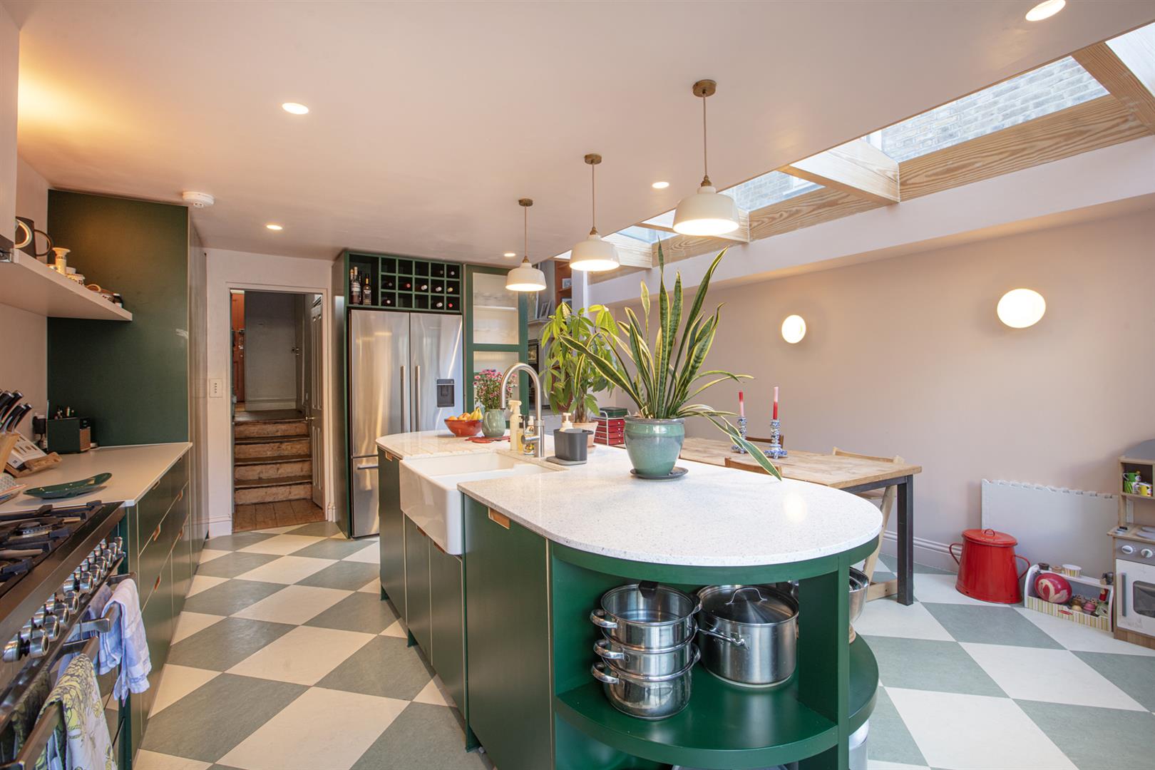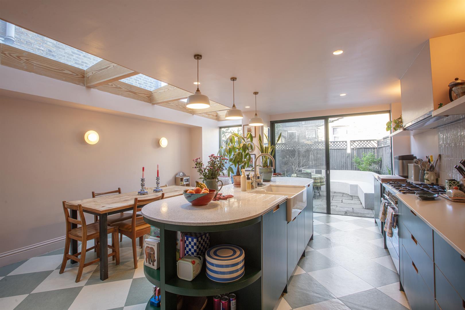 A sliding pocket door opens politely to the rear to reveal a study where an integrated desk and shelving unit will keep the work-from-home days an organised affair. There's an original feature fireplace with delicate floral tiling to enhance your period credentials. Chunky steps leads downward from here to the full-width kitchen/diner which boasts five separate skylights, each accented by solid wooden beams. The kitchen cabinets and oblong, oval island/breakfast bar are a lovely ivy-green shade. There's a tonne of storage and food-prep space and your pull-out larder, bin-storage and dishwasher are each integrated.