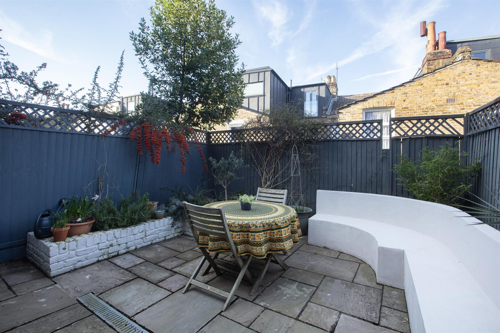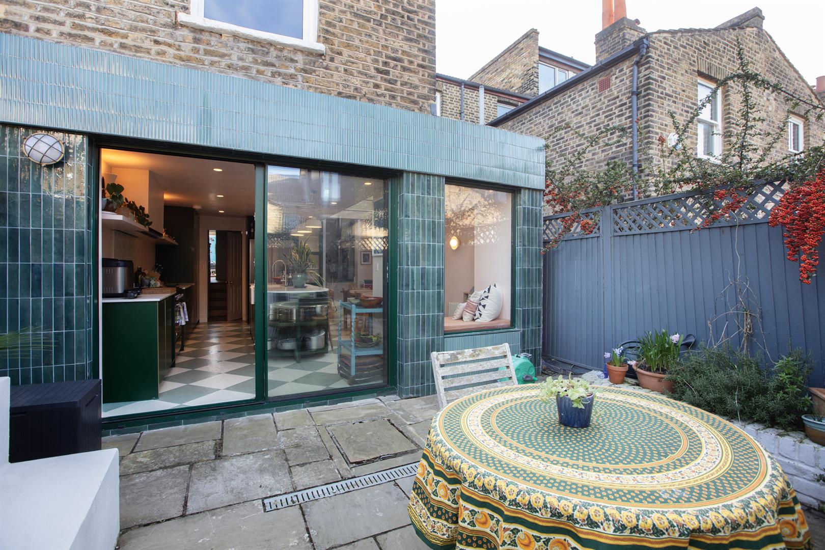 Beyond the family dining space (which sits pretty under the skylights), you'll find a most-wonderful integrated window seat with book shelves and leafy views. Wide glass sliding doors open rear to the York stone patio where a curved integrated seat and raised brick beds supply a great spot for the summer BBQ. Retro ivy green tiling on the lower rear elevation will wow your guests no end! The kitchen/diner wraps back around to the hall where a cellar access sits opposite a deep recessed storage spot - great for the Dyson et al. The wc is up a half flight with delightful mermaid-themed wallpaper and moody wooden panelling.