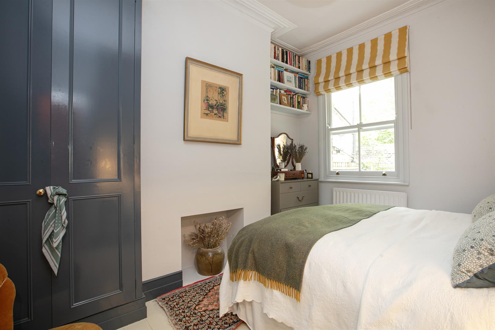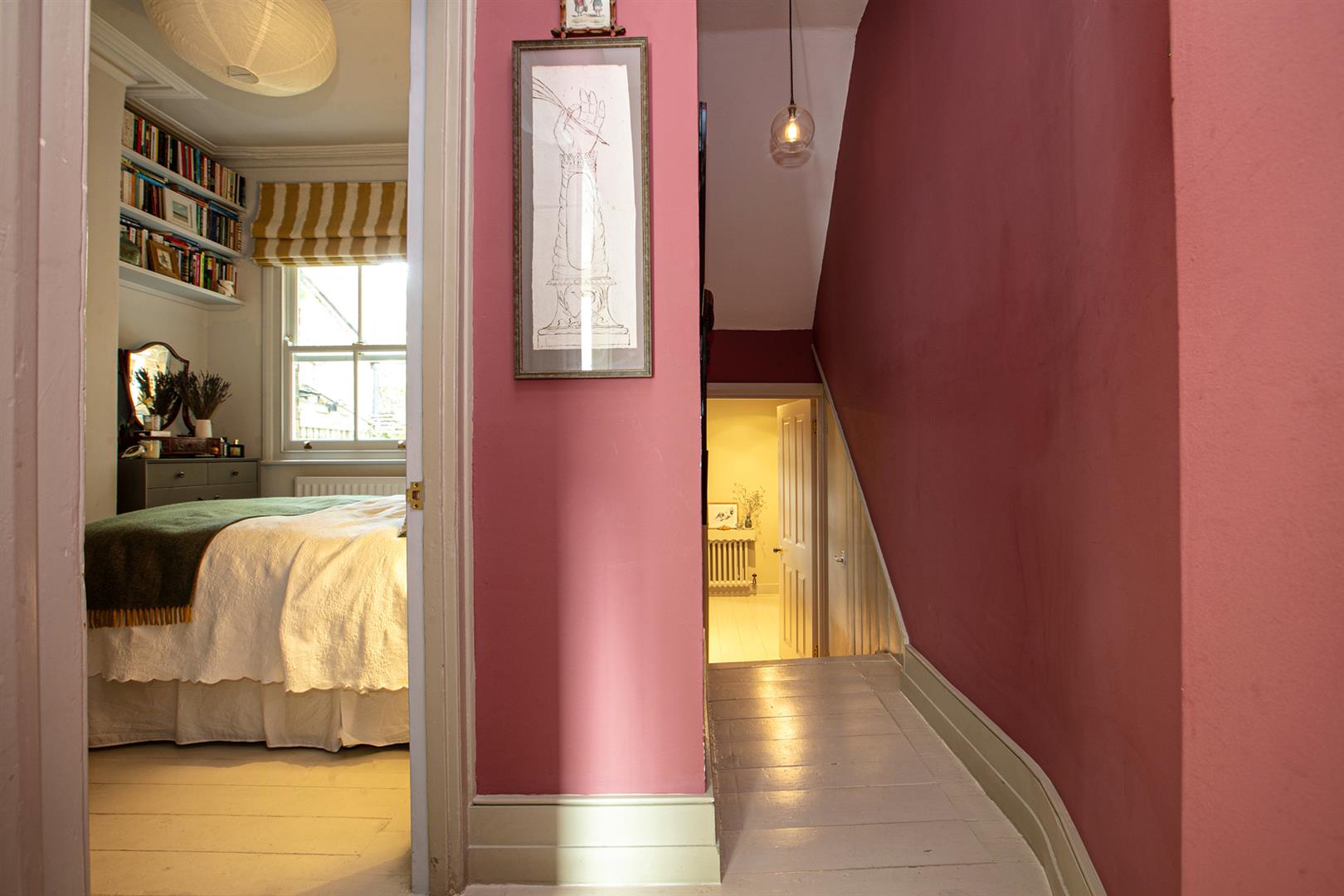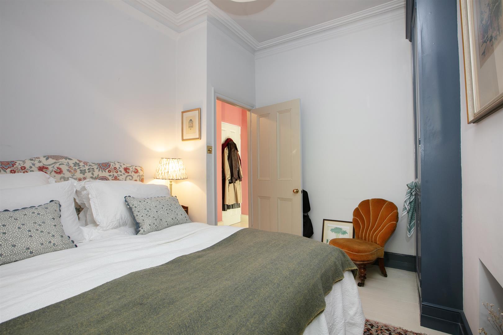 A shared entrance and communal hallway leads inward to the flat's inner hall which boasts rich magenta wall tones and some lovely painted timber floors. A front aspect reception enjoys a wide bay window, regal looking period feature fireplace and mantel, original cornicing and a pretty ceiling rose. Integrated shelving will house your treasured trinkets. The double bedroom comes next along the hall and enjoys plenty of bespoke storage, a rear facing sash window with peaceful vibes, original cornicing and another ceiling rose.