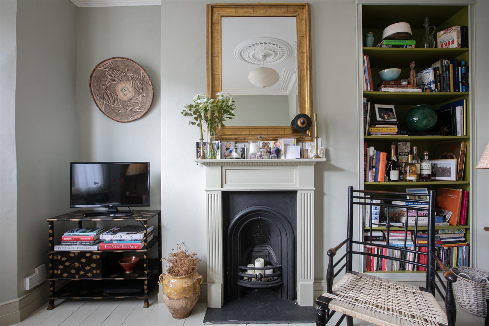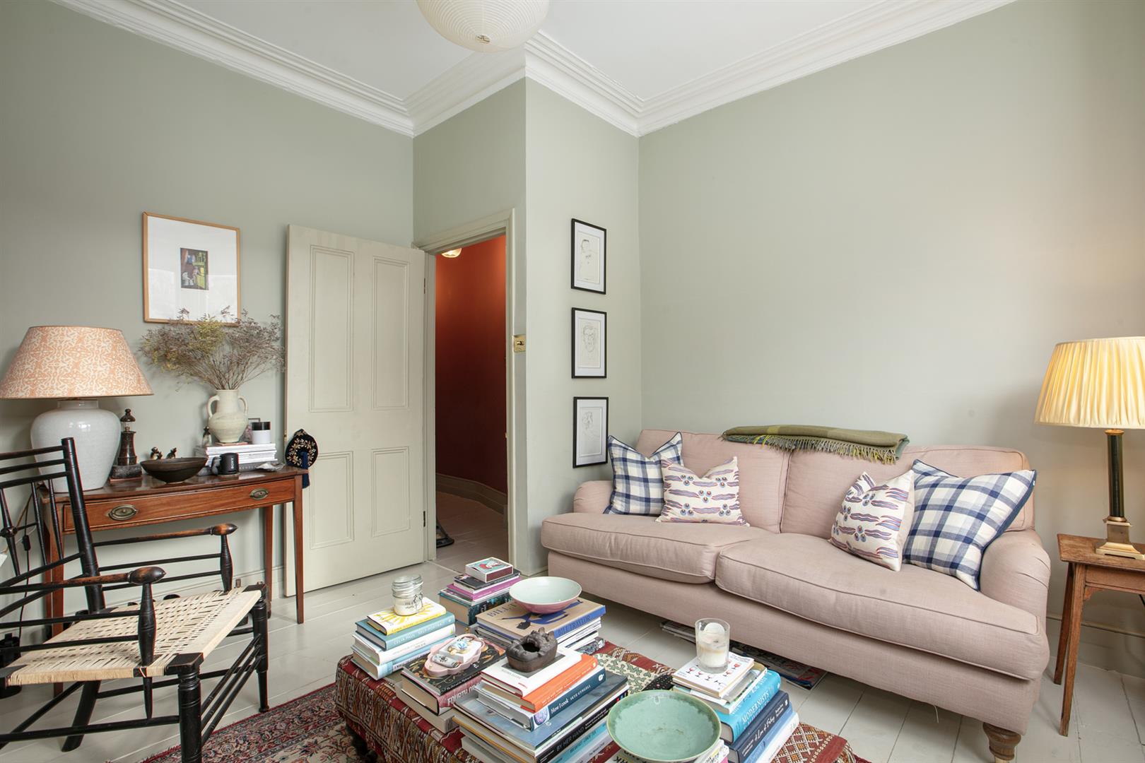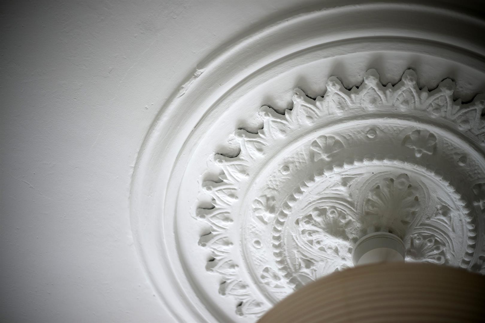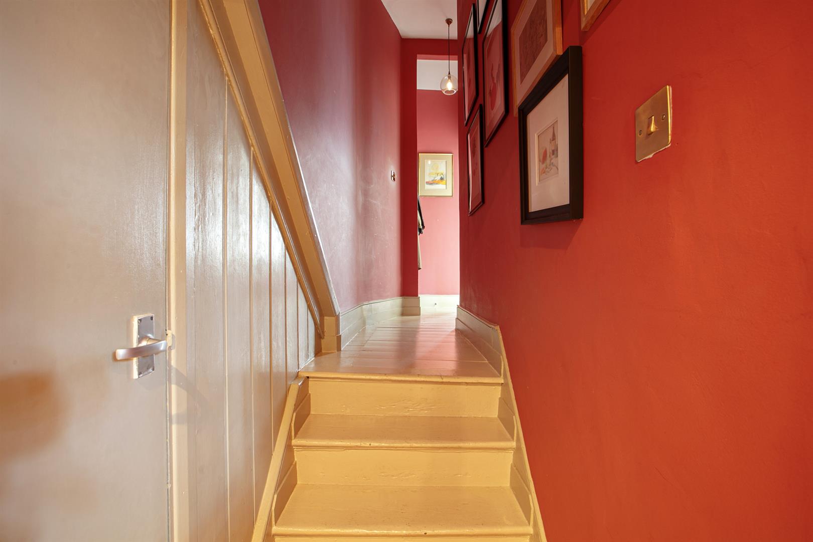 A shared entrance and communal hallway leads inward to the flat's inner hall which boasts rich magenta wall tones and some lovely painted timber floors. A front aspect reception enjoys a wide bay window, regal looking period feature fireplace and mantel, original cornicing and a pretty ceiling rose. Integrated shelving will house your treasured trinkets. The double bedroom comes next along the hall and enjoys plenty of bespoke storage, a rear facing sash window with peaceful vibes, original cornicing and another ceiling rose.