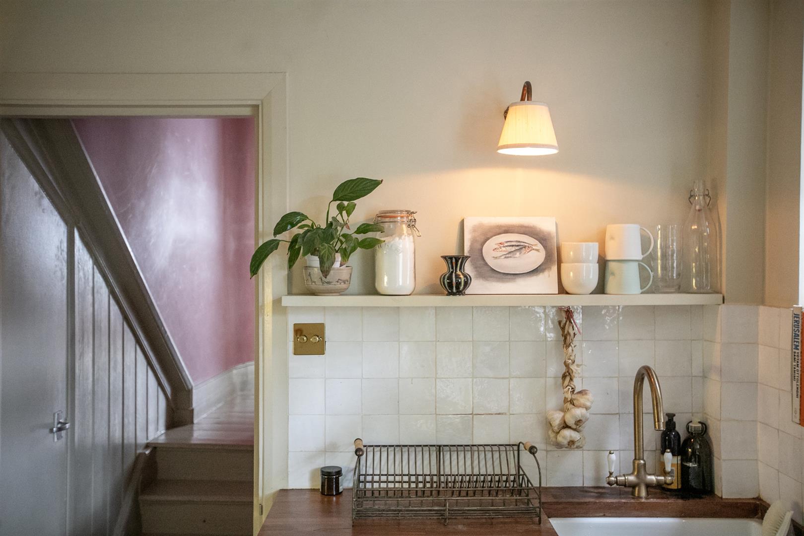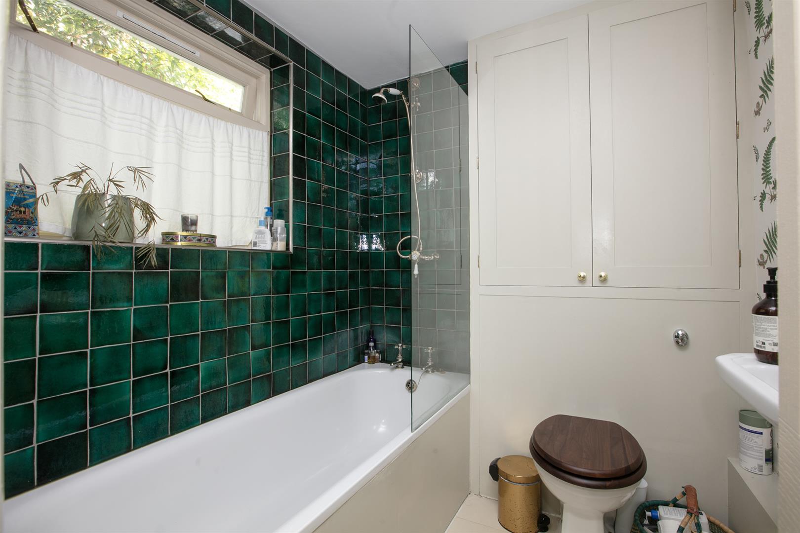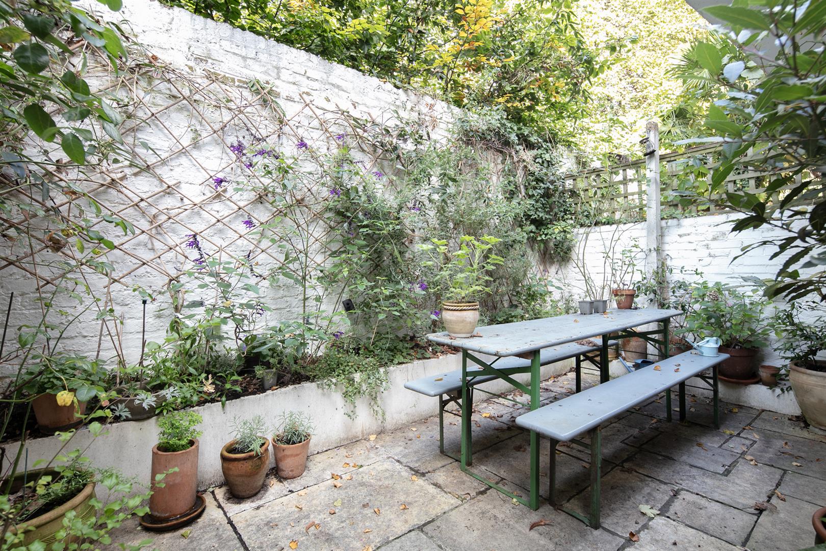 Further along the hall you find access to that huge storage cellar. Whilst not part of the demise, the space is available for your sole use and is available for purchase. The kitchen/diner sits down a half flight and dons solid Iroko counters, Zellige splashback tiling and a fab four ring Farmhouse range. A ceramic butler sink sits on the rear wall and there's a pretty side aspect casement window. All windows (except the front bay) are new and double glazed. Further storage precedes the garden which is a leafy, peaceful and private space with plenty of room for al fresco dining. Mature Salvia supplies a lovely splash of colour and you'll easily cultivate veggies too. The bathroom sits off the kitchen with ivy green tiling over the bath, antique style brass fixtures and a period style loo.