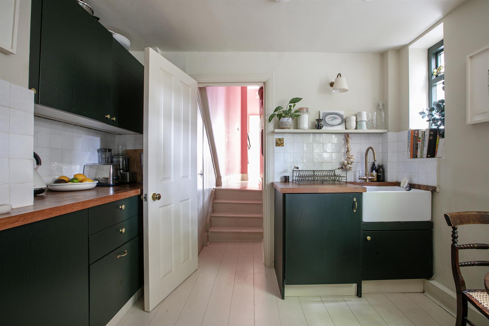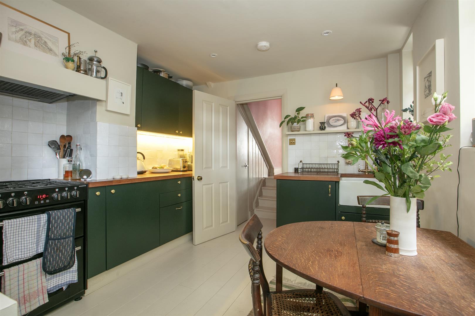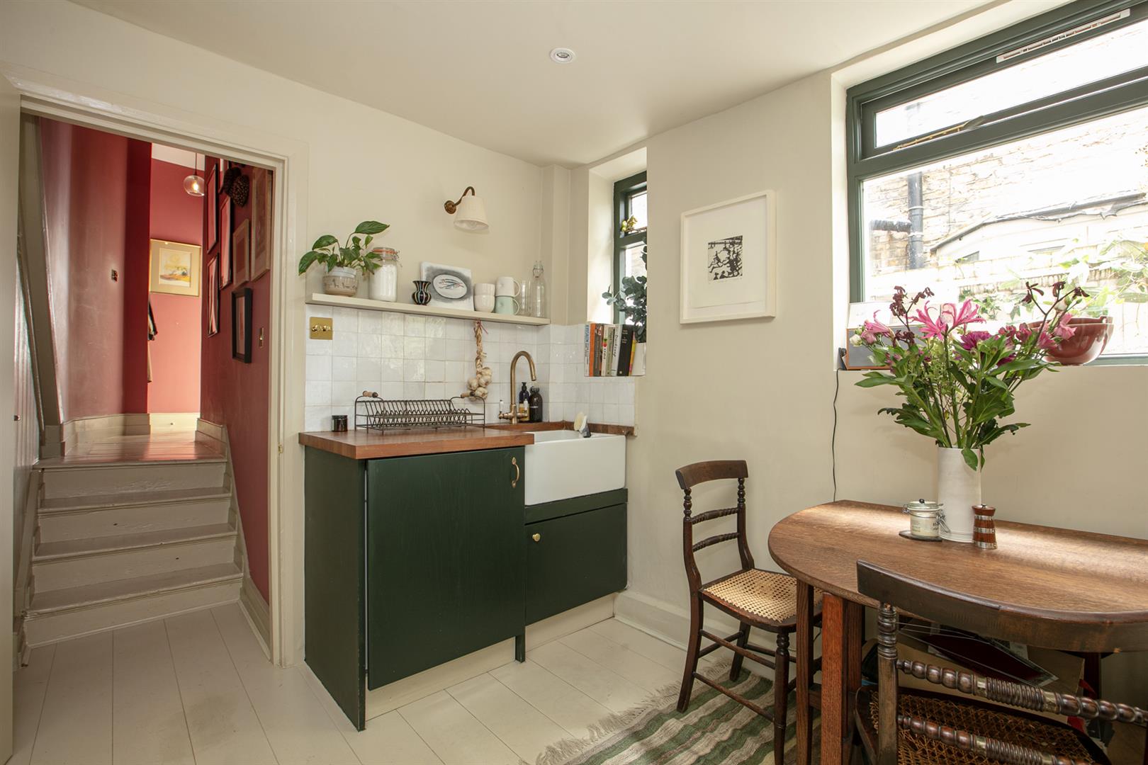 Further along the hall you find access to that huge storage cellar. Whilst not part of the demise, the space is available for your sole use and is available for purchase. The kitchen/diner sits down a half flight and dons solid Iroko counters, Zellige splashback tiling and a fab four ring Farmhouse range. A ceramic butler sink sits on the rear wall and there's a pretty side aspect casement window. All windows (except the front bay) are new and double glazed. Further storage precedes the garden which is a leafy, peaceful and private space with plenty of room for al fresco dining. Mature Salvia supplies a lovely splash of colour and you'll easily cultivate veggies too. The bathroom sits off the kitchen with ivy green tiling over the bath, antique style brass fixtures and a period style loo.
