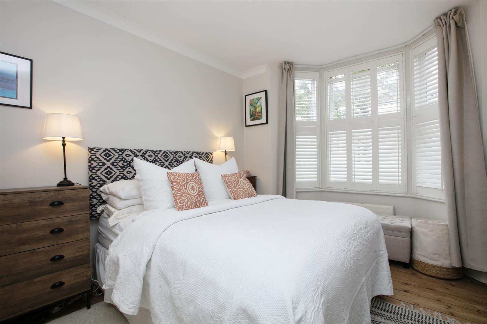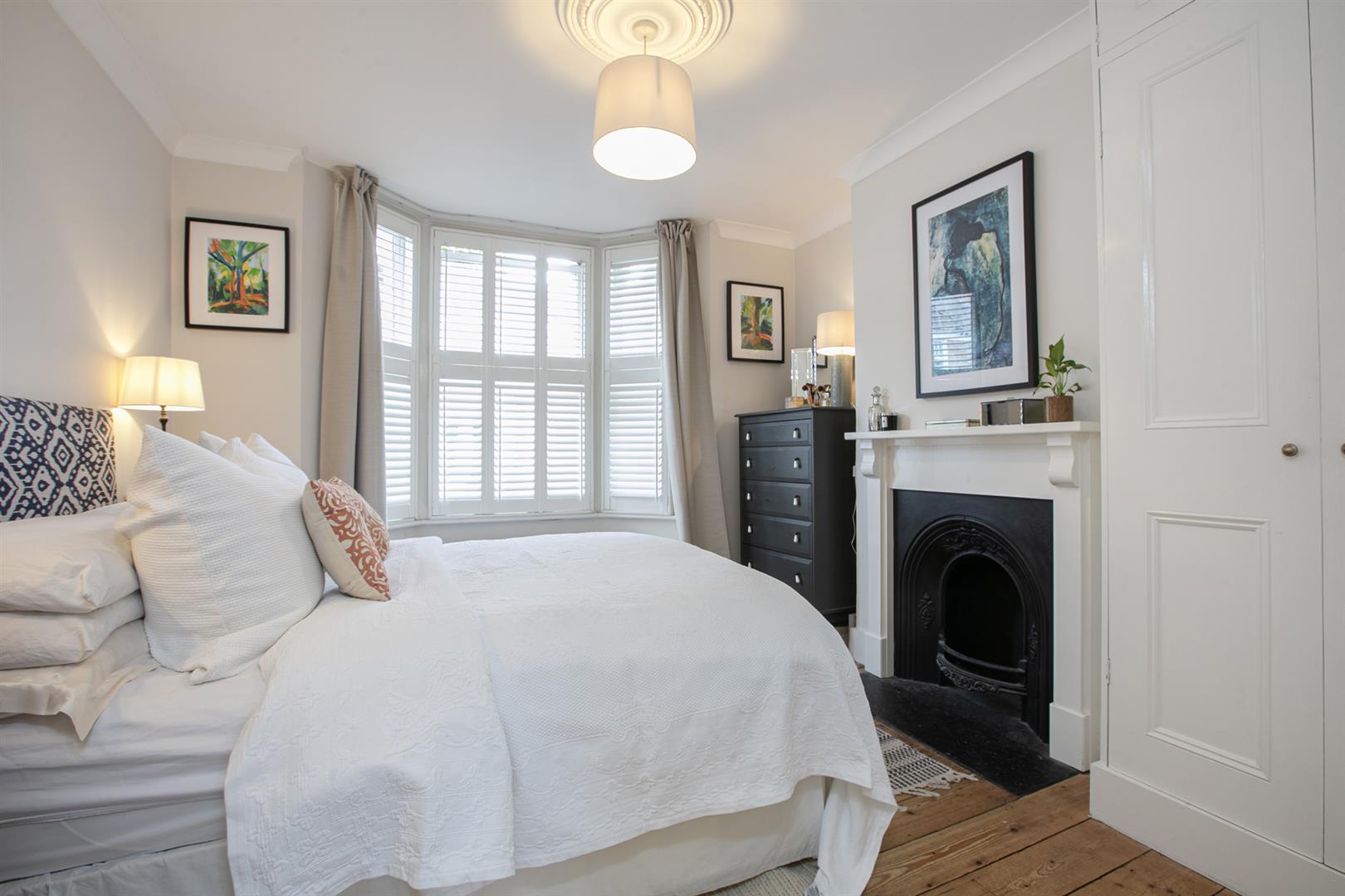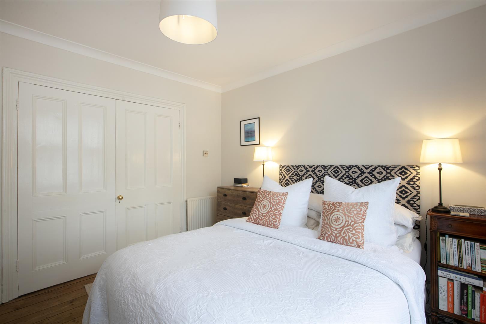 A shared front garden and communal hallway offers access inward where you enter directly into your bright and pleasant living space. It faces rear through a large original sash window. The period feature fireplace is flanked on either side by low level storage units. There's original stripped timbers underfoot and simple cornicing overhead. The double bedroom is accessed through original double doors and supplies a neat front bay window with plantation shutters. There's another period feature fireplace and more tasteful timbers. The decor throughout is freshly presented and tastefully neutral.
