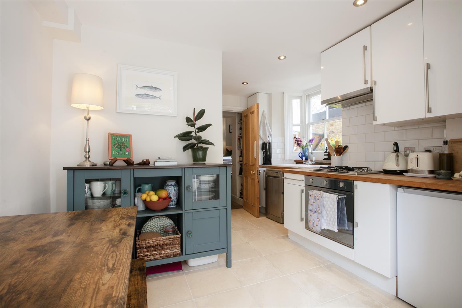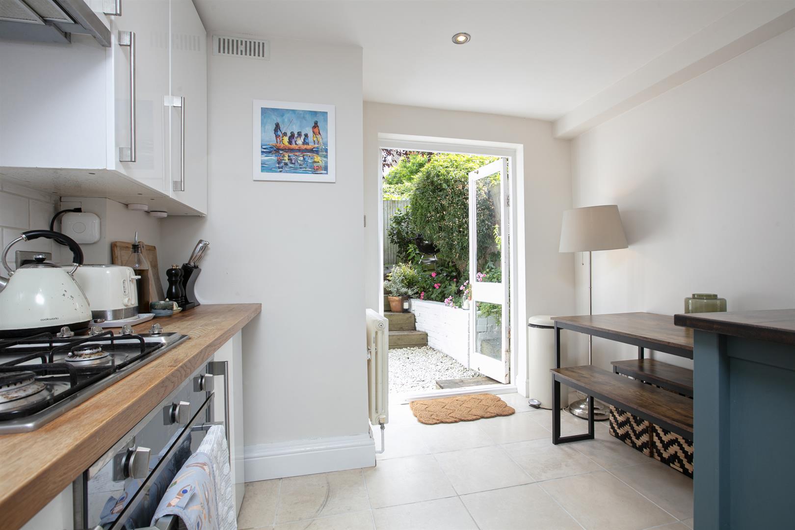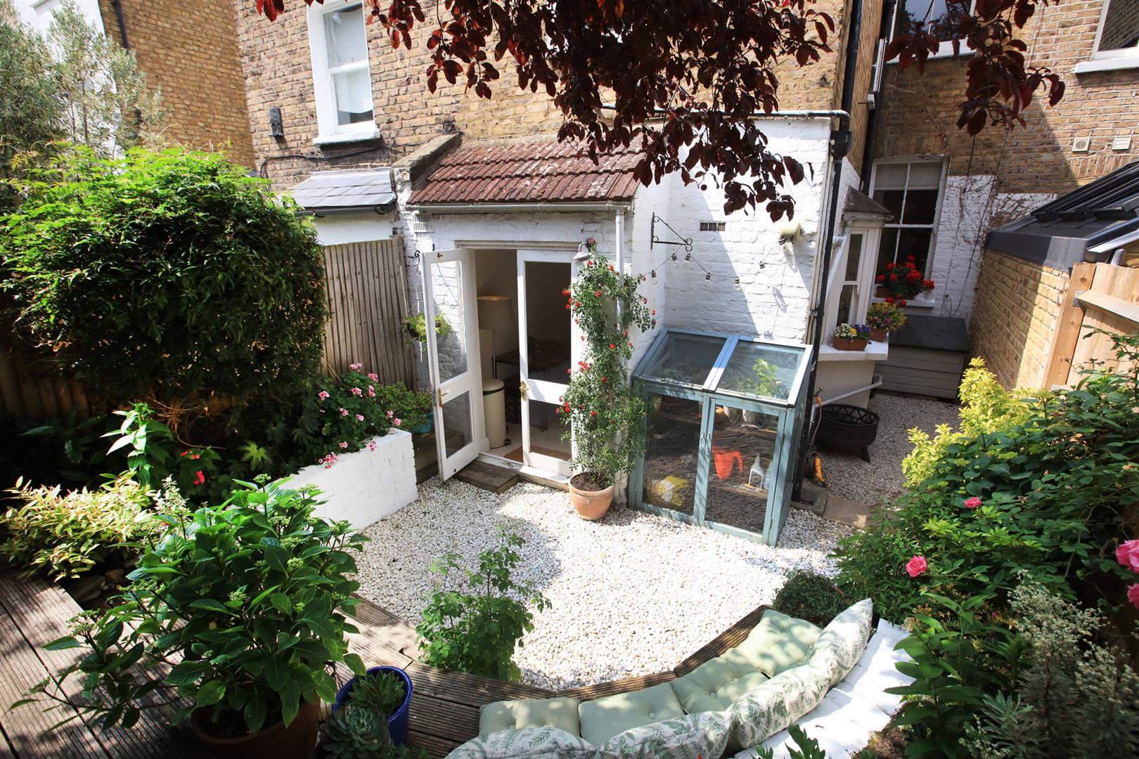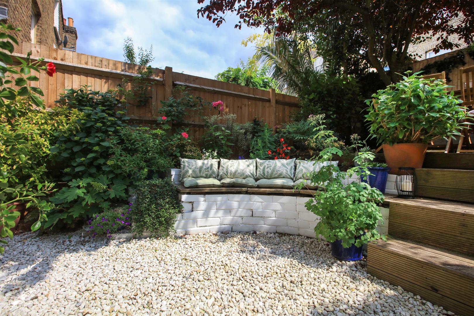 Steps lead downward from the reception, past full-height book shelving on either side, to the kitchen/diner. This space enjoys a cute side bay of double glazed sash windows, ceramic sink, solid wooden counters, four ring gas hob and oven. The bathroom adjoins and has a white suite, bath with overhead shower and door to the extended storage cellar. In addition to hosting all your beloved tatt it also supplies a laundry section with space and plumbing for the washing machine. The splendid split-level garden is accessed from the kitchen/diner through double glass doors. A gravel patio leads past some gorgeous integrated curved seating up curved decked steps to a raised decked patio. The space is awash with lush and fragrant posies, shrubs and plants.