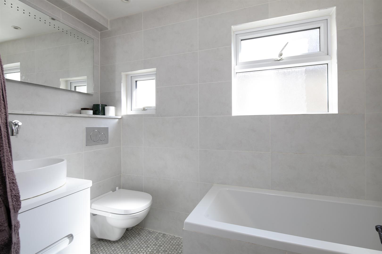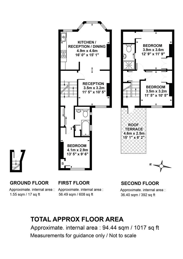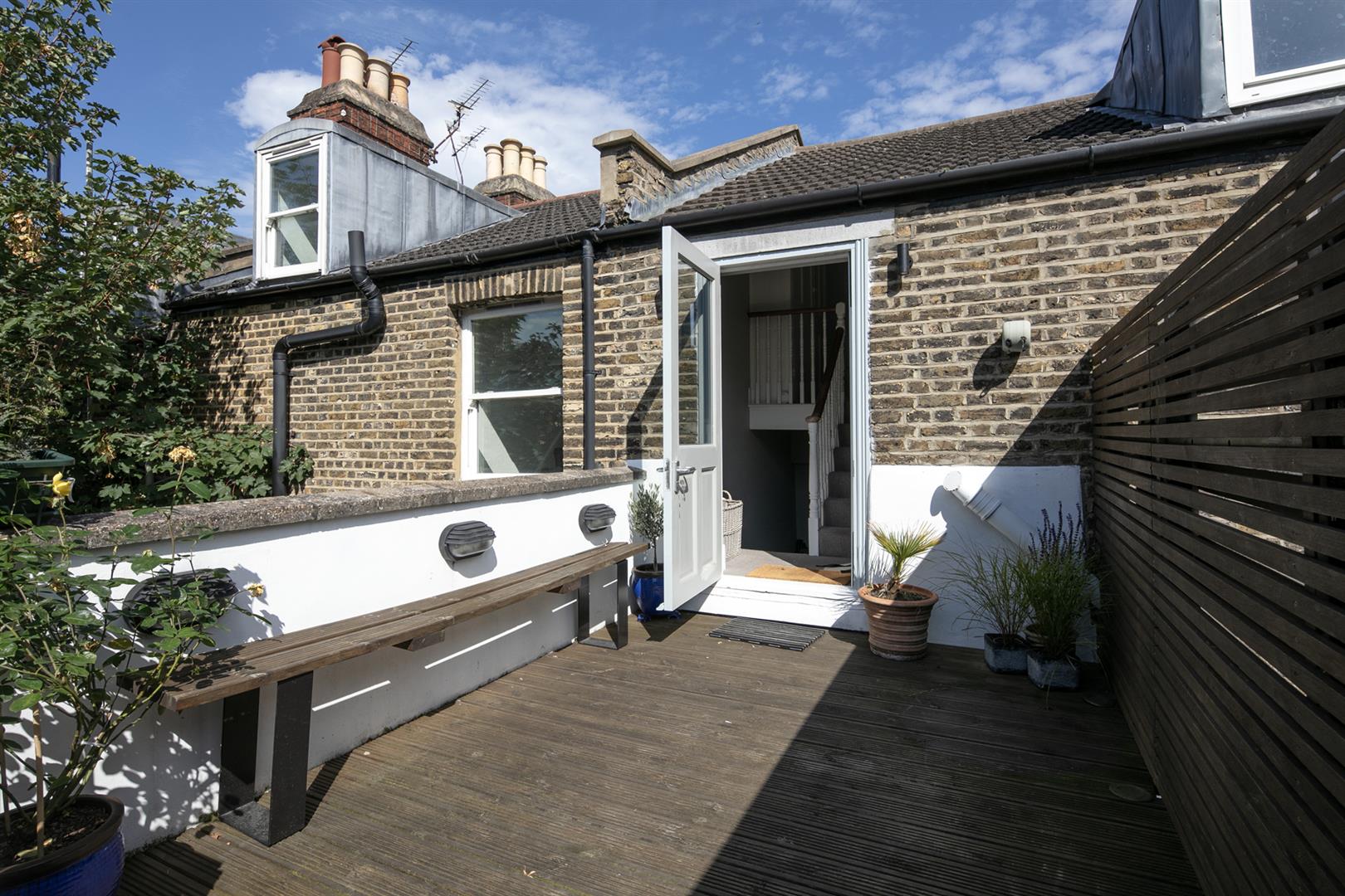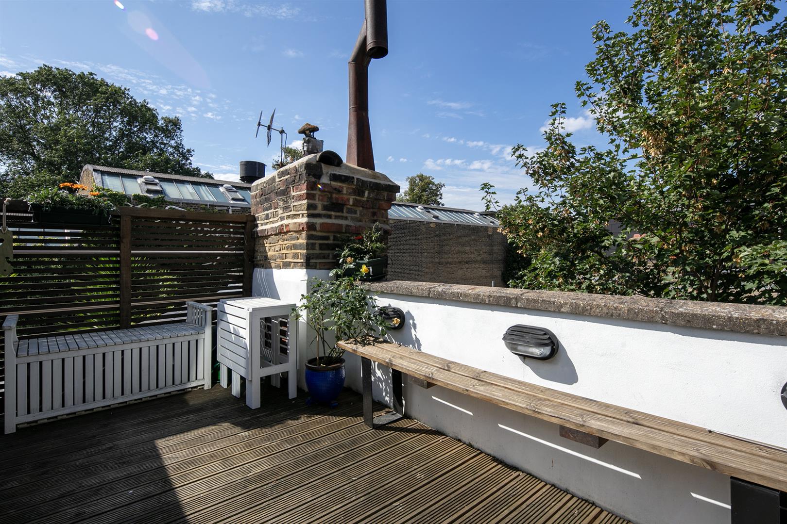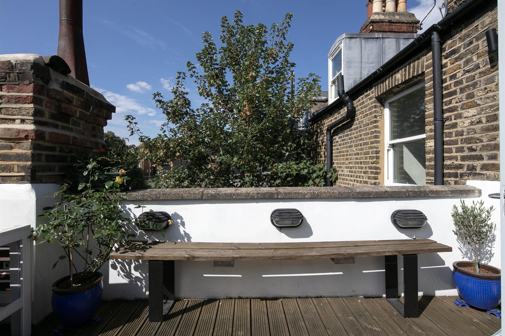 Enter through a shared garden and hallway where a ground floor hall leads upward. The first of your gorgeous double bedrooms faces rear with a peaceful leafy secluded aspect, fitted storage and the same quality carpeting that runs throughout the halls and landing. Your fully tiled bathroom sits next door with a contemporary suite, heated towel rail and bath with drencher. Generous storage units with sliding doors complete this level. Upward again you find that gloriously spacious living room taking the lion's share of the first floor. The kitchen sits to the front of the space next to a wide bay window. There's a five ring SMEG gas hob, double SMEG oven, integrated dishwasher and oodles of storage. The thick cut granite counters, triptych of brass lights and mirrored splash back finishes it perfectly. There's space to seat 8 comfortably and ample lounging space to the rear. Matching fireplaces each with elegant marble mantels will wow your guests yet further. Upward to the second return you find access to the fantastic westerly facing decked terrace which enjoys a really charming rooftop London view. Your second floor landing has more storage and leads to the front facing master bedroom. This has two separate storage cupboards and an adjoining ensuite with double walk-in shower, heated towel rail and white suite continuing the charm offensive. The tour is finished nicely with a delightfully peaceful rear facing double bedroom.