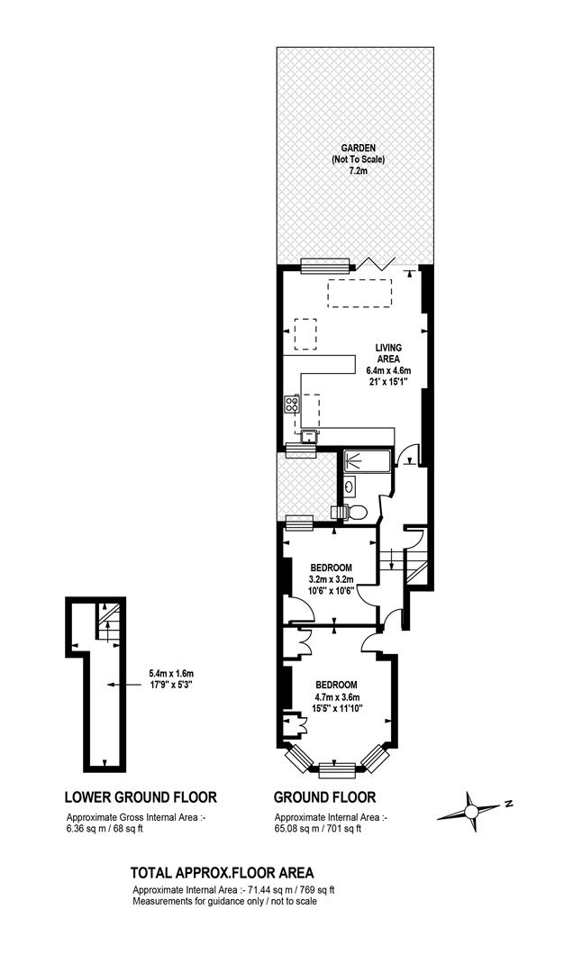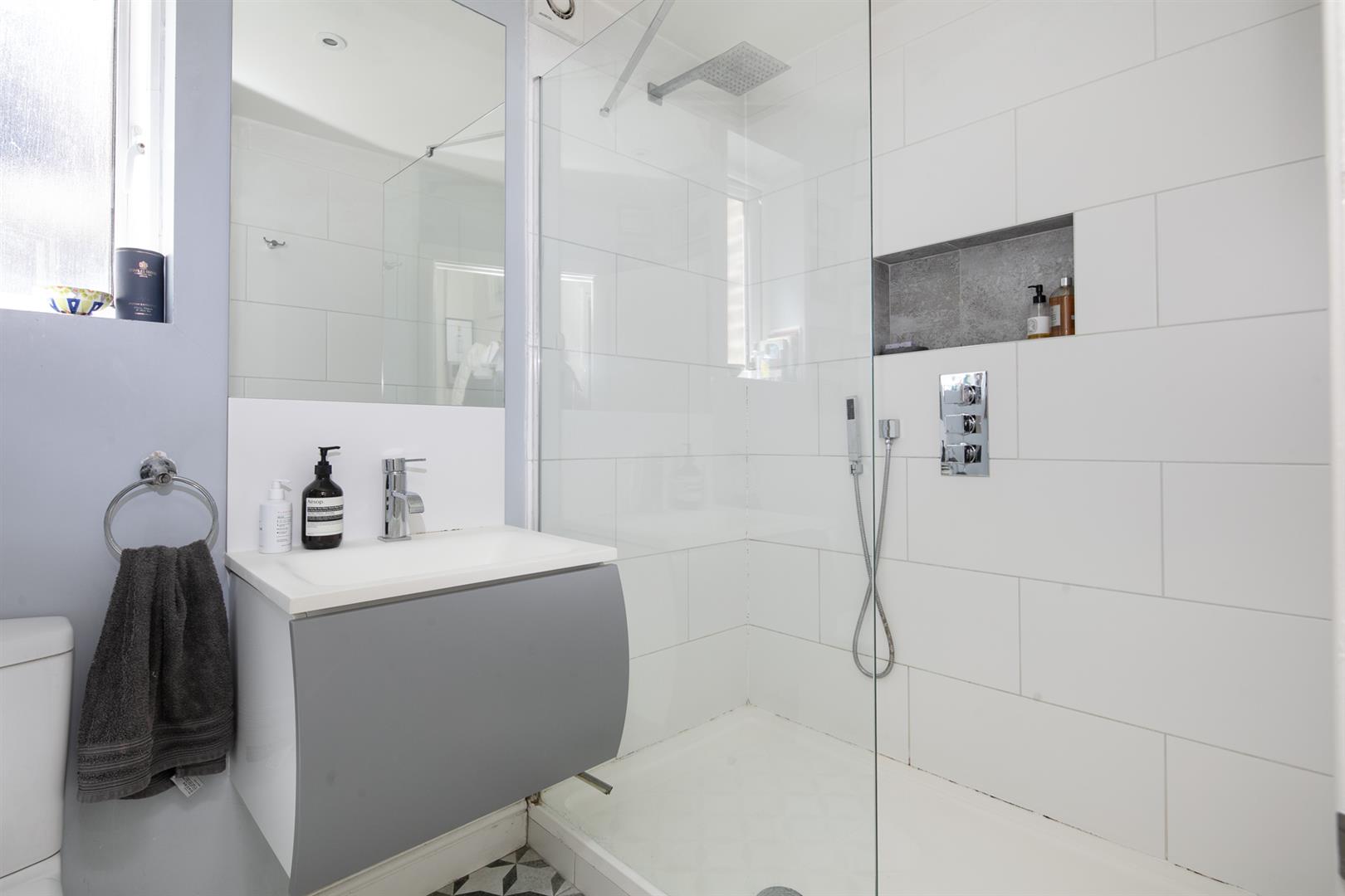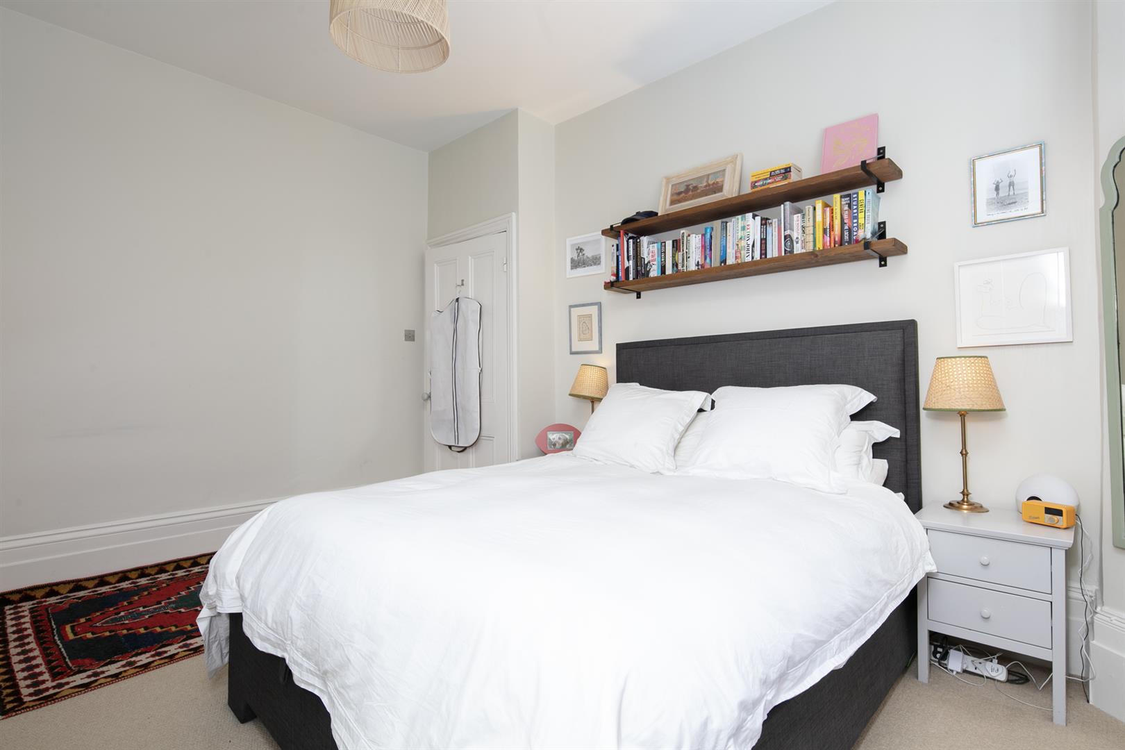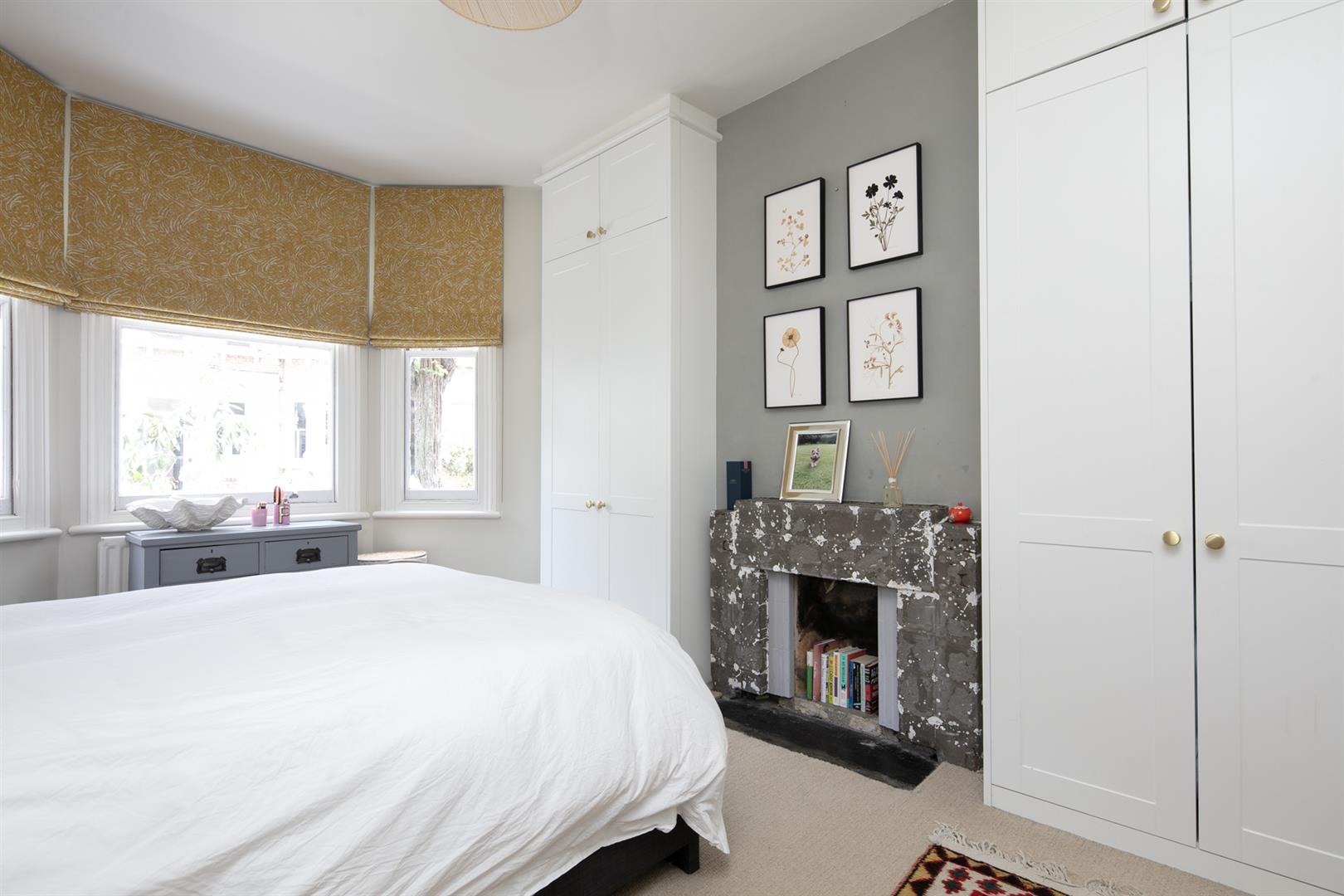 Enter through a smart shared front garden with raised planter and neat bin storage. Contemporary tiling leads you to a recessed portico and into your shared hall. The flat is entered to the left where you meet crisp neutral walls and wood flooring. The first of the double bedrooms is bright and spacious with high ceilings, a front aspect bay window and feature fireplace. Tall bespoke wardrobes help keep things spic and span. The second double bedroom has a peaceful rear aspect, more fitted storage and a statement blue feature wall. A few steps descend downward via the hall to meet your super slick shower room which dons a modern suite, side aspect casement window and double walk in shower. A door opposite the shower room leads down to the storage cellar where you'll keep the burgeoning wine collection!