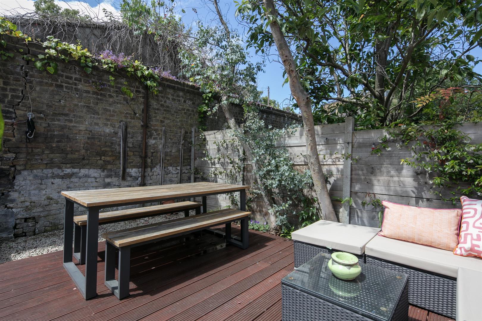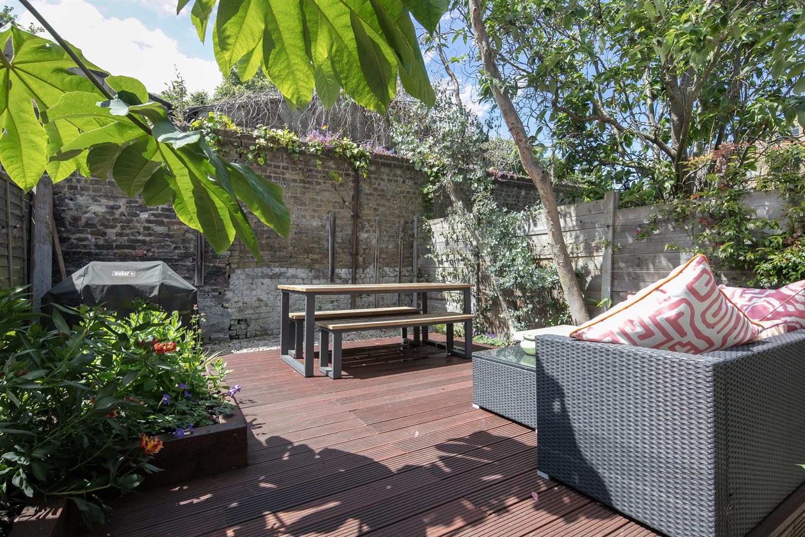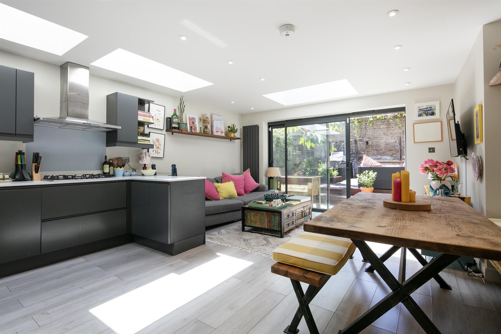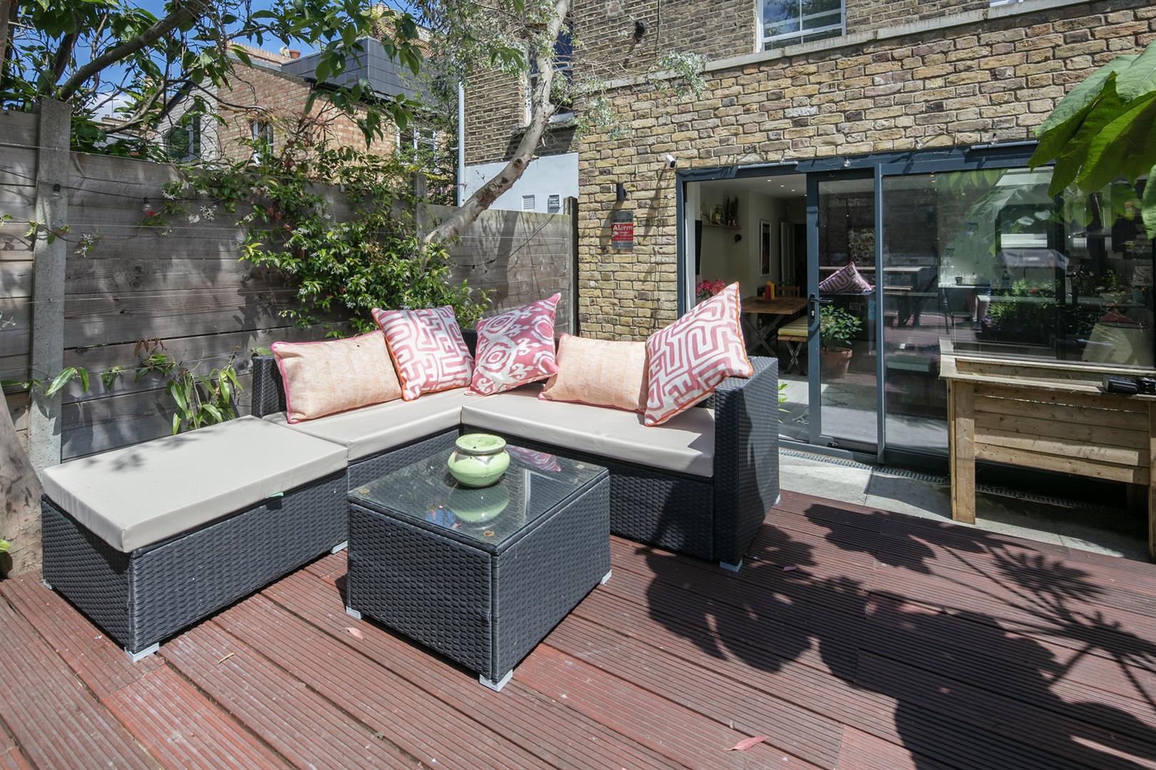 Saving the very best for last, your next encounter is an utterly fabulous living space which opens, via wide sliding glass doors, to the sunny garden. Three separate skylights invite a flood of daylight - it positively sparkles with airiness. The kitchen boasts some lovely Quartz counters over charcoal grey cabinets. Appliances include fridge/freezer, oven, integrated dishwasher and a five ring gas hob. The garden is split level with a paved patio and raised decked seating area. There's a large planter and abundant space for sun-baking and entertaining.
