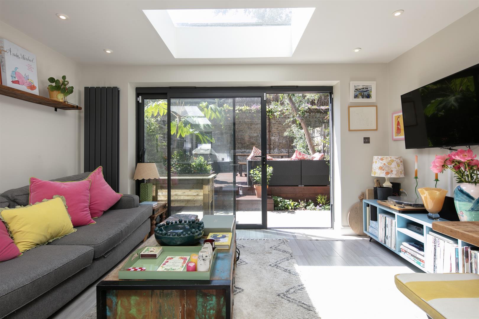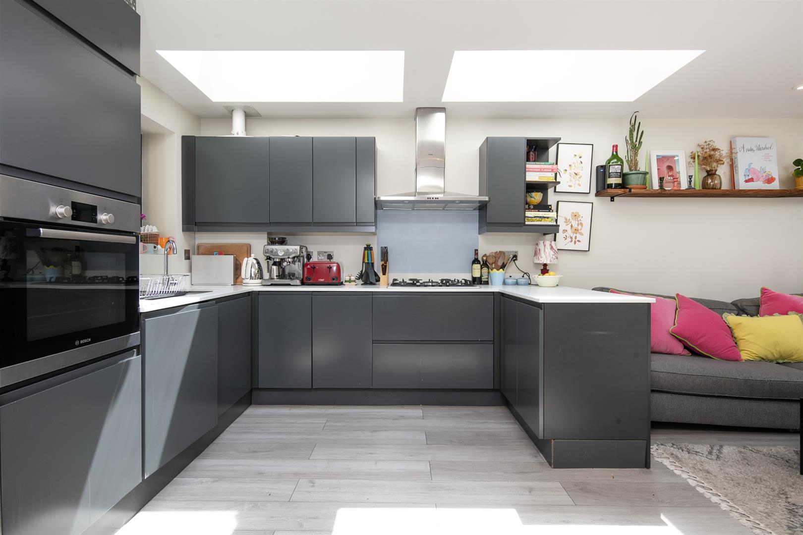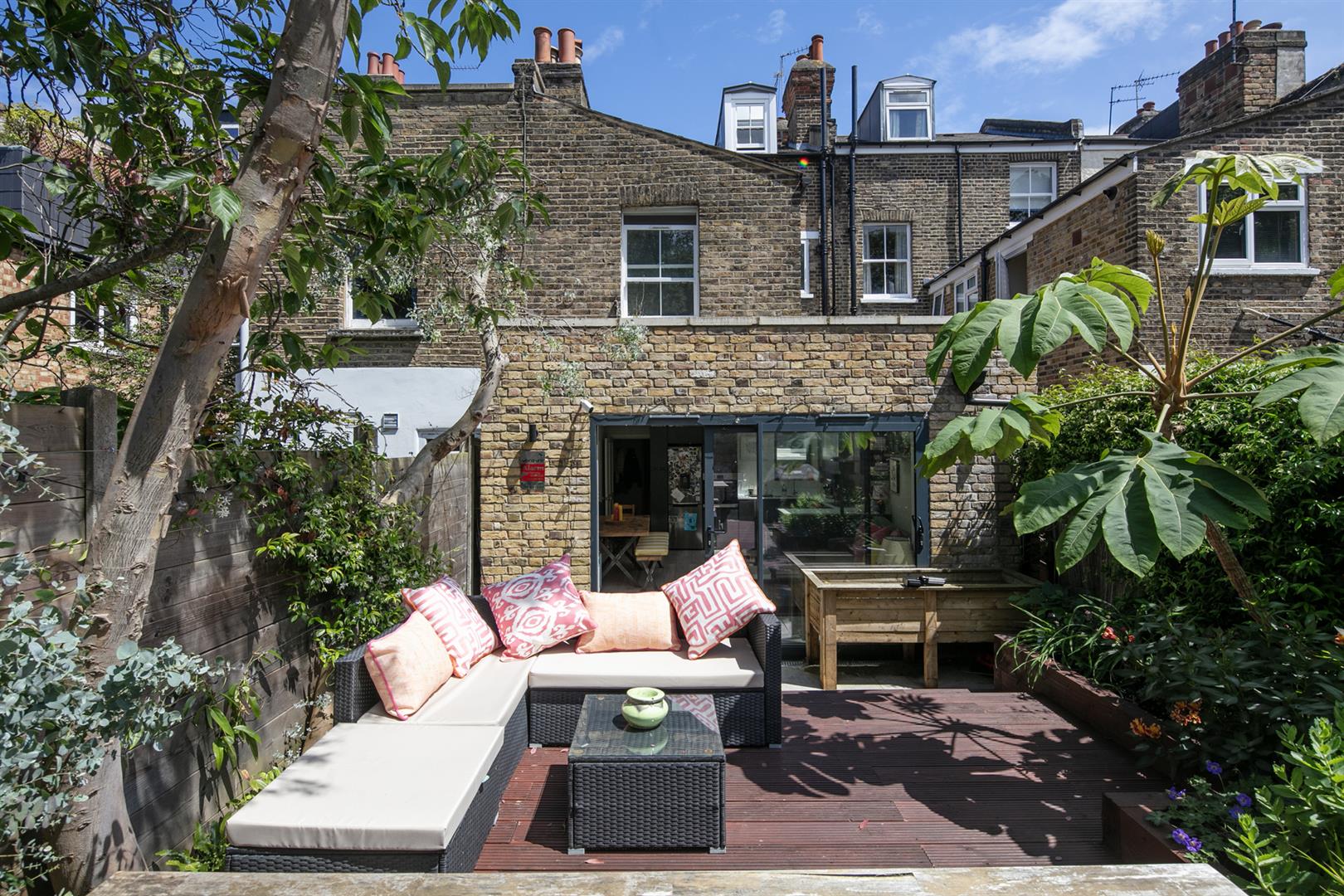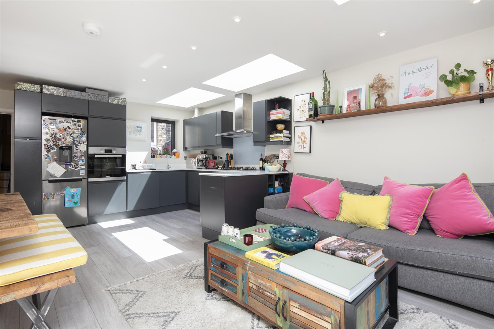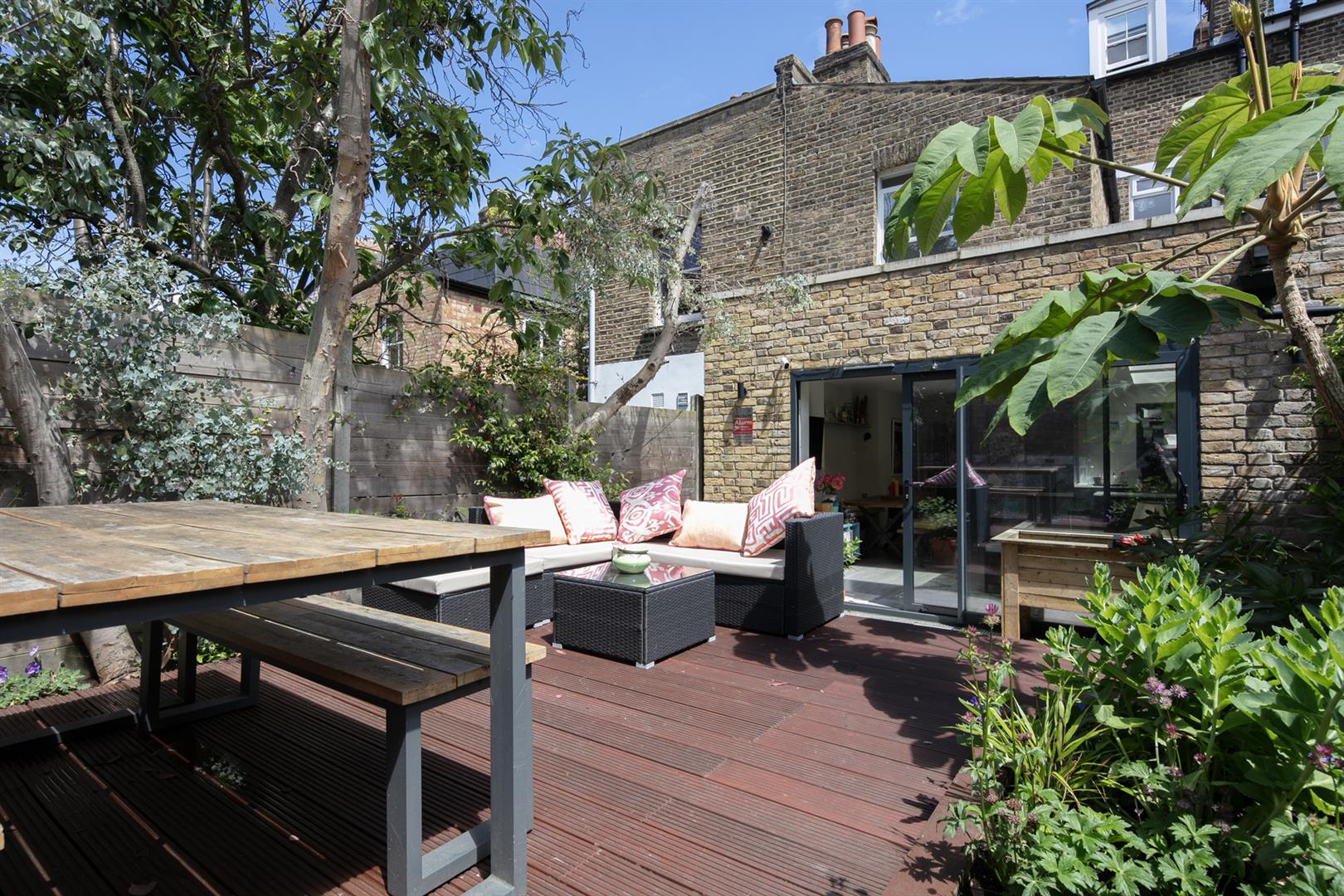 Saving the very best for last, your next encounter is an utterly fabulous living space which opens, via wide sliding glass doors, to the sunny garden. Three separate skylights invite a flood of daylight - it positively sparkles with airiness. The kitchen boasts some lovely Quartz counters over charcoal grey cabinets. Appliances include fridge/freezer, oven, integrated dishwasher and a five ring gas hob. The garden is split level with a paved patio and raised decked seating area. There's a large planter and abundant space for sun-baking and entertaining.