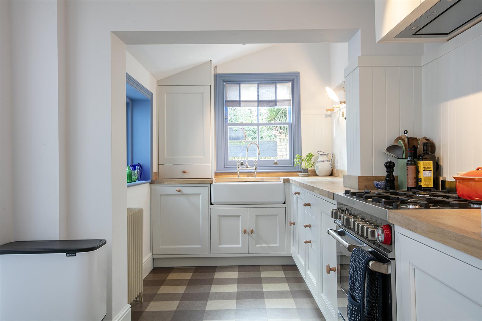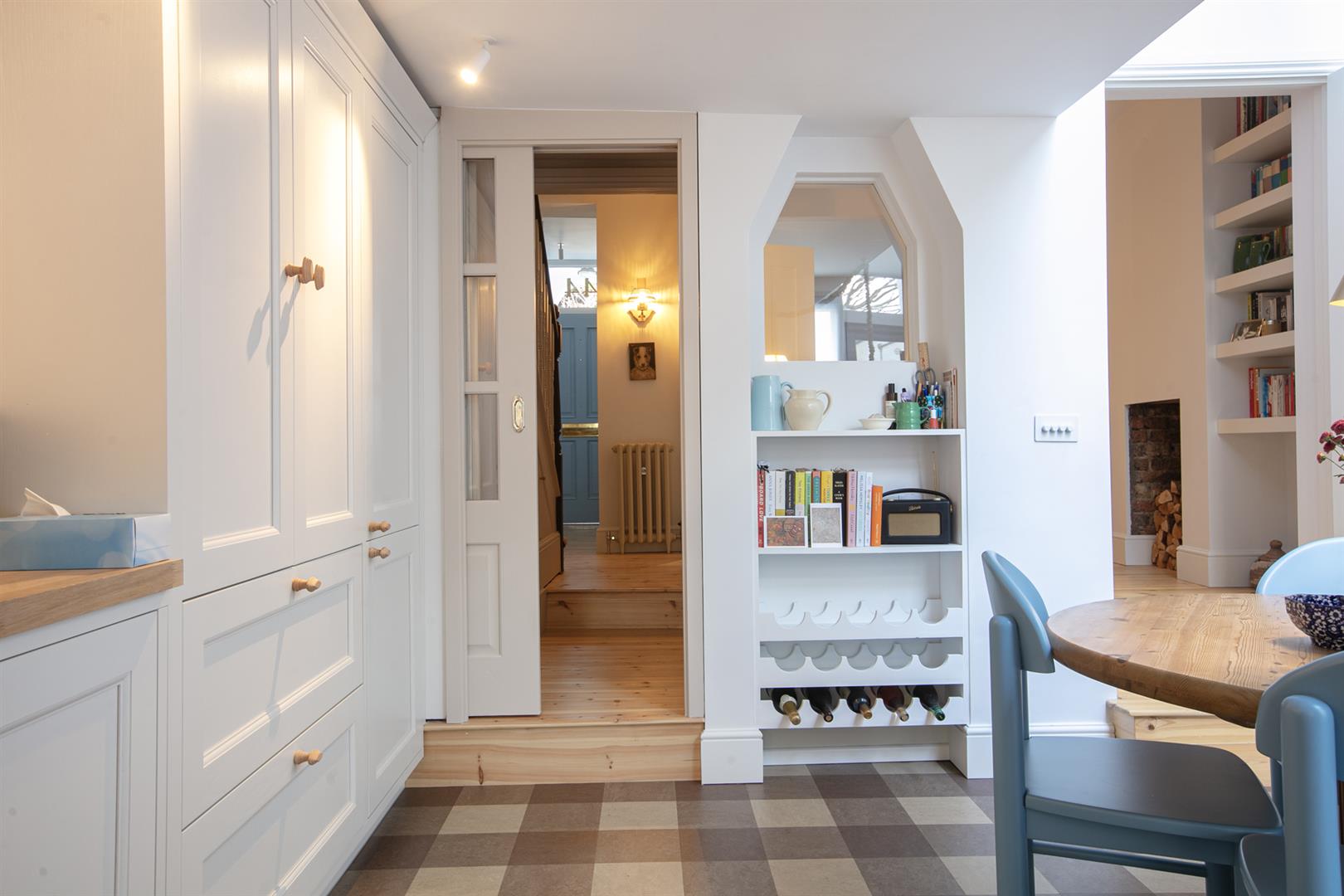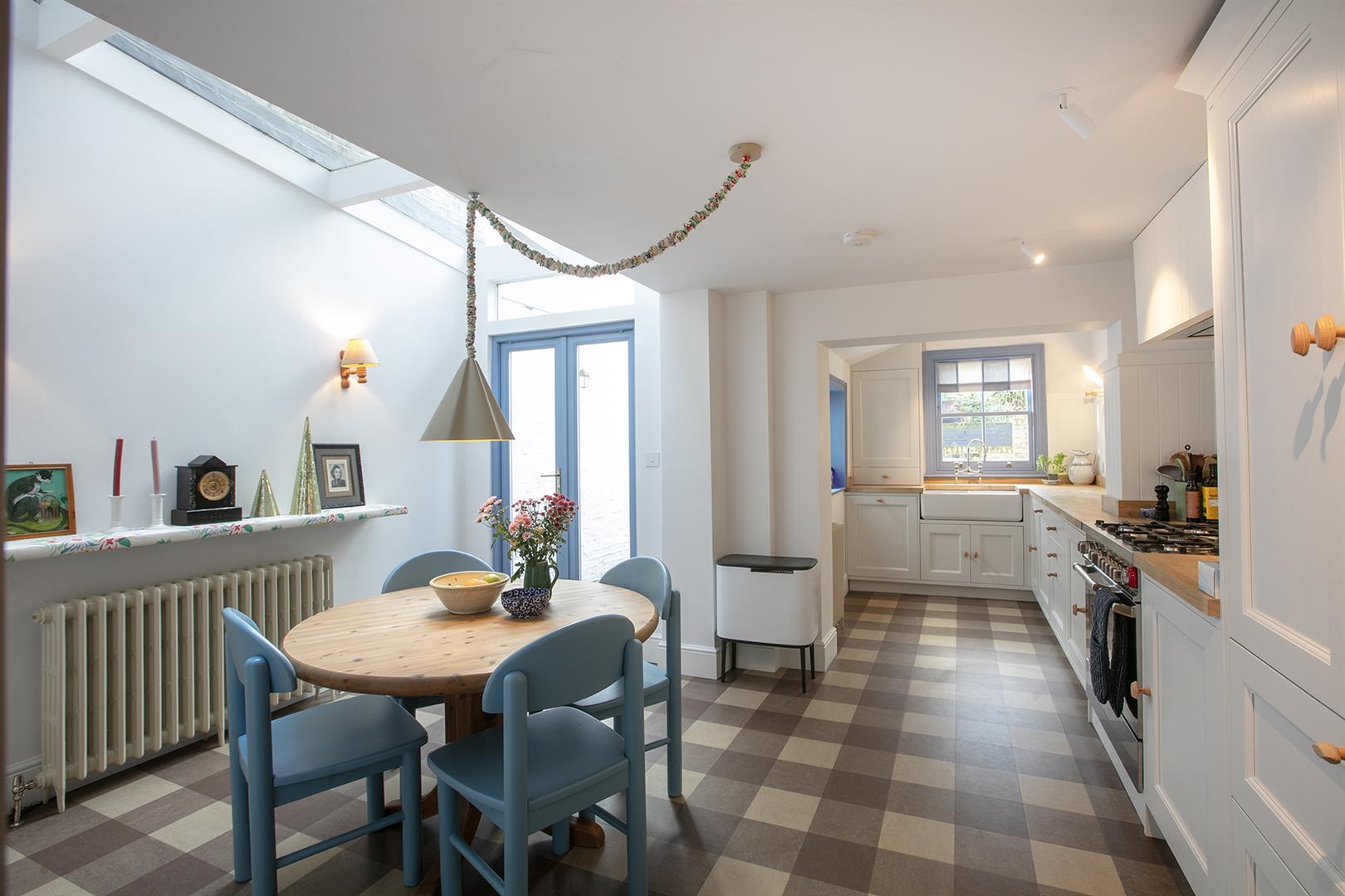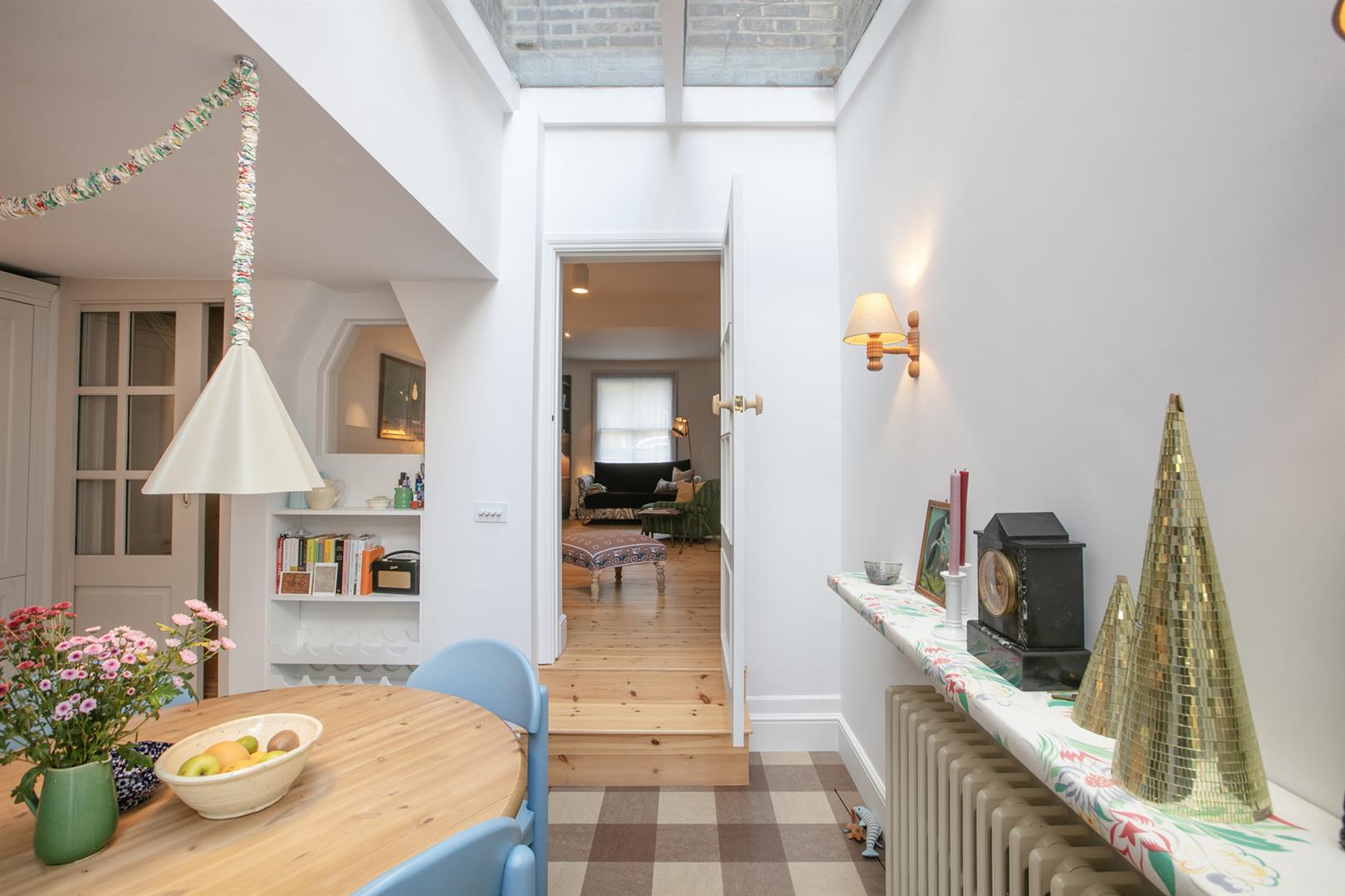 A pretty glass door opens rear and down two steps to your gorgeous kitchen/diner which peeks back into the reception through a most charming recessed bespoke picture window. There's more integrated shelving and some wine storage sitting below this. The dining area stretches to full width and sits under a vaulted glass ceiling for maximum airiness. Solid wooden counters run confidently into an L along the far wall atop lovely country-style cabinets. Appliances include an integrated dishwasher, washing machine and fridge freezer. Twin ceramic butler sinks and raised wooden wall panelling finish the space nicely. Polite doors open from the dining area to a paved patio and onto a pretty garden with Astro turf and mature tree.