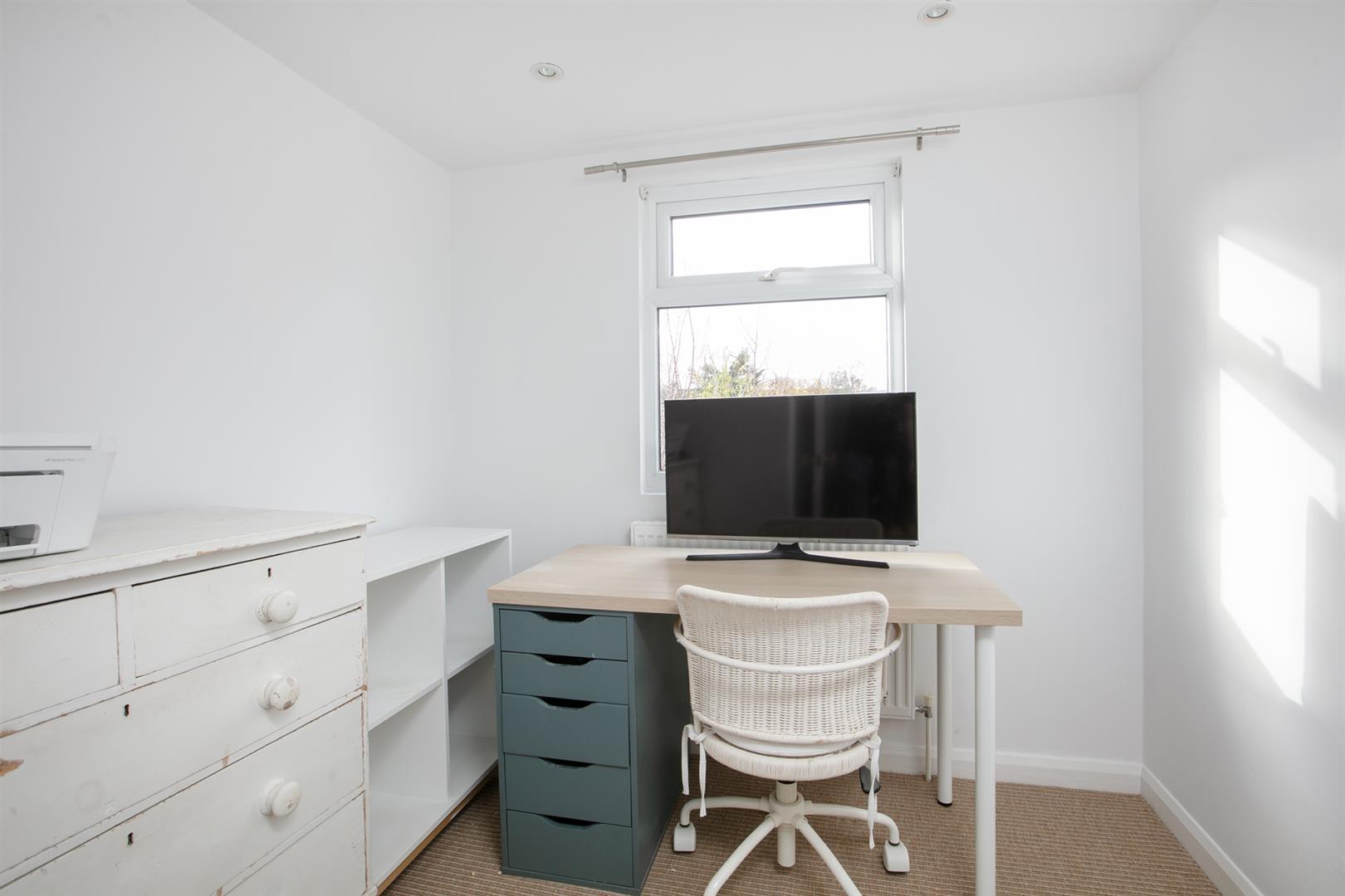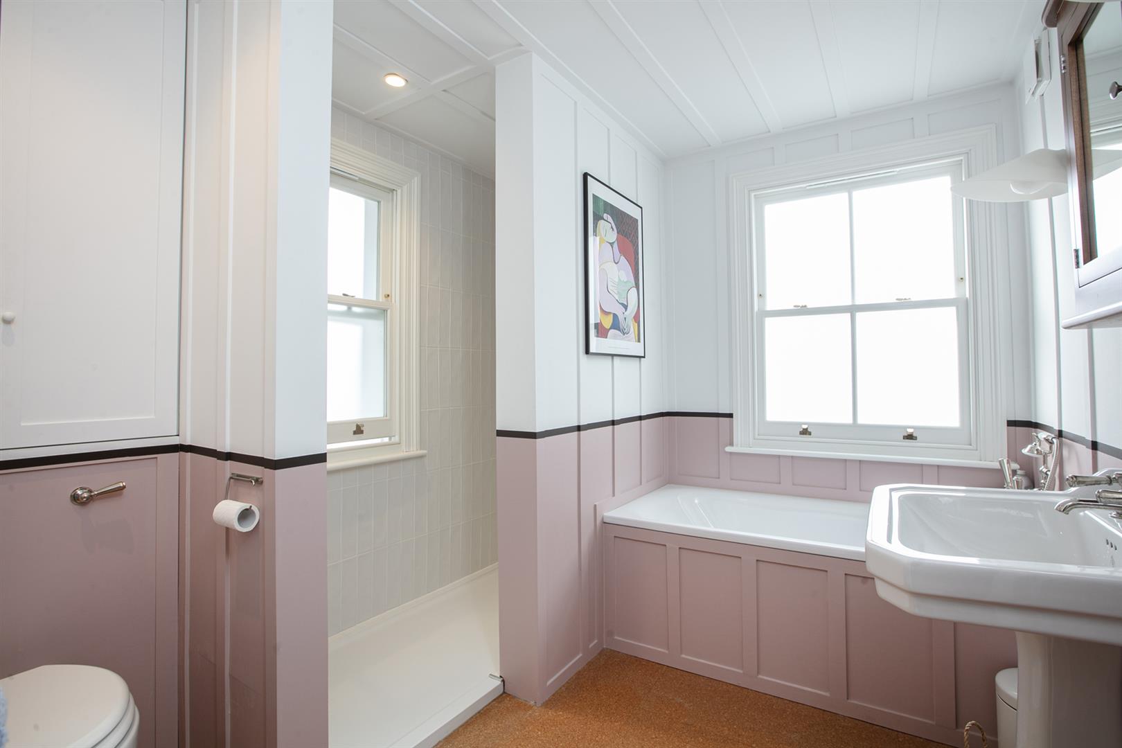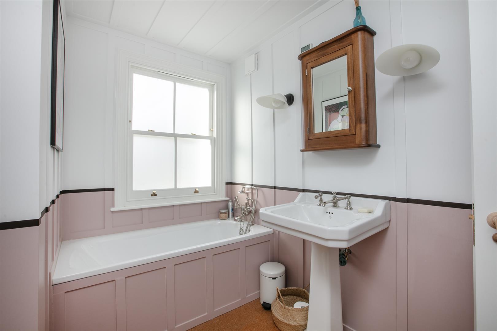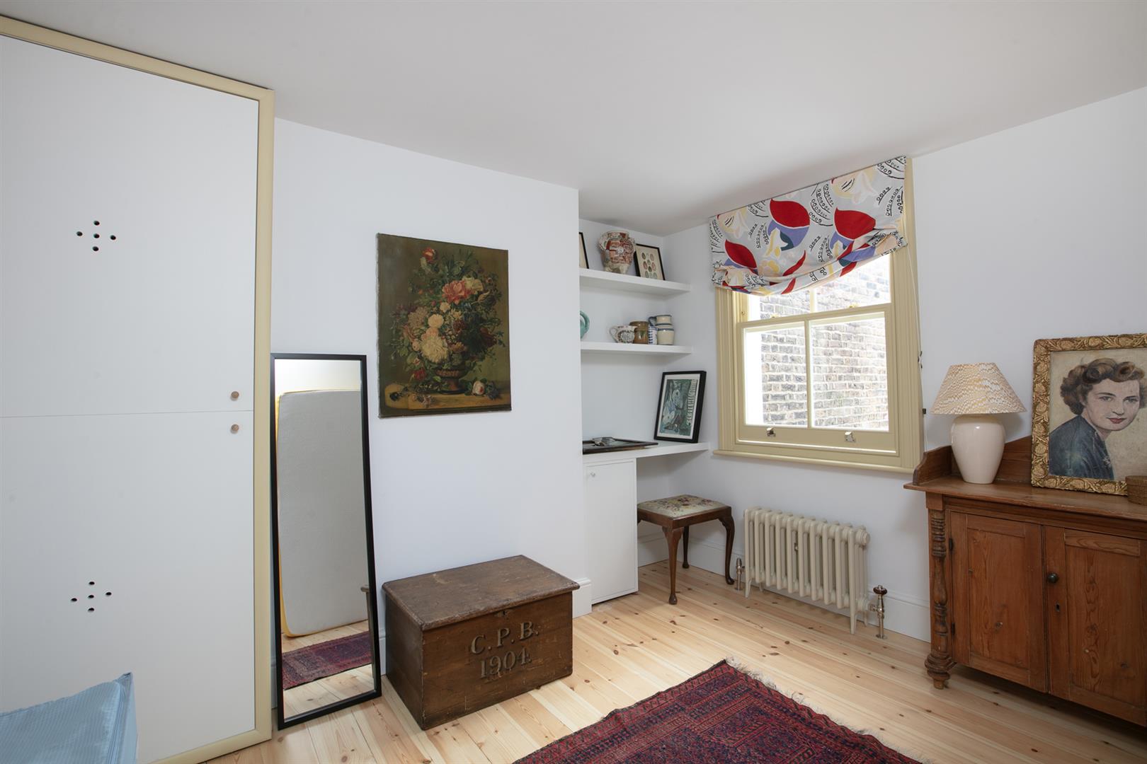 Heading upward you meet a bright and beautifully arranged family bathroom on the rear return. Attractions include cool cork flooring, double walk-in shower, bath, loo and period style wash hand basin. The walls boast more amazing wooden detail - this time with complimentary paint shades separated at dado level. A handy laundry cupboard sits next to the bathroom and is accessed off the return. The first floor hosts a large front-facing double bedroom with two substantial sash windows supplying sweeping park views. A wall of fitted storage and nifty recessed shelving continue the charm offensive. Bedroom two completes this level with more storage and a peaceful rear aspect. Upward to the second floor you find a pretty rear-facing bedroom which is currently laid out as a comfortable study. A handy guest wc with retro wallpaper and funky blue suite precedes the fourth and final bedroom. It's a large and lofty split-level double with low level storage units and tonnes of light.