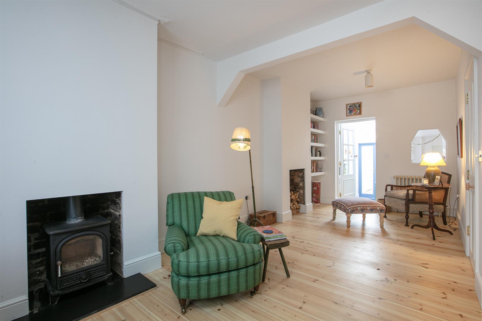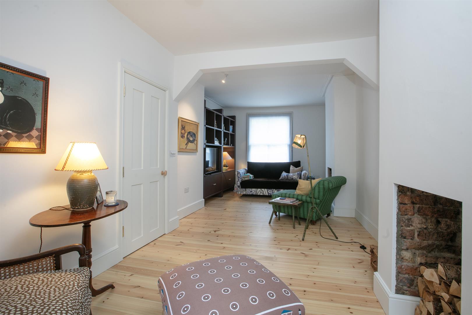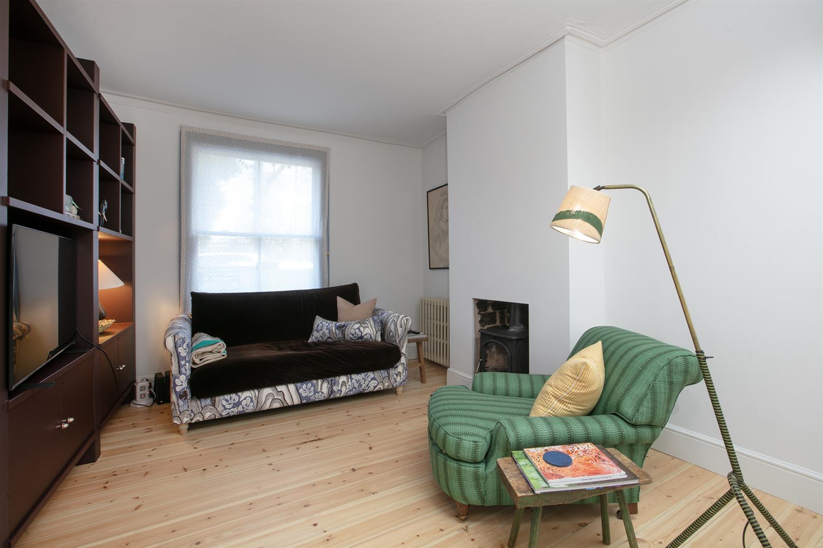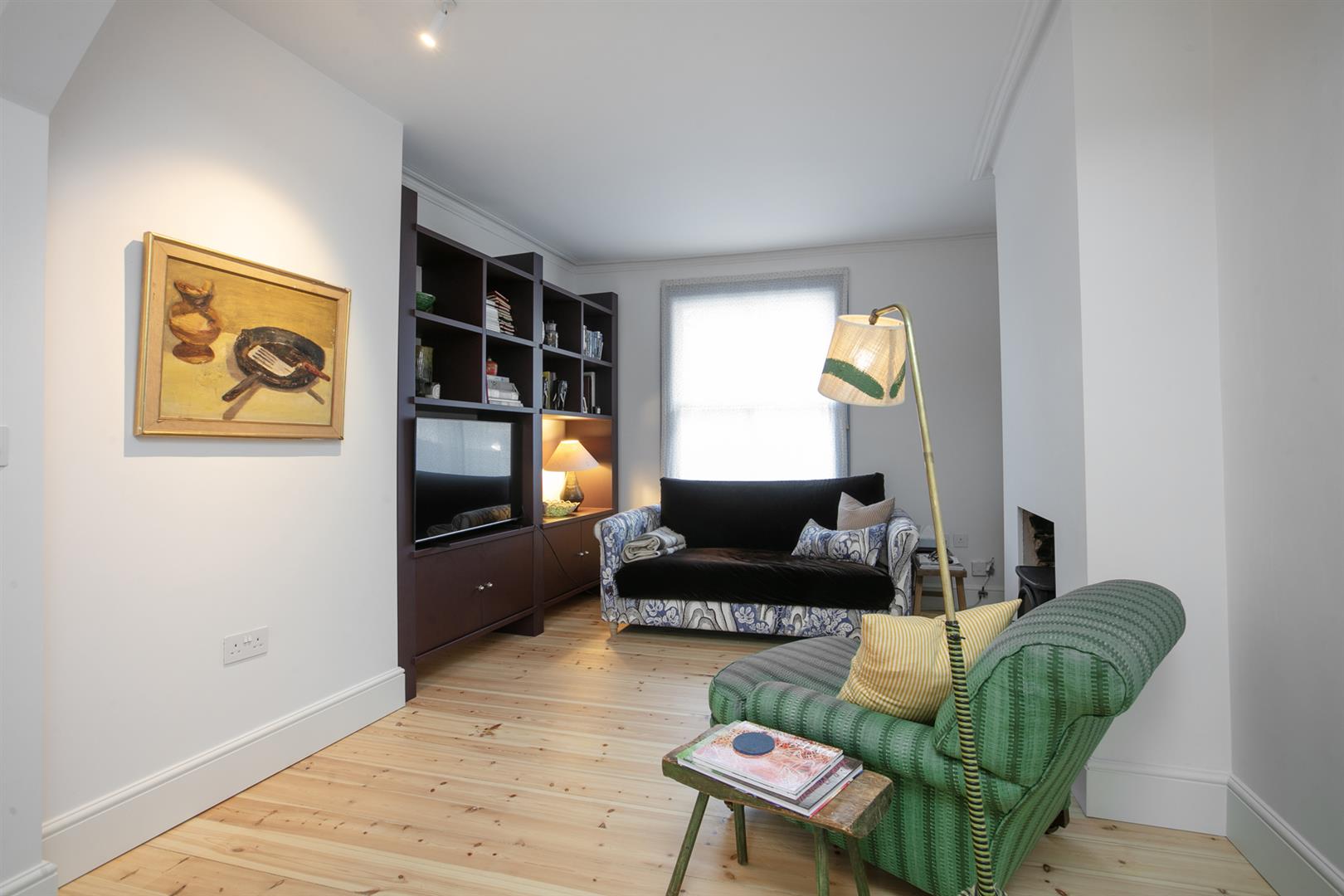 An arched recessed portico leads to your period door. This opens to a welcoming hallway with recessed storage and high ceilings. Horizontal wooden flooring continues forth to the double reception which faces front to enjoy the first of your park views. A cast iron wood burner sits handsomely on the right wall next to a period school house radiator. The rear of the space has a feature alcove and integrated shelving.