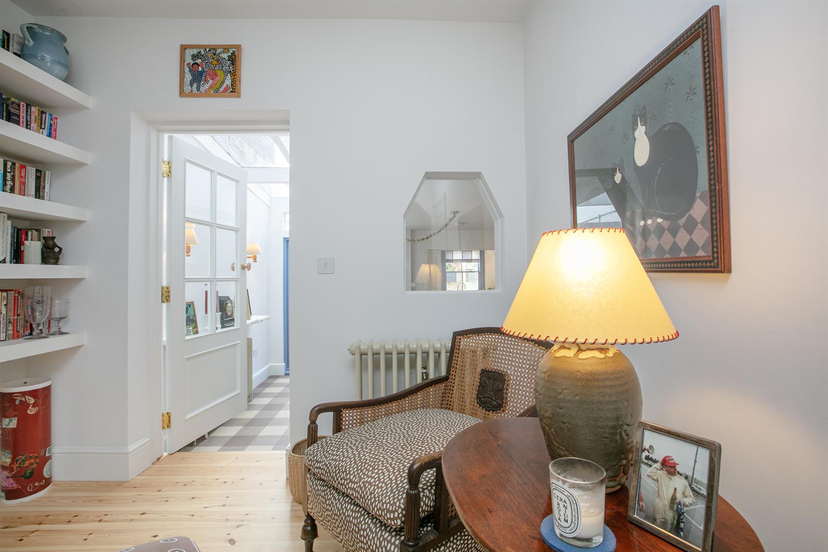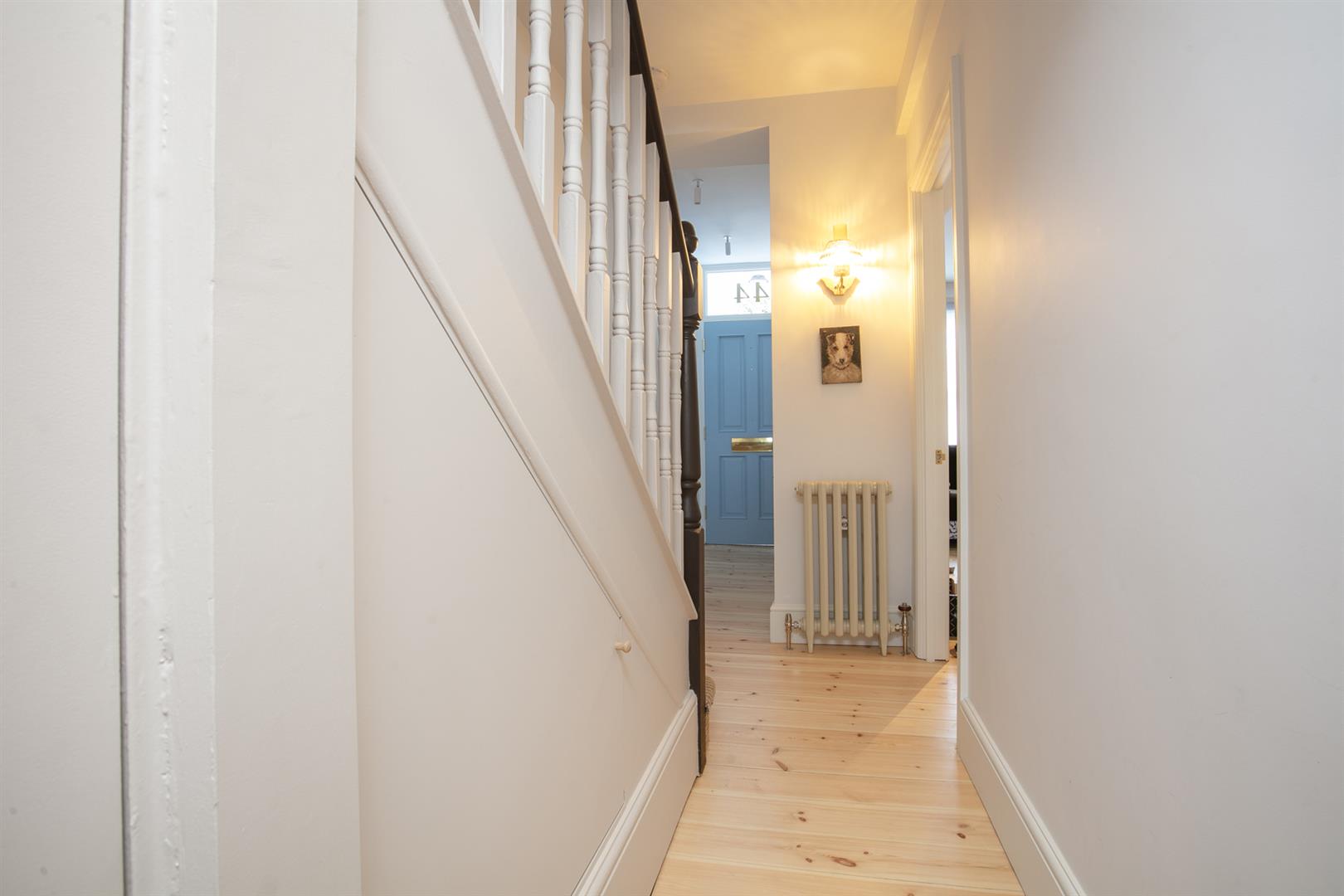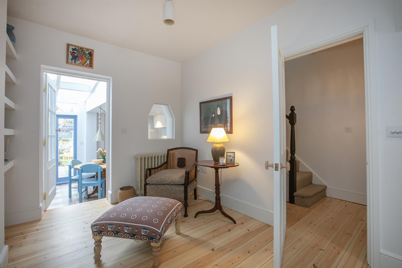 An arched recessed portico leads to your period door. This opens to a welcoming hallway with recessed storage and high ceilings. Horizontal wooden flooring continues forth to the double reception which faces front to enjoy the first of your park views. A cast iron wood burner sits handsomely on the right wall next to a period school house radiator. The rear of the space has a feature alcove and integrated shelving.