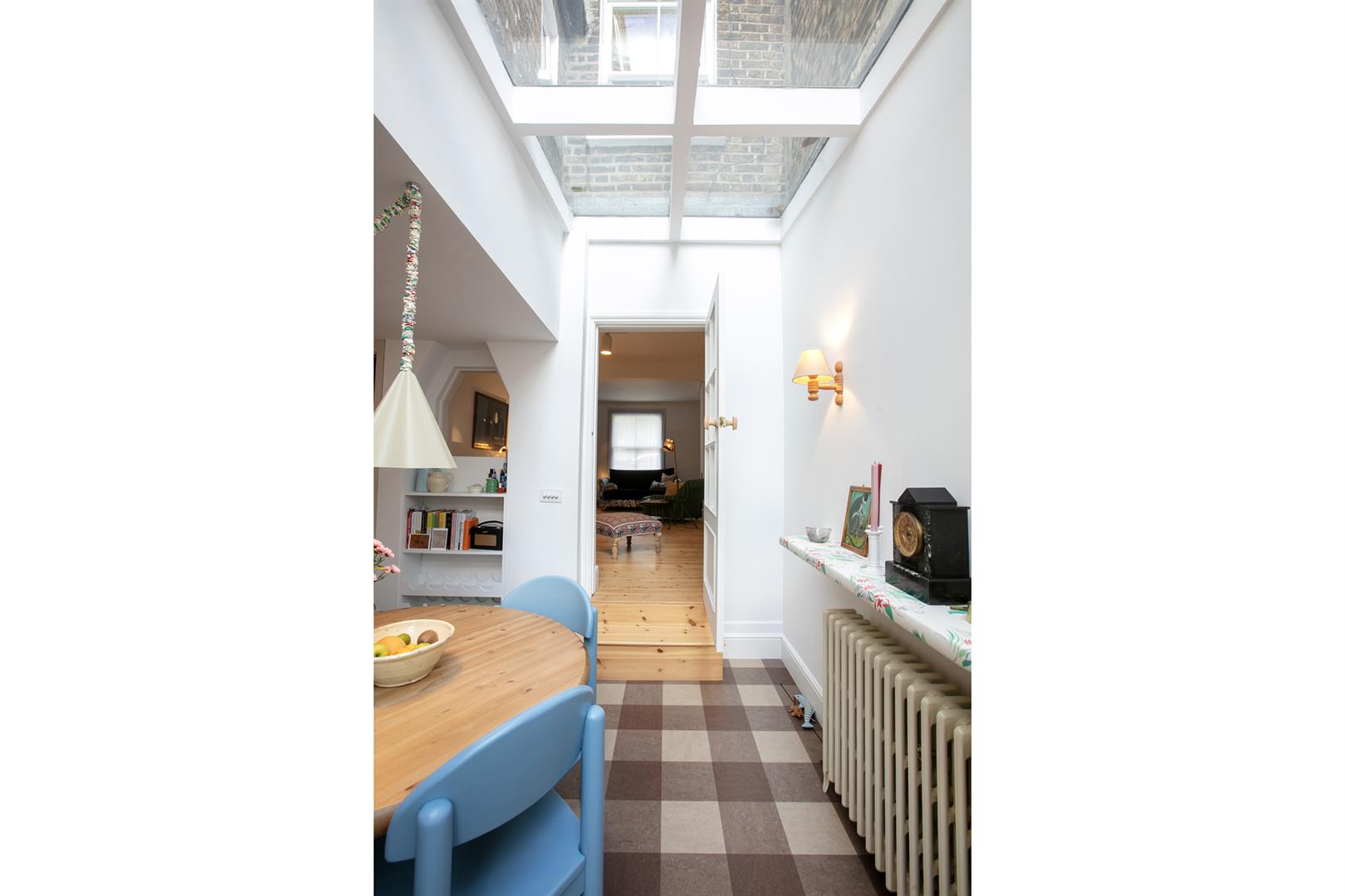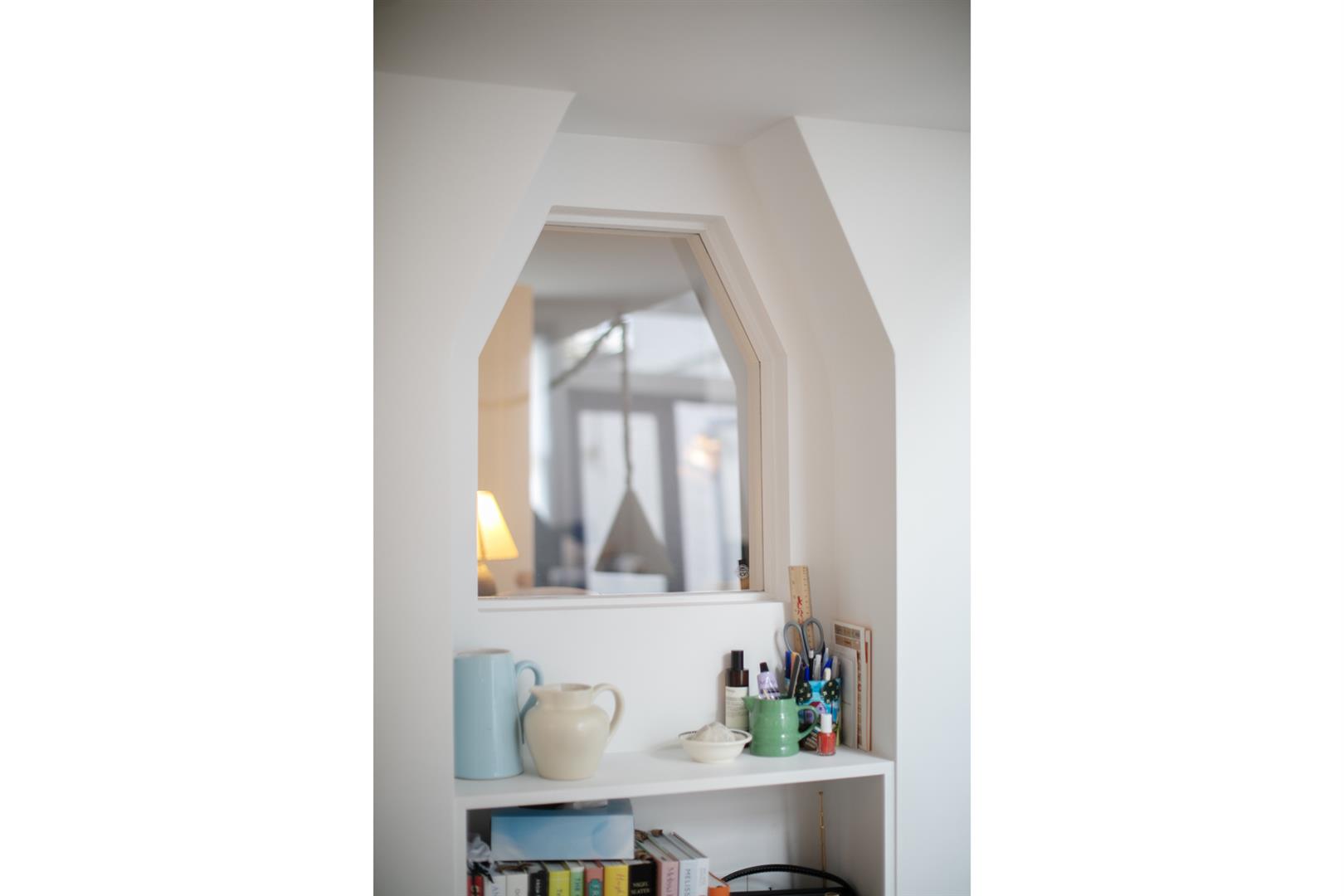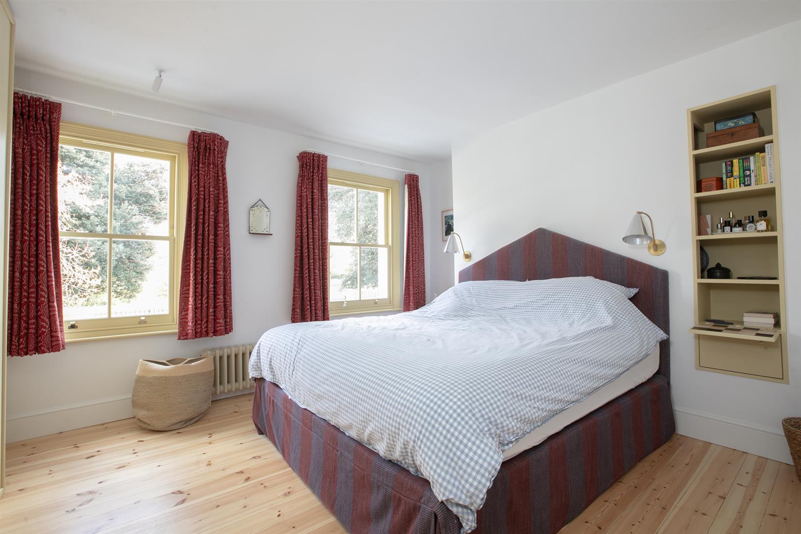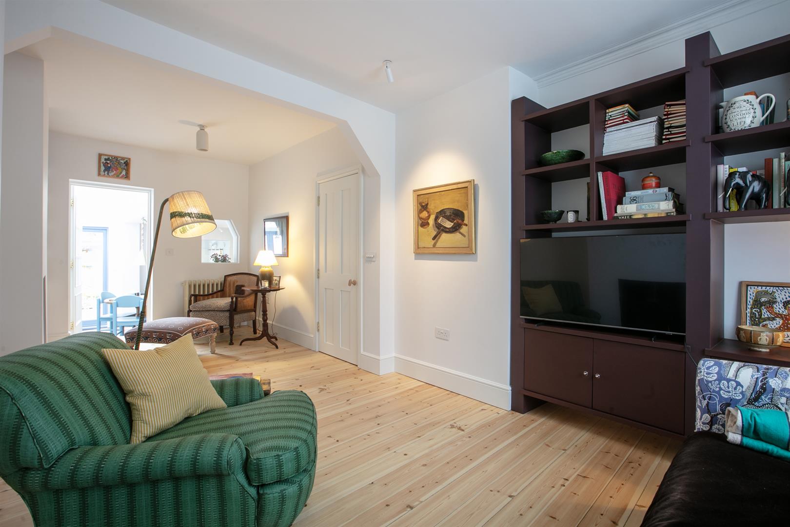 An arched recessed portico leads to your period door. This opens to a welcoming hallway with recessed storage and high ceilings. Horizontal wooden flooring continues forth to the double reception which faces front to enjoy the first of your park views. A cast iron wood burner sits handsomely on the right wall next to a period school house radiator. The rear of the space has a feature alcove and integrated shelving.